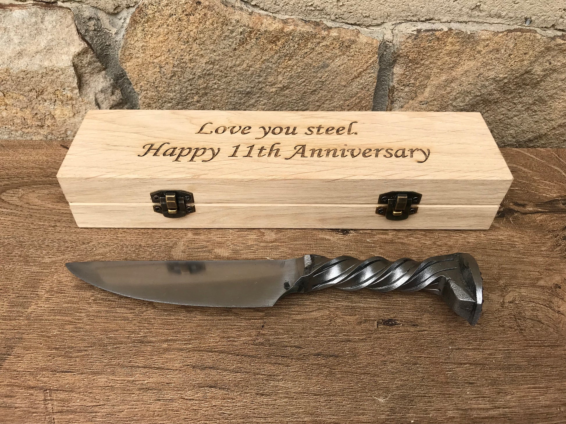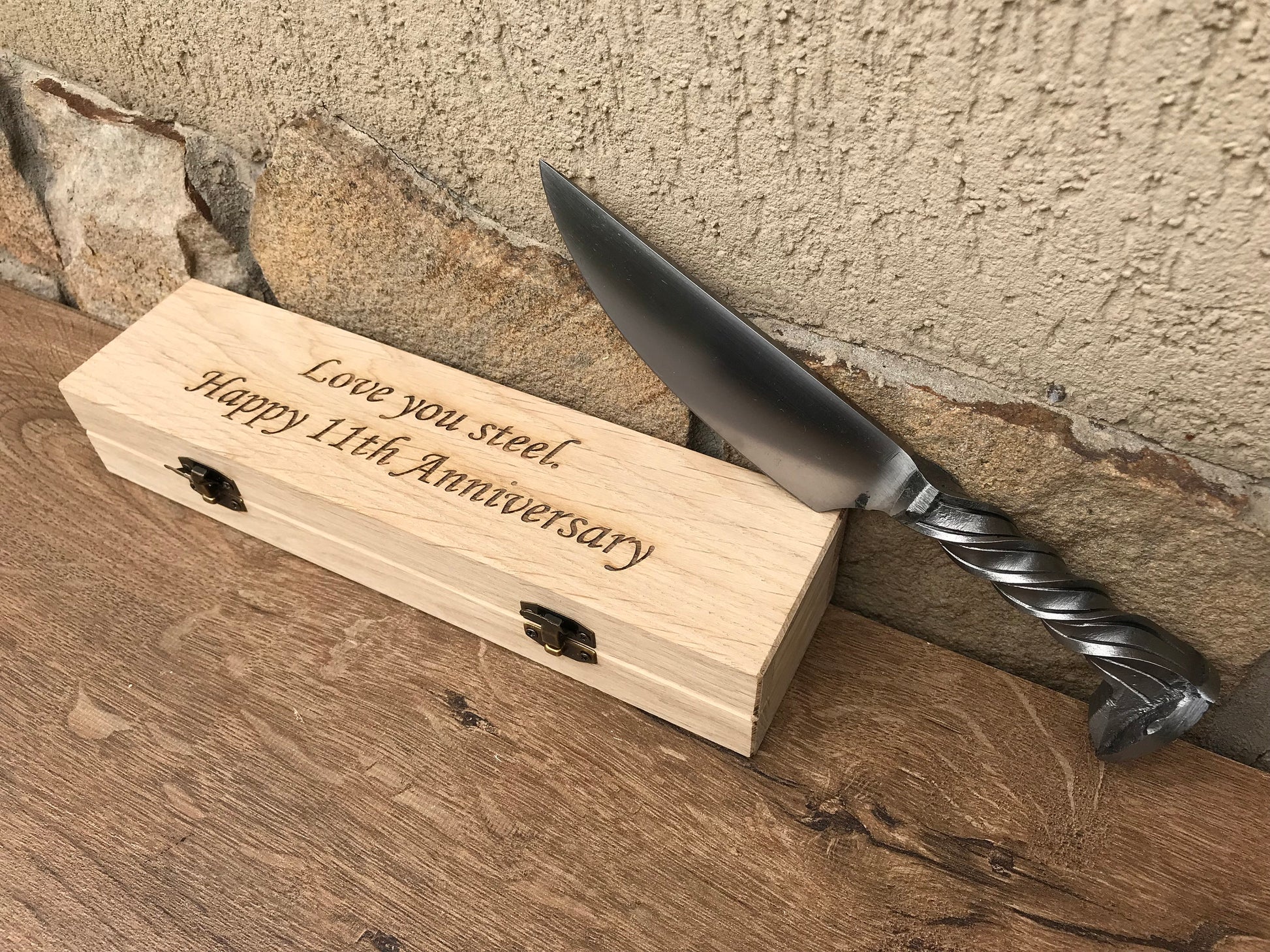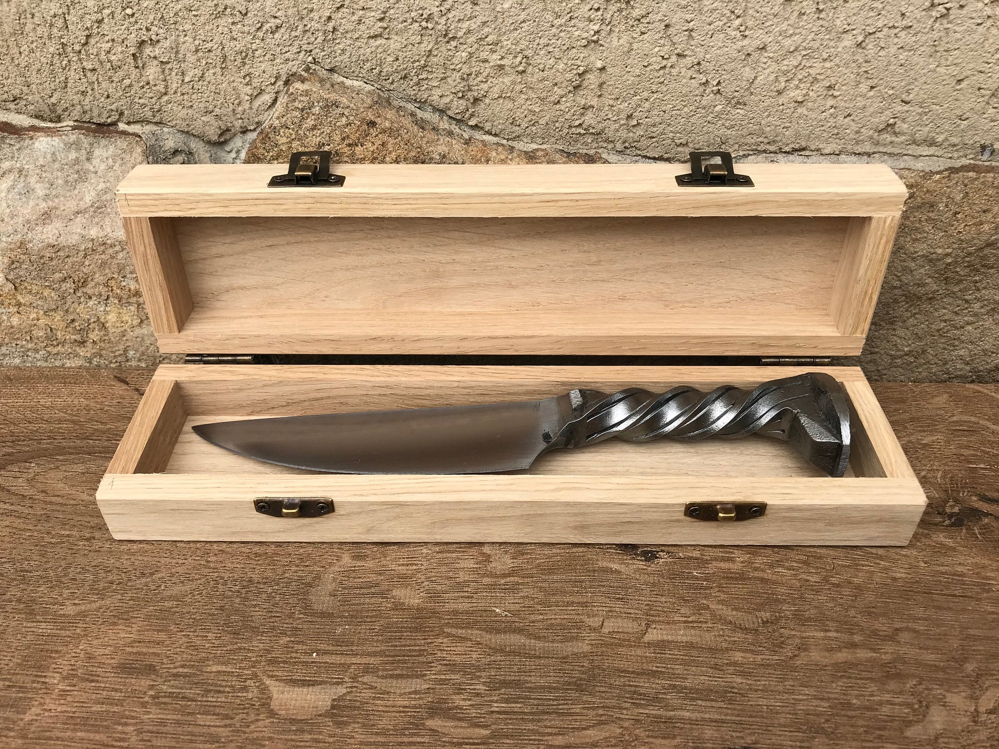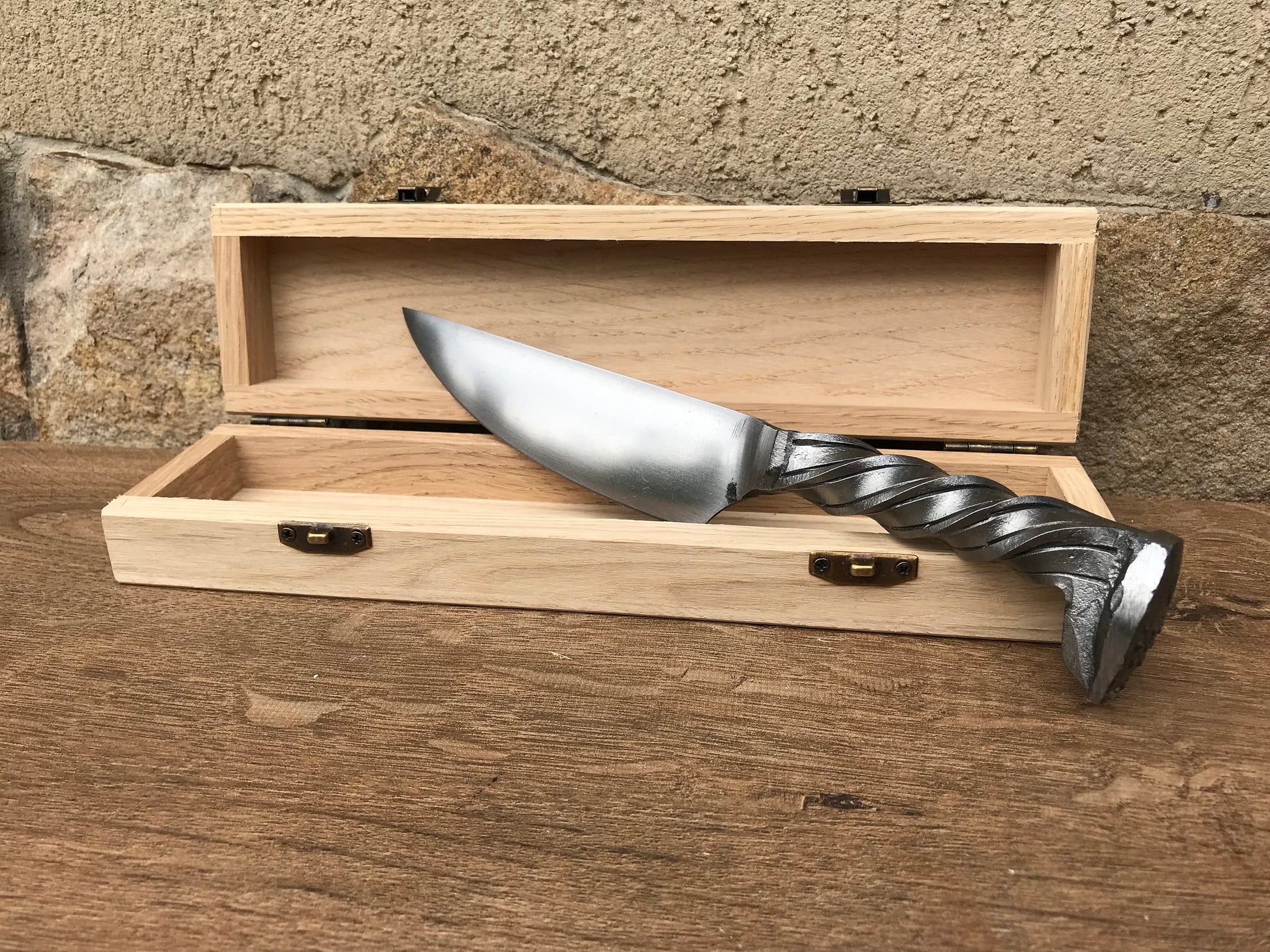 Here is a hand forged knife (a handle - in a view of twisted waves) in a wooden box (casket). This is a great groomsmen gift, corporate gift, usher gift, groom gift, father of the bride gift, 6th anniversary gift (iron year), 11th anniversary gift (steel year), Father's Day, Christmas gift for a grandfather or any other gifting occasion.