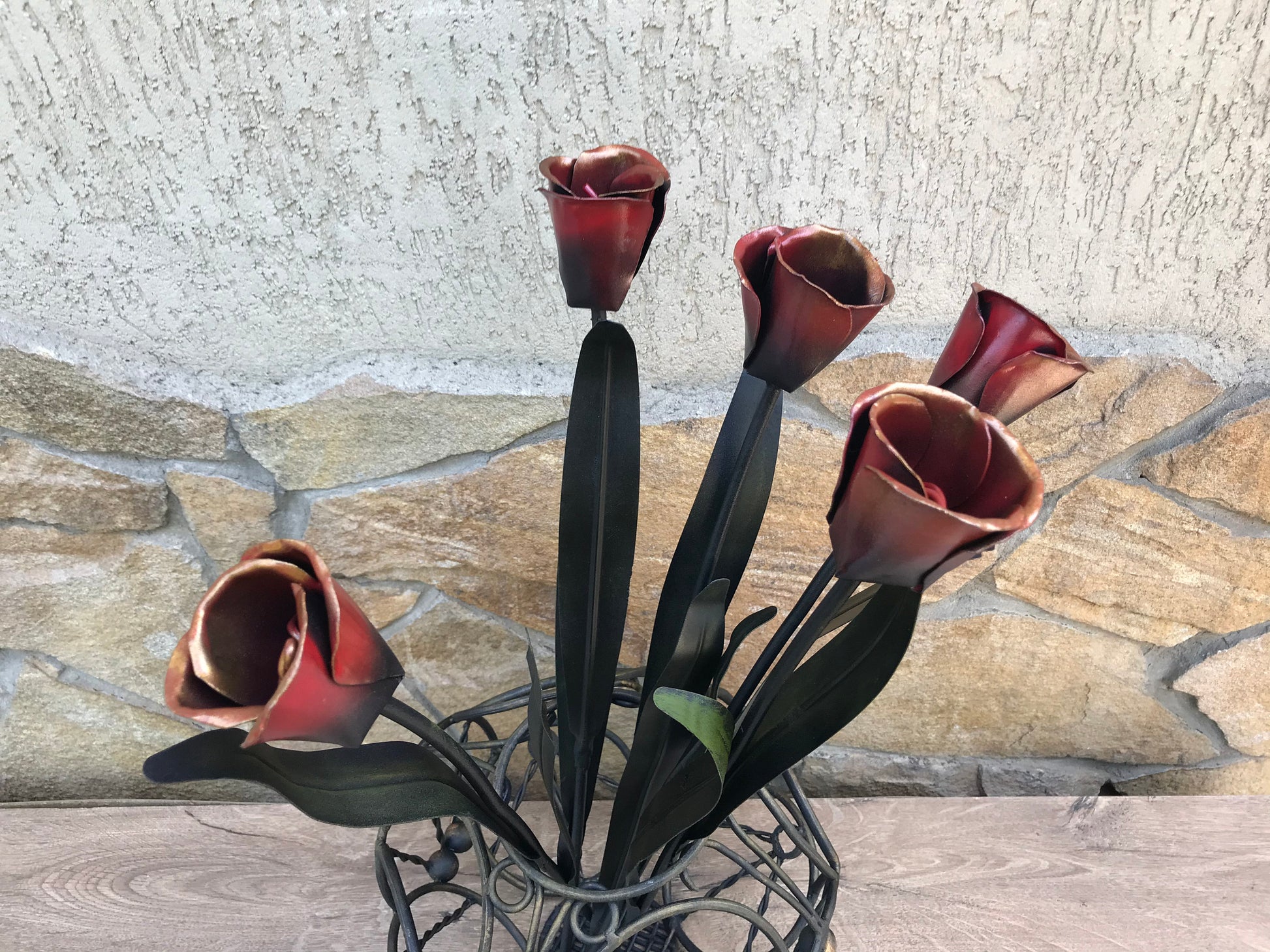 Are you looking for a gift on wedding anniversary? 11th wedding anniversary is very close? It is called "steel anniversary" and a steel/iron gift for this occasion will be justified. Here is a forged metal bouquet of tulips staying in a nice vase which could be a nice gift for your girl/woman. It looks very festive and decorative! The price includes set of 5 tulips and a vase also.