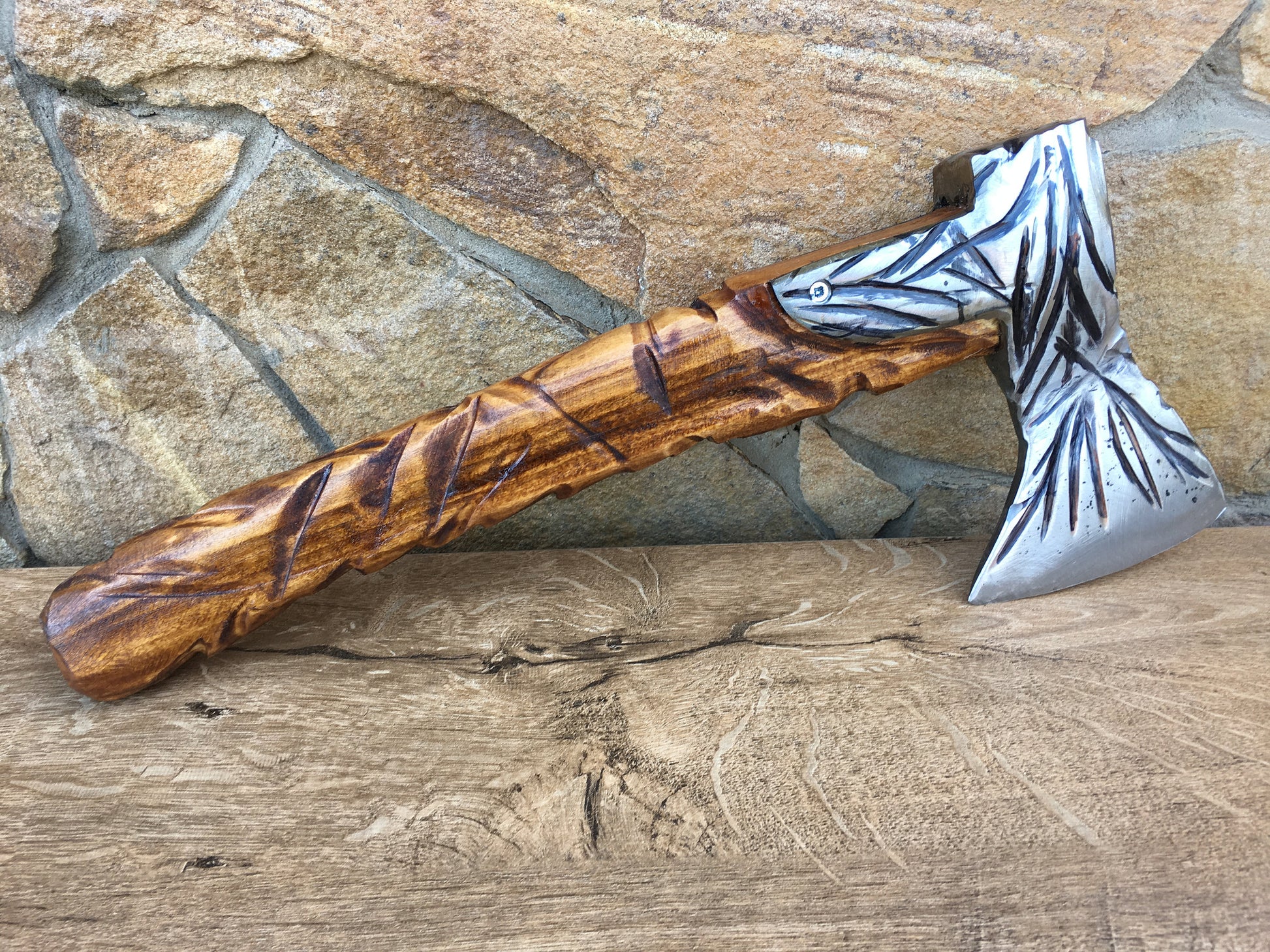 A compact outdoors axe, with decorated axe head, hand-forged and made from carbon steel using traditional blacksmith methods. The steel is stuck several times, increasing its density and thereby the durability of the axe. Perfect for packing in a rucksack, the axe can also be worn on a belt. It will be a perfect companion in your ventures through the wilds, through the woods of the pacific northwest, or at the cabin to make kindling to warm your hearthside. It has a wooden stump.