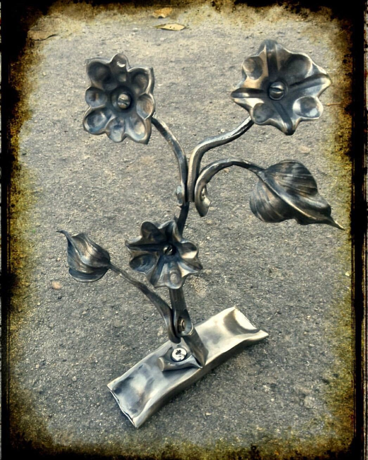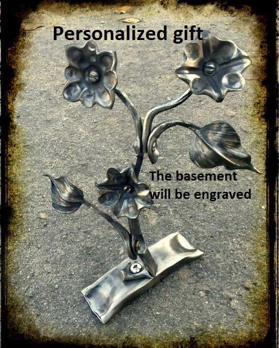 Are you looking for a nice wedding anniversary gift? Valentine's day gift? Wedding gift? Mother's day gift? Birthday gift? Or just a home decor? Here is a hand forged composition with three metal flowers on a metal stand which could be a nice gift for your girl friend/woman/wife. It looks very festive and decorative!