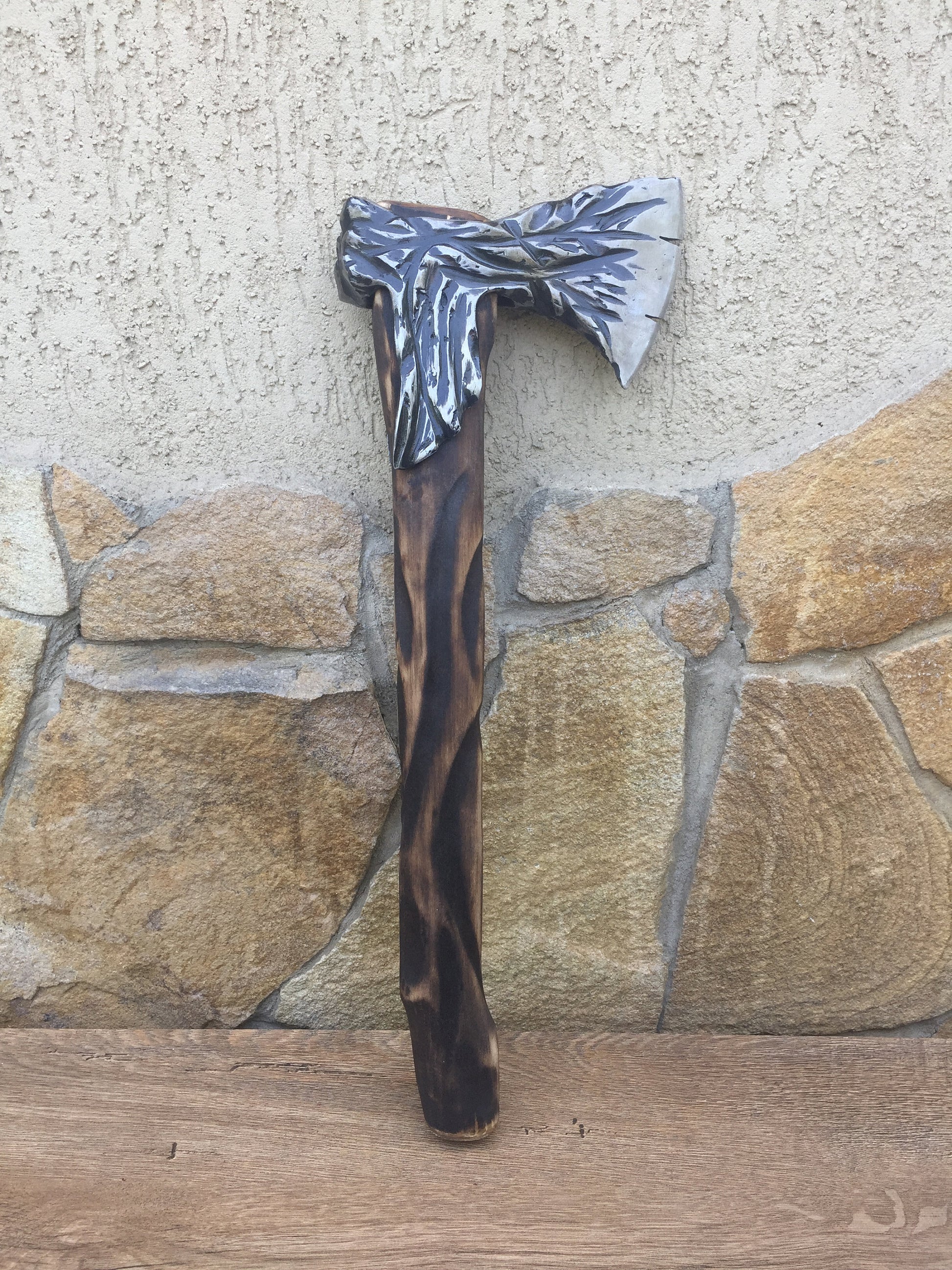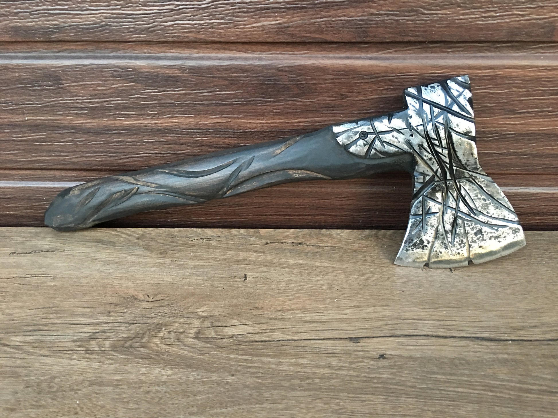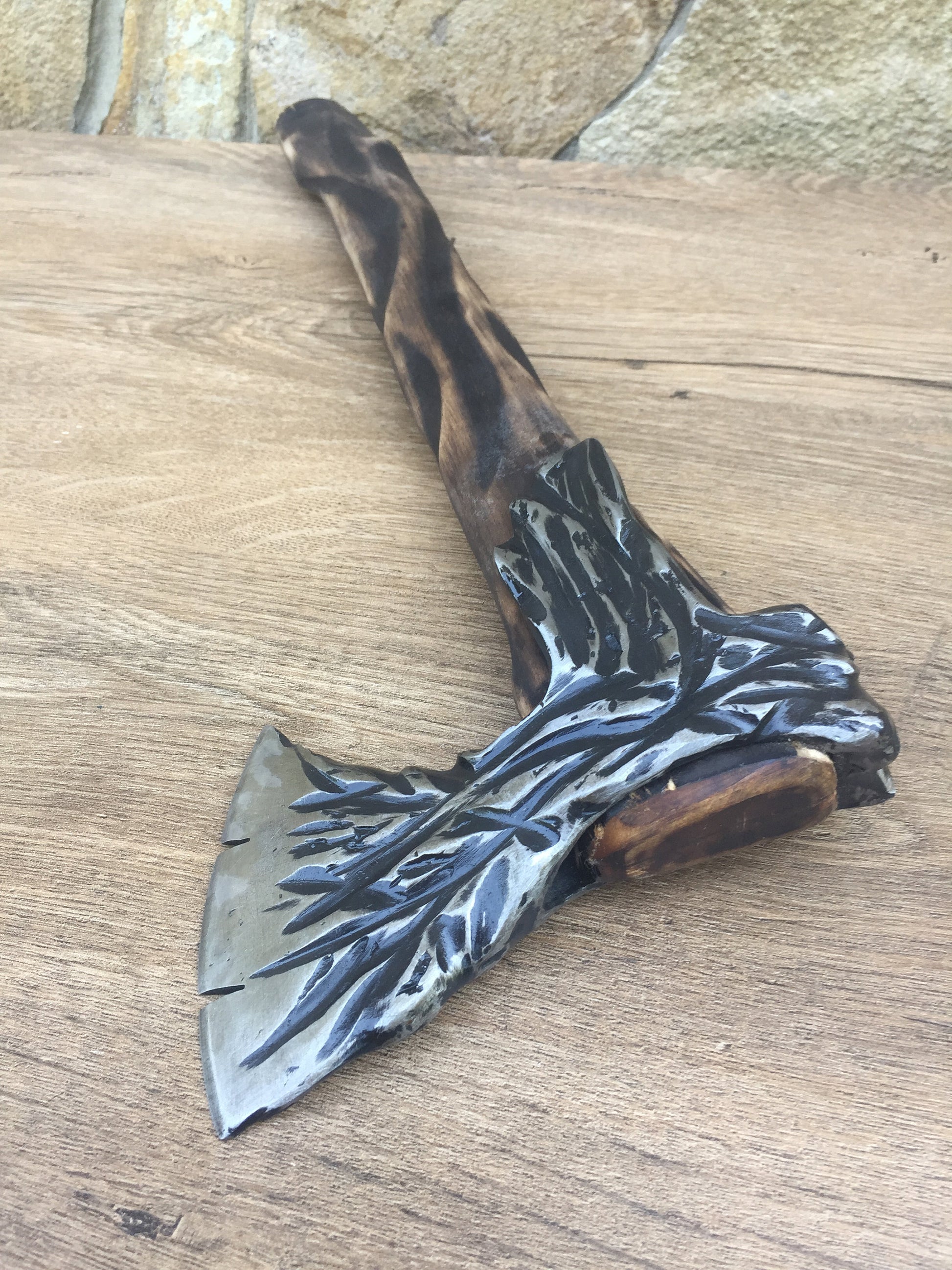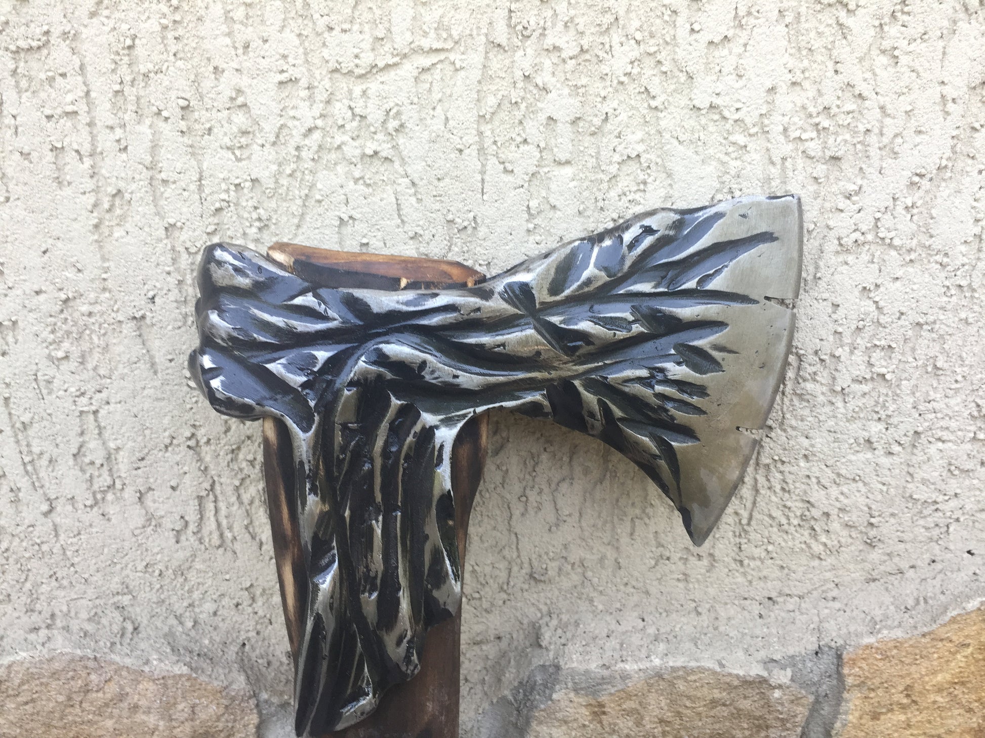 On the last page there is the axe with carved in metal wolf axe. You can find this listing in my shop if you like this axe.