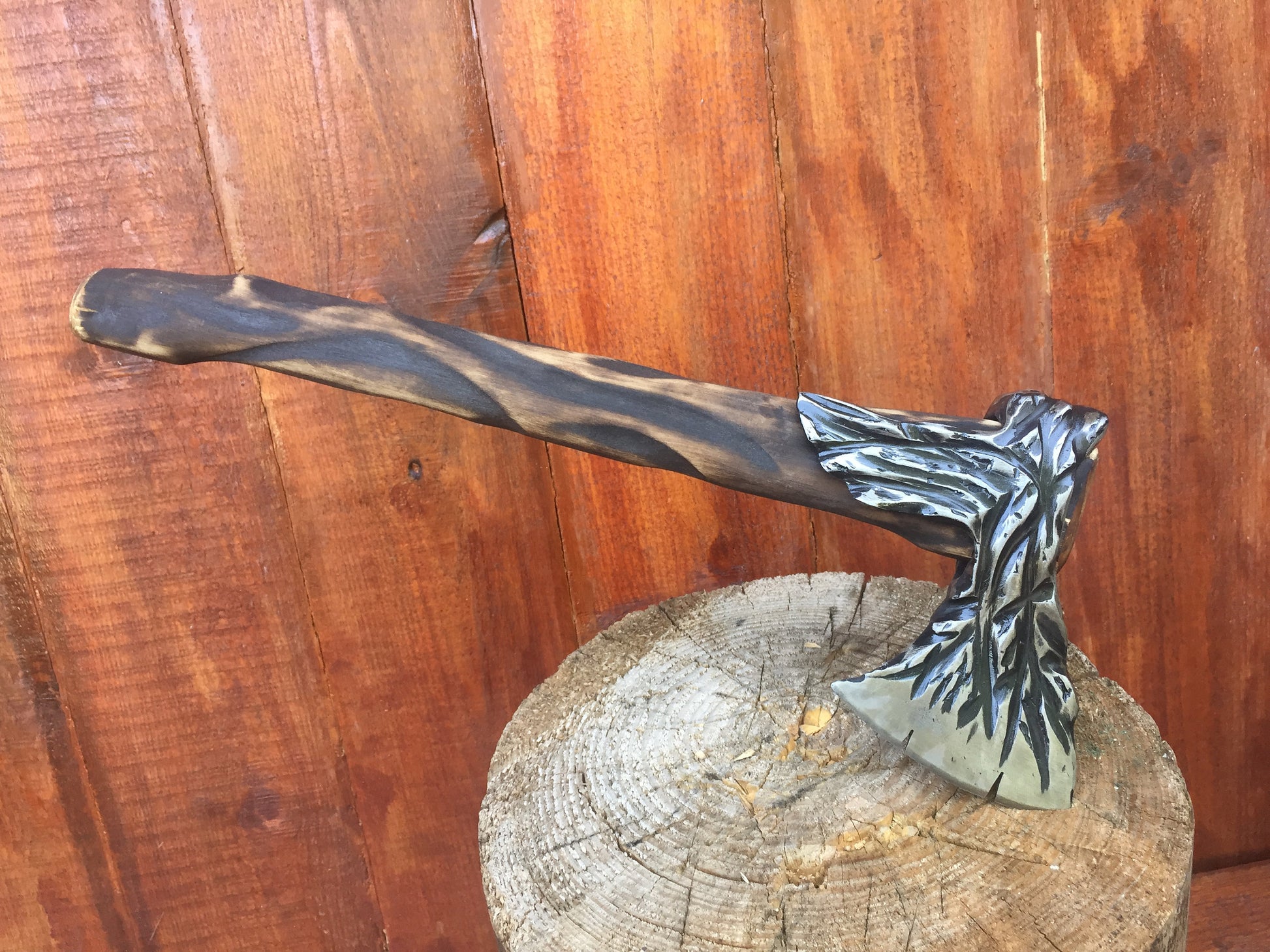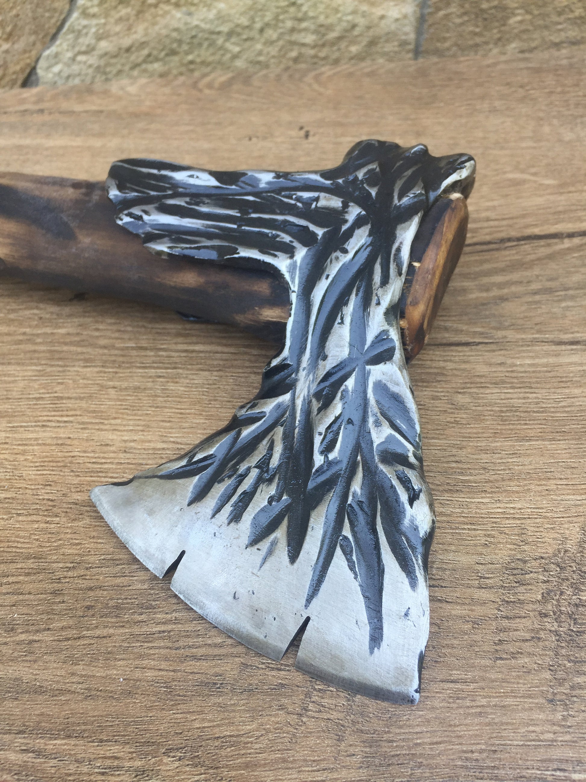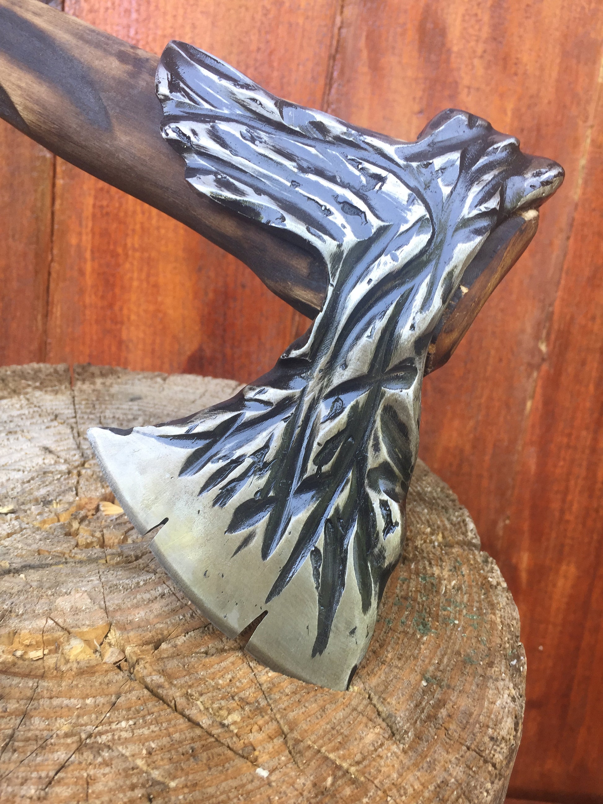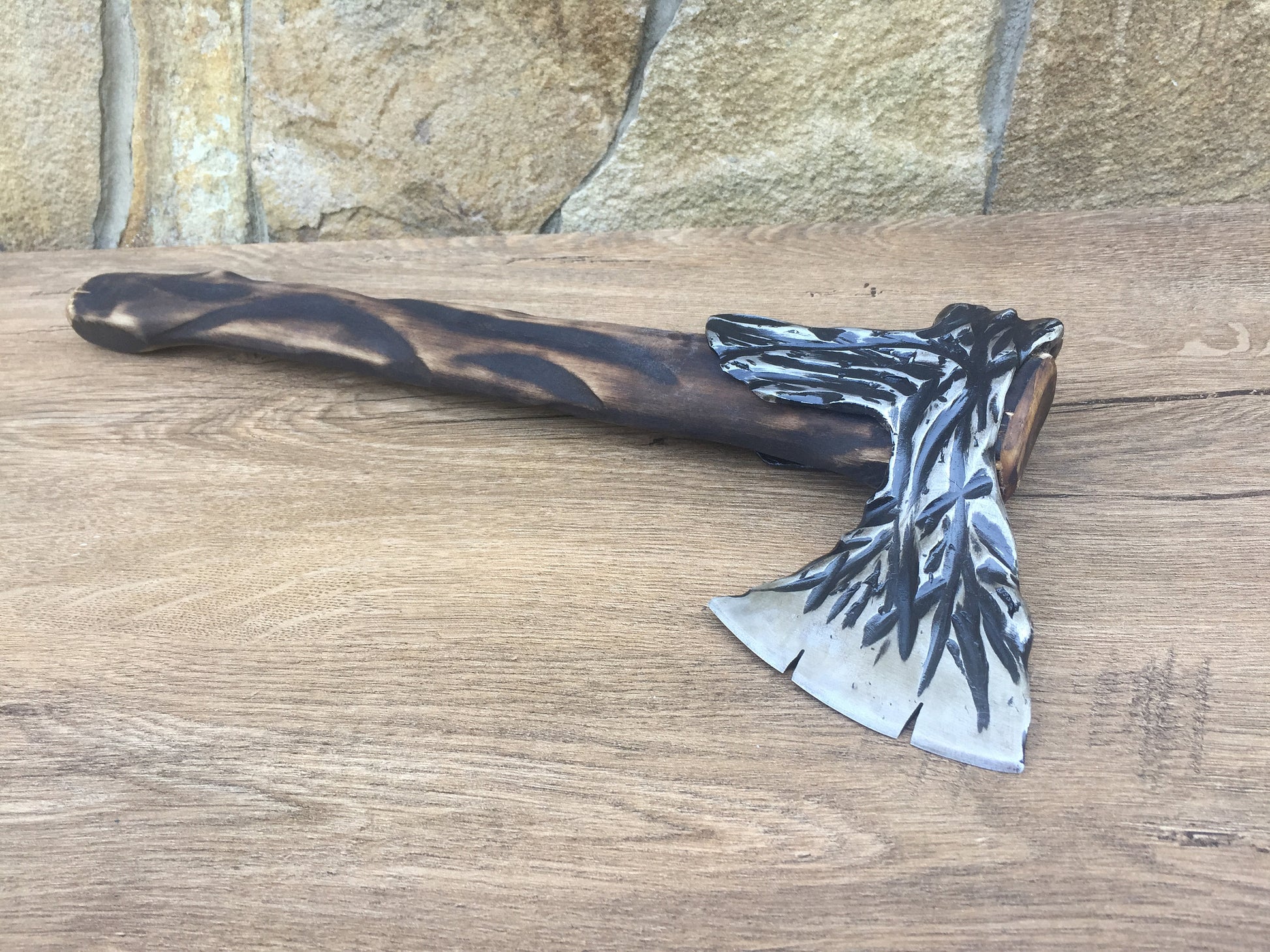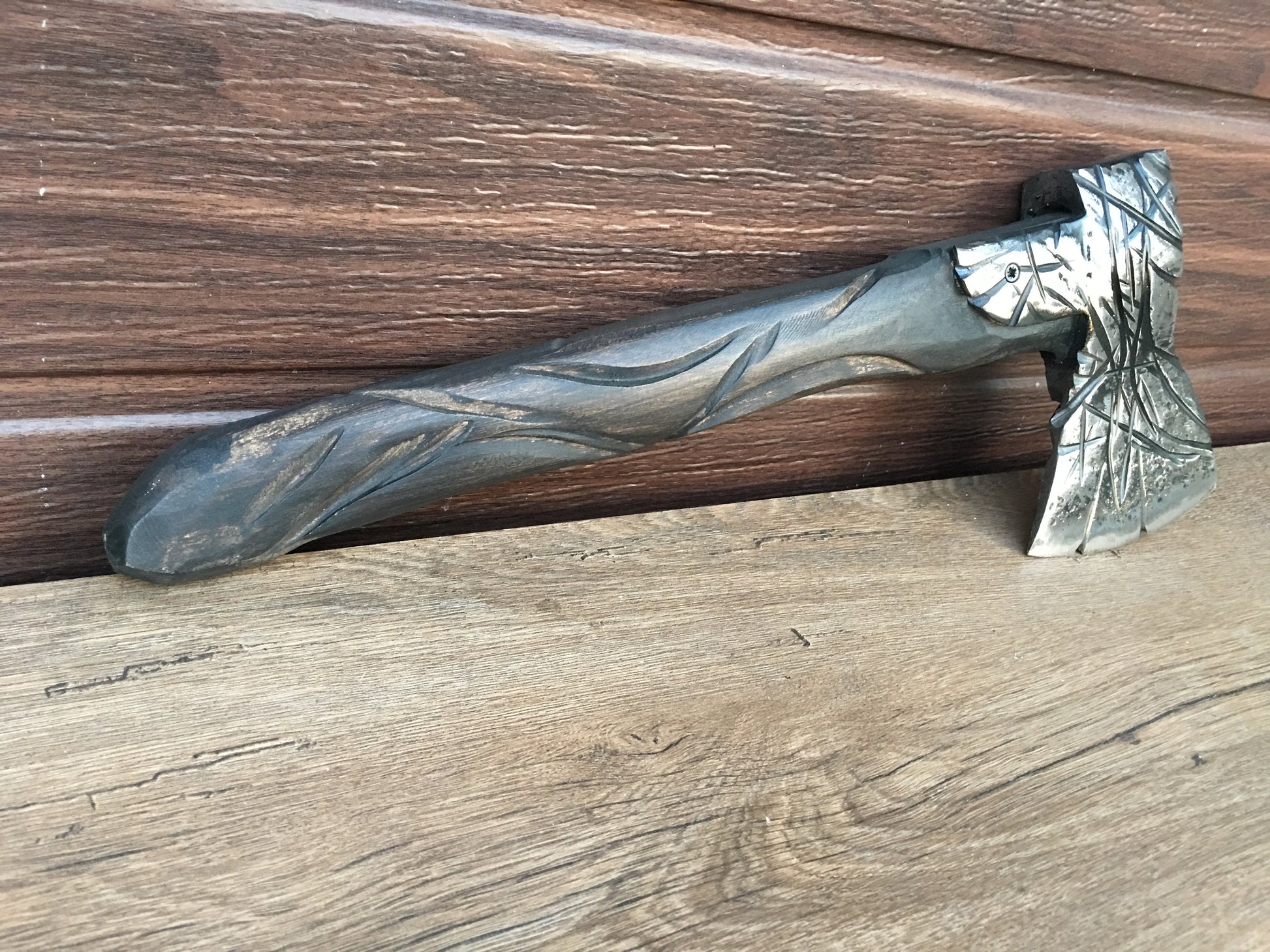 On the last page there is the axe with carved in metal wolf axe. You can find this listing in my shop if you like this axe.