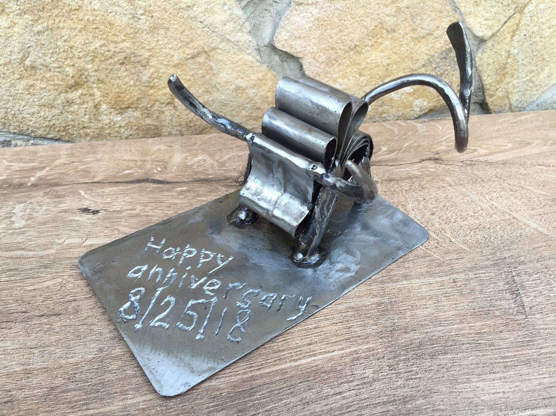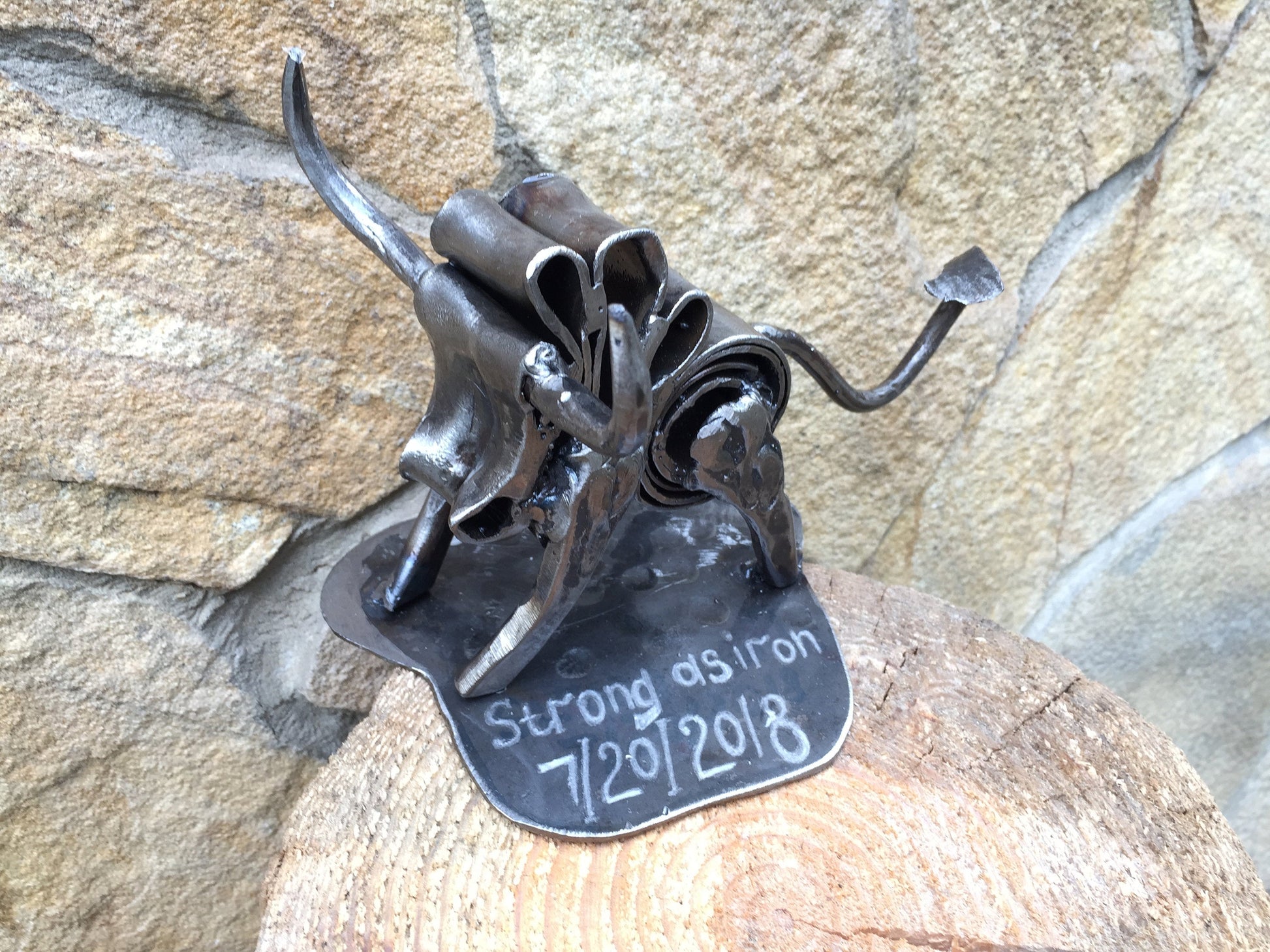Here is a hand forged iron bull with the engraved words and date. This is a great gift for 6th wedding anniversary, 11th anniversary gift (steel wedding anniversary), Father's Day, Christmas gift for a grandfather or any other gifting occasion.