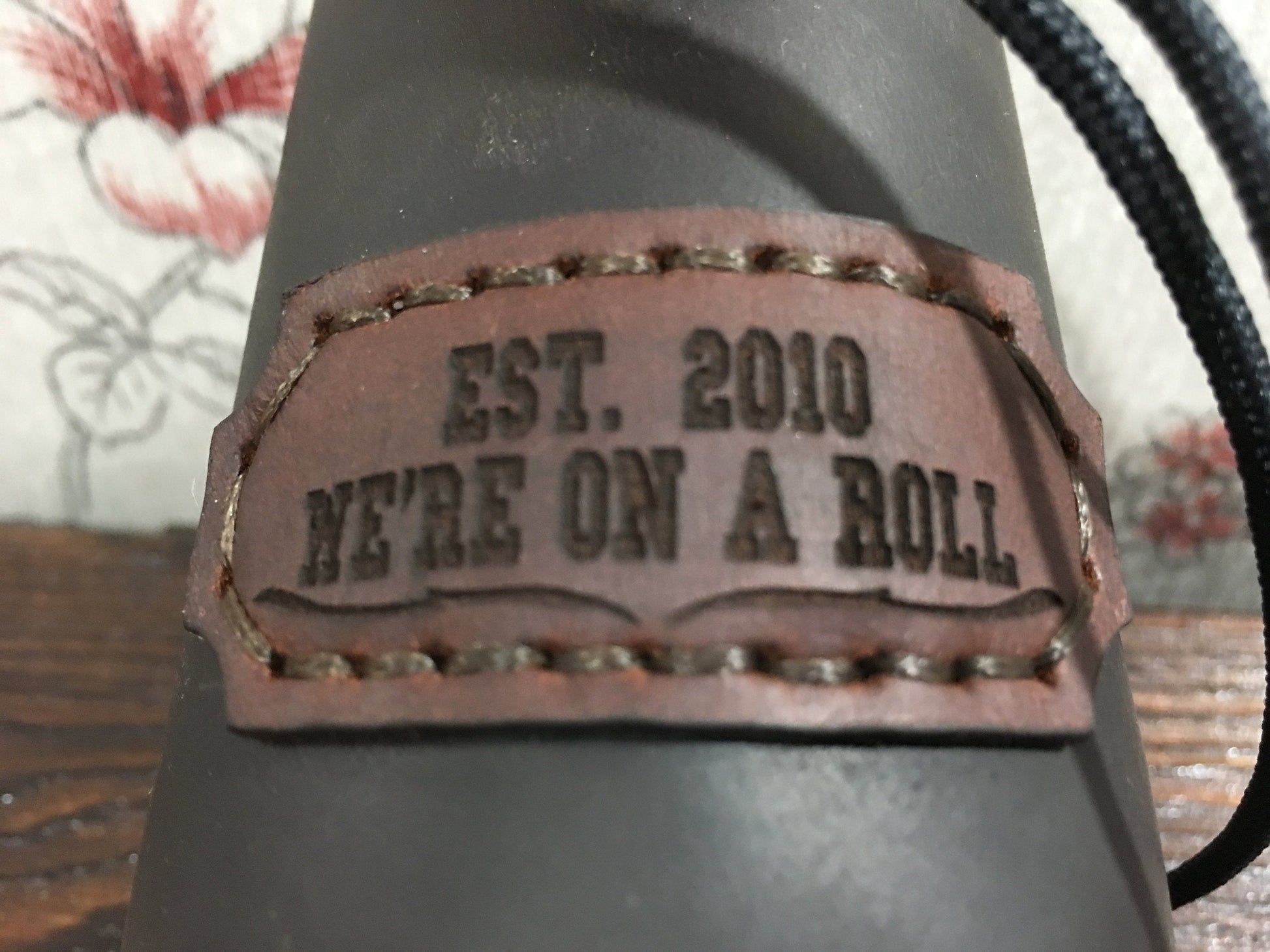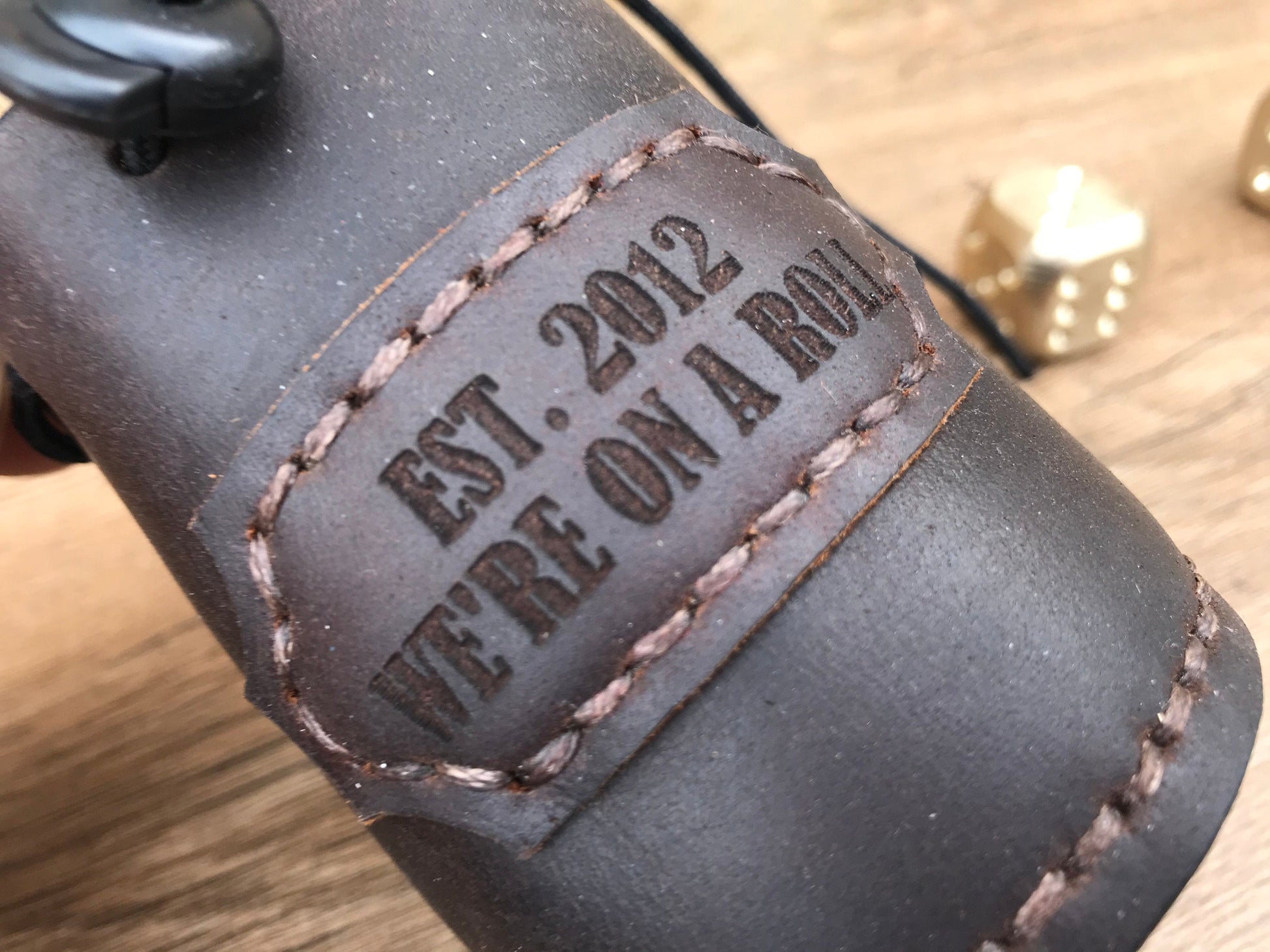 The leather bag is engraved with: "Est 2012 We're on a roll". But there can be your custom words/phrases engraved on the leather.