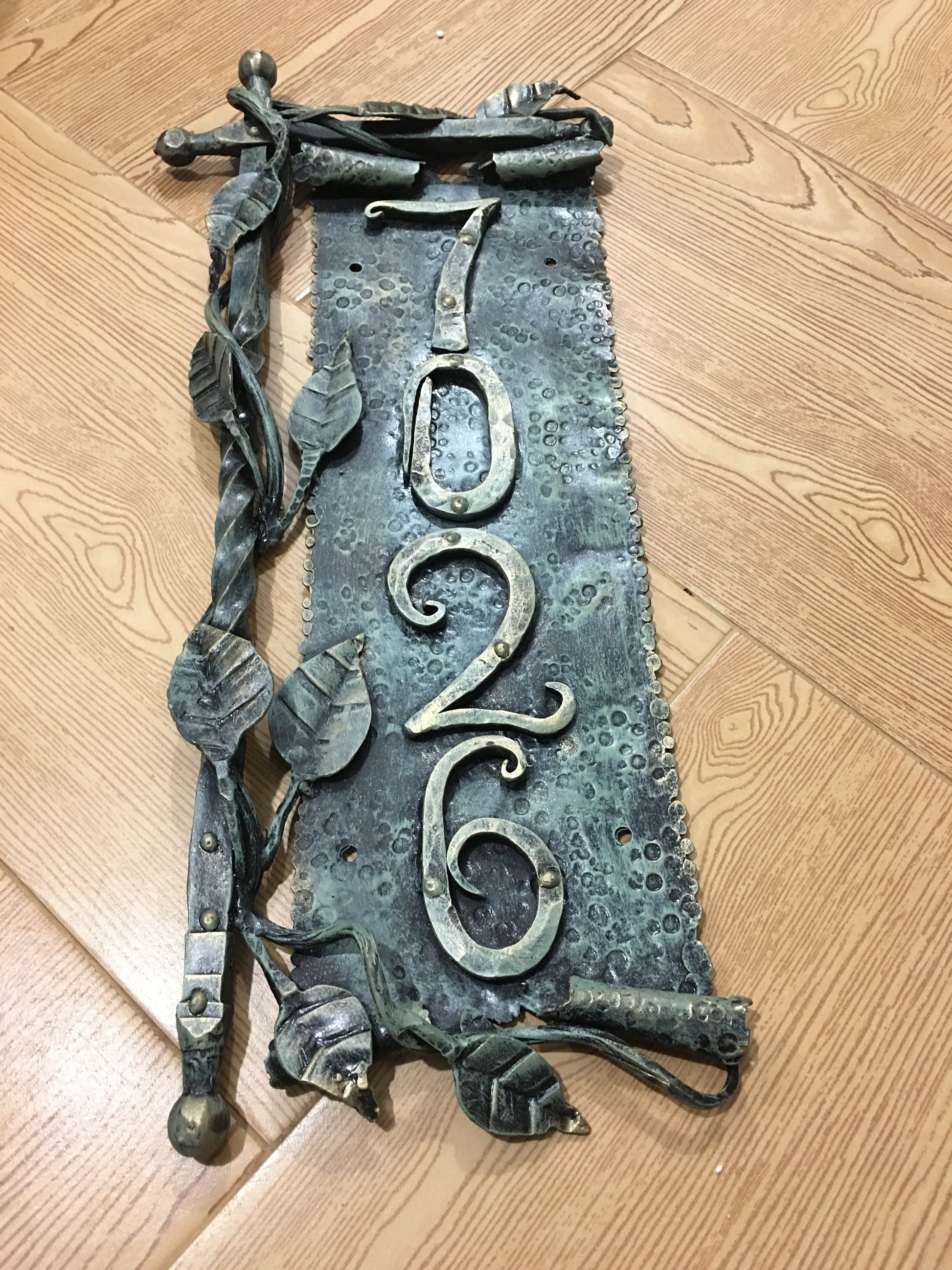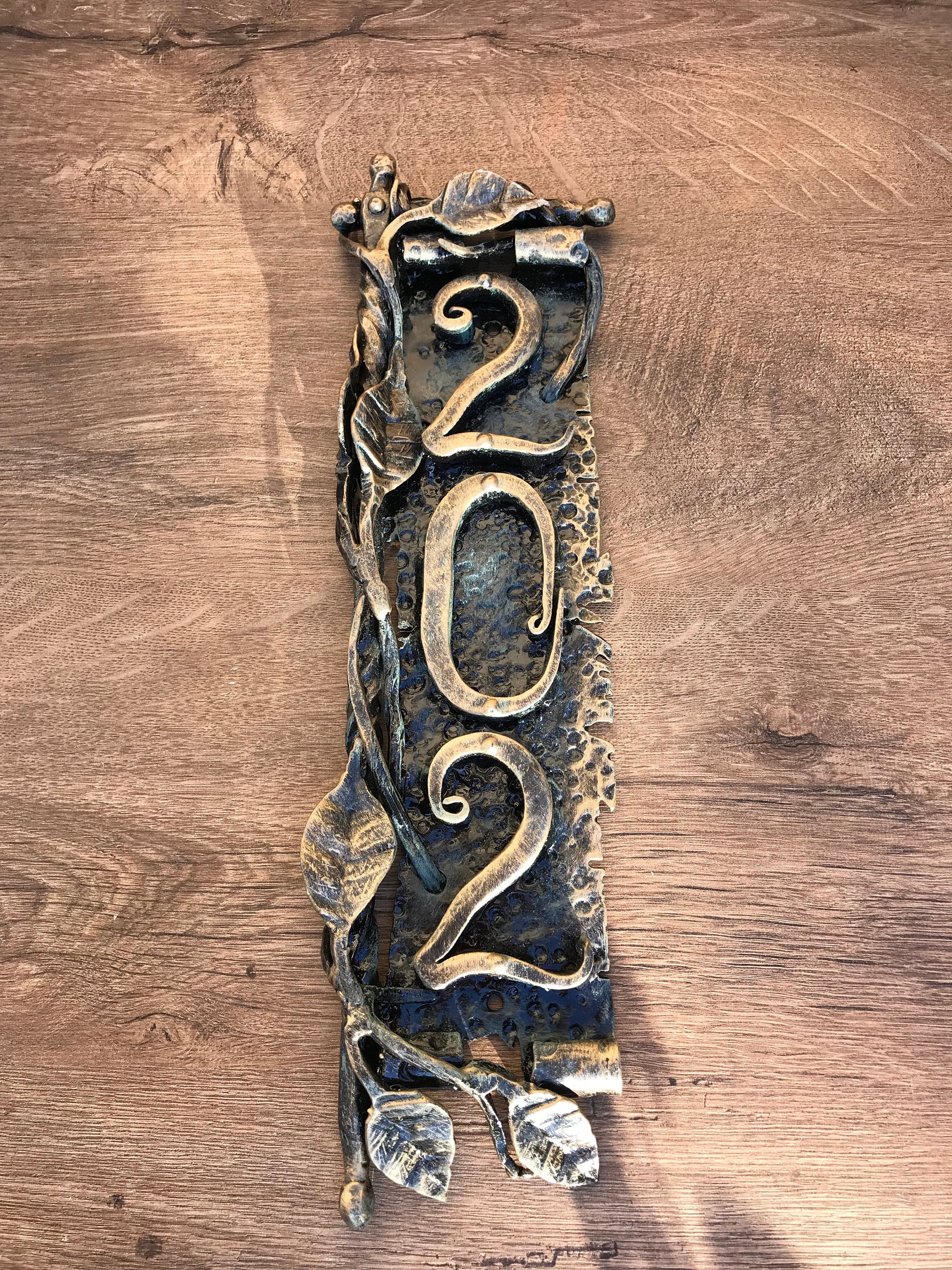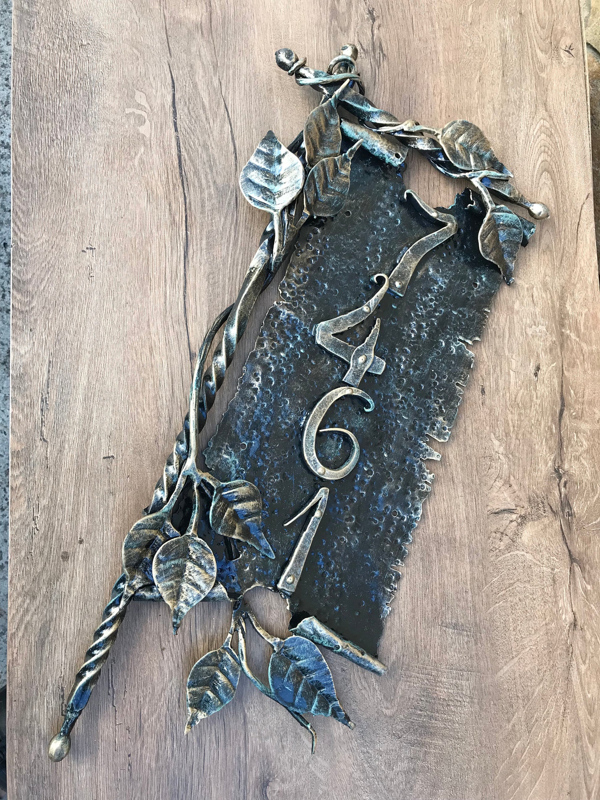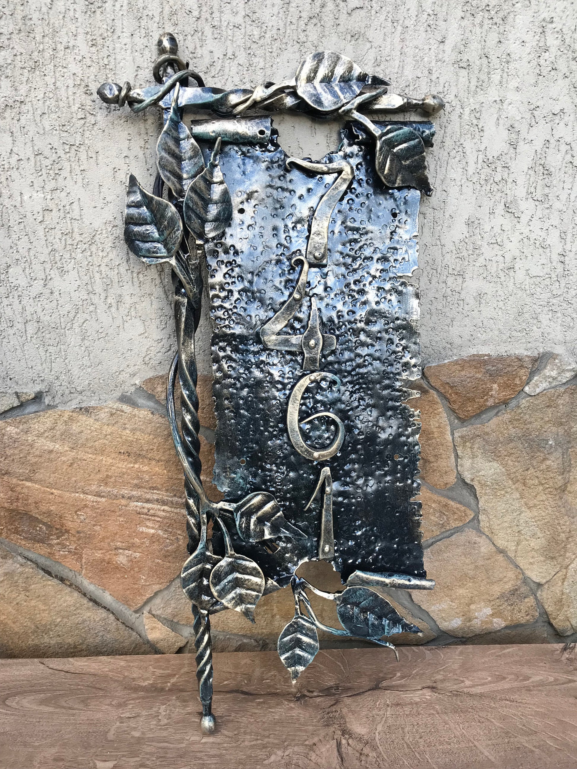Here is a hand forged house number sign which gives much more beauty to your house and outlines its the exterior features. It is done in a view of a scroll with a branch. Numbers are nicely forged! It is handmade, art forged.