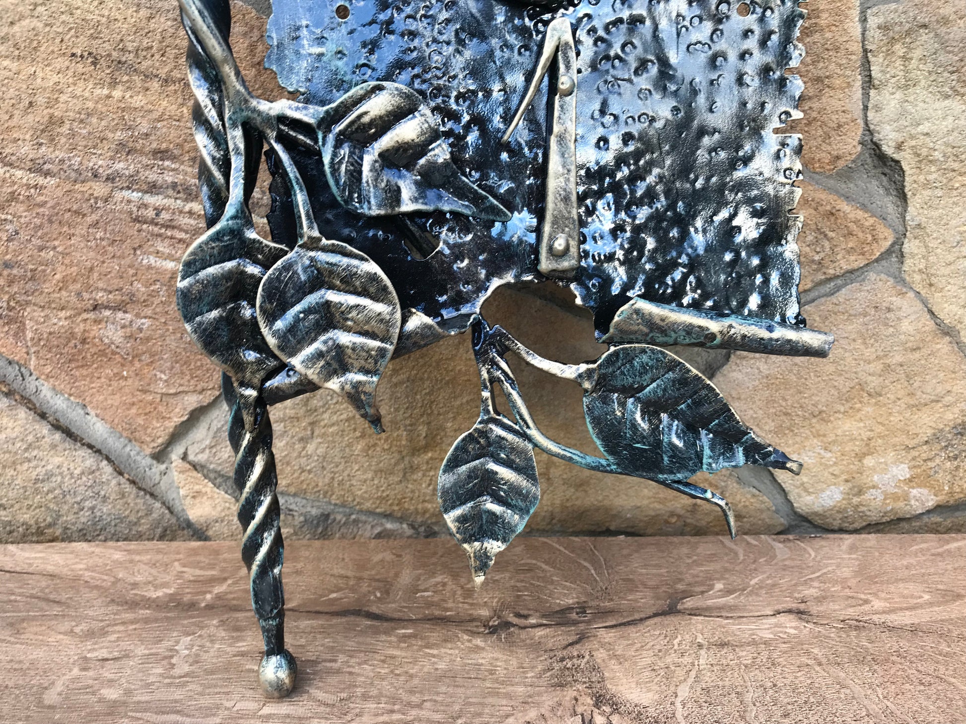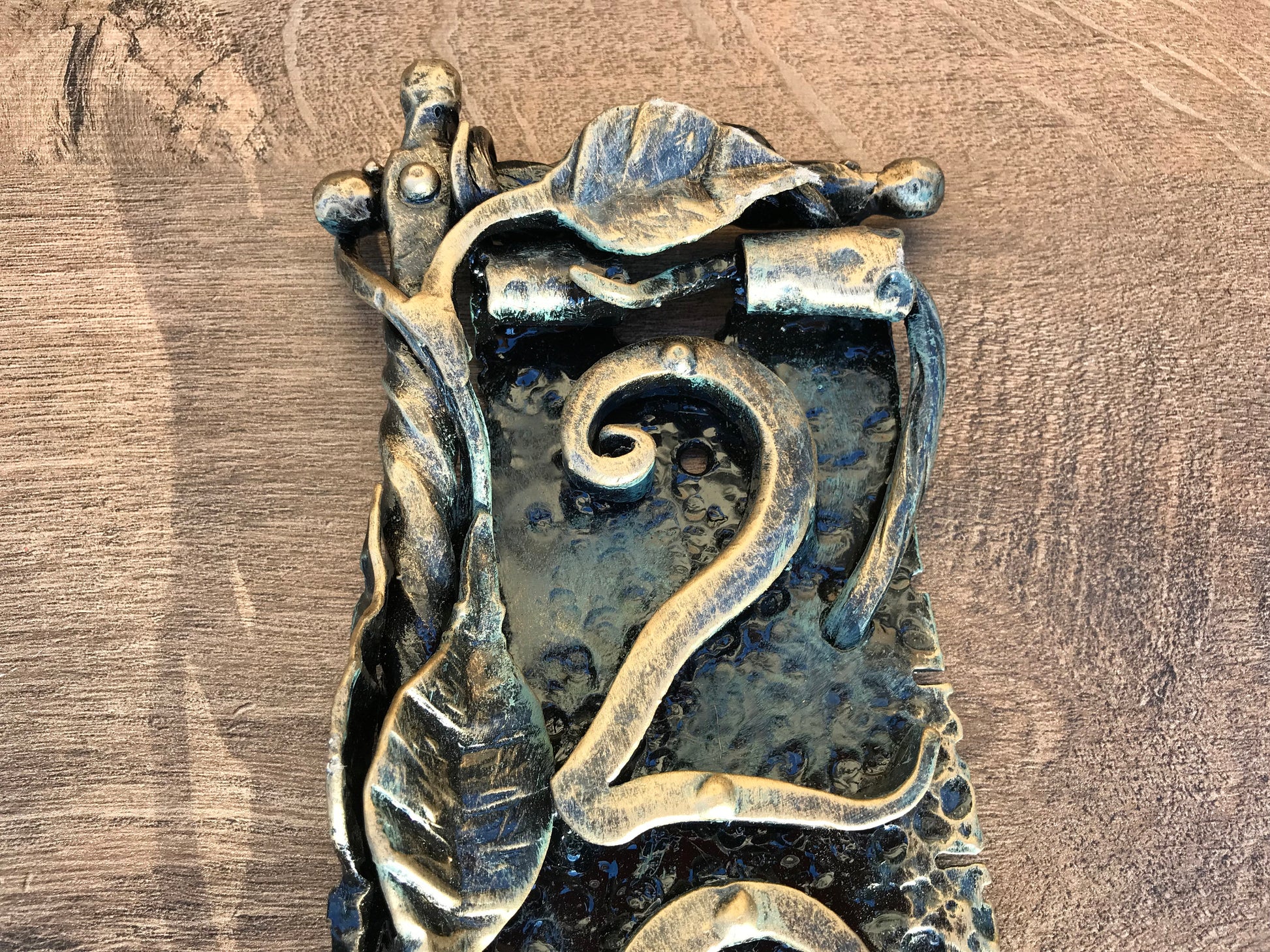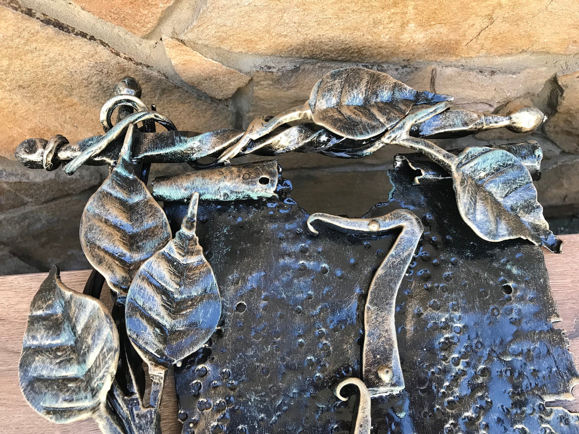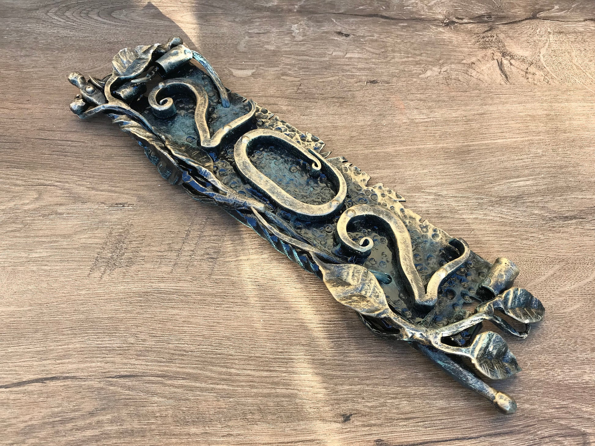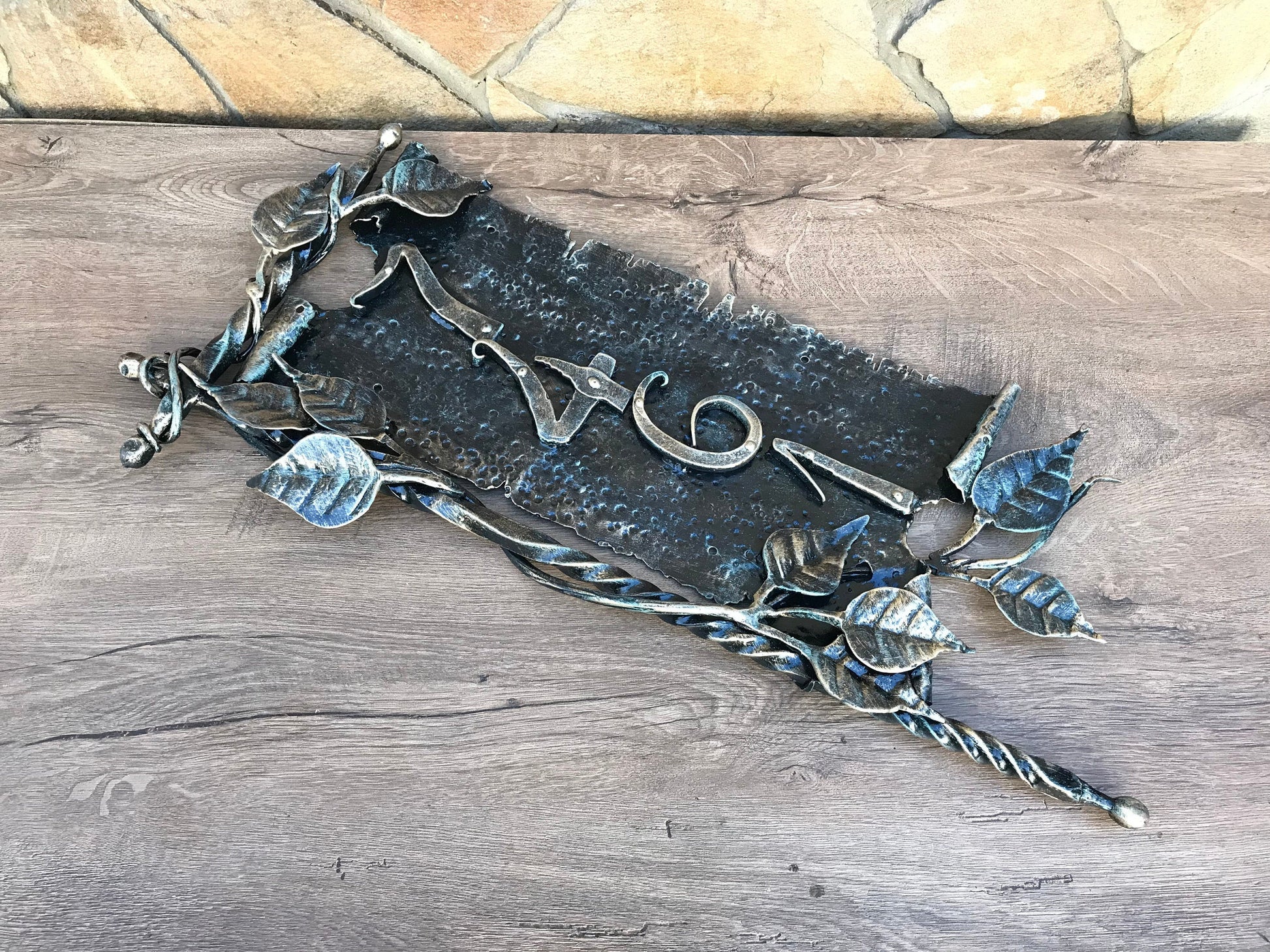 Here is a hand forged house number sign which gives much more beauty to your house and outlines its the exterior features. It is done in a view of a scroll with a branch. Numbers are nicely forged! It is handmade, art forged.