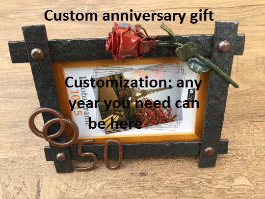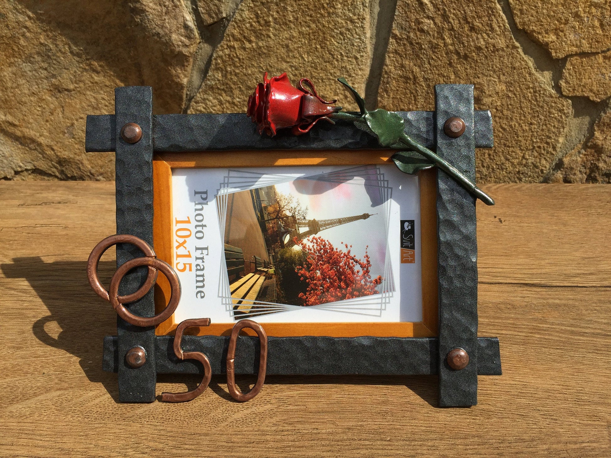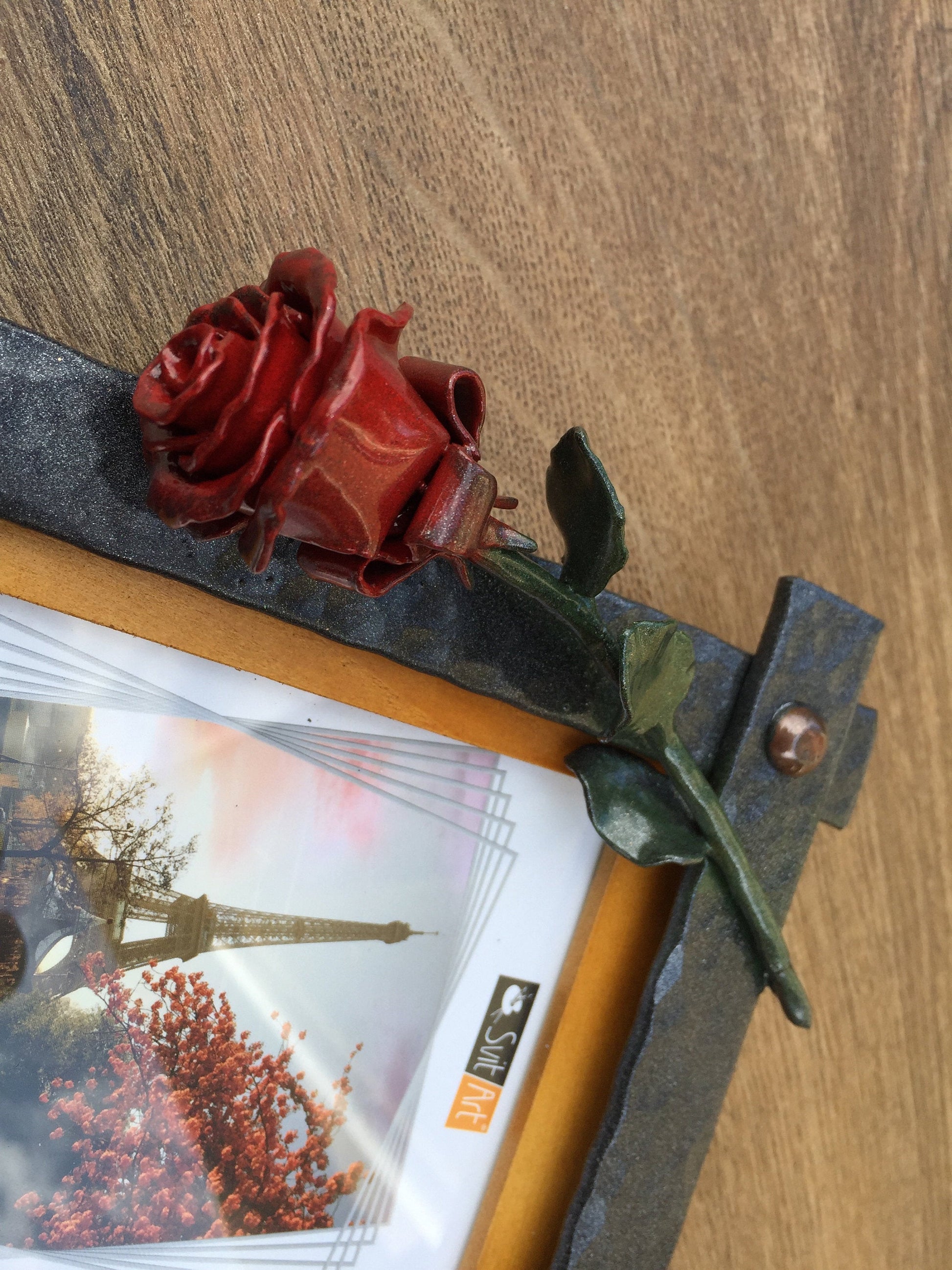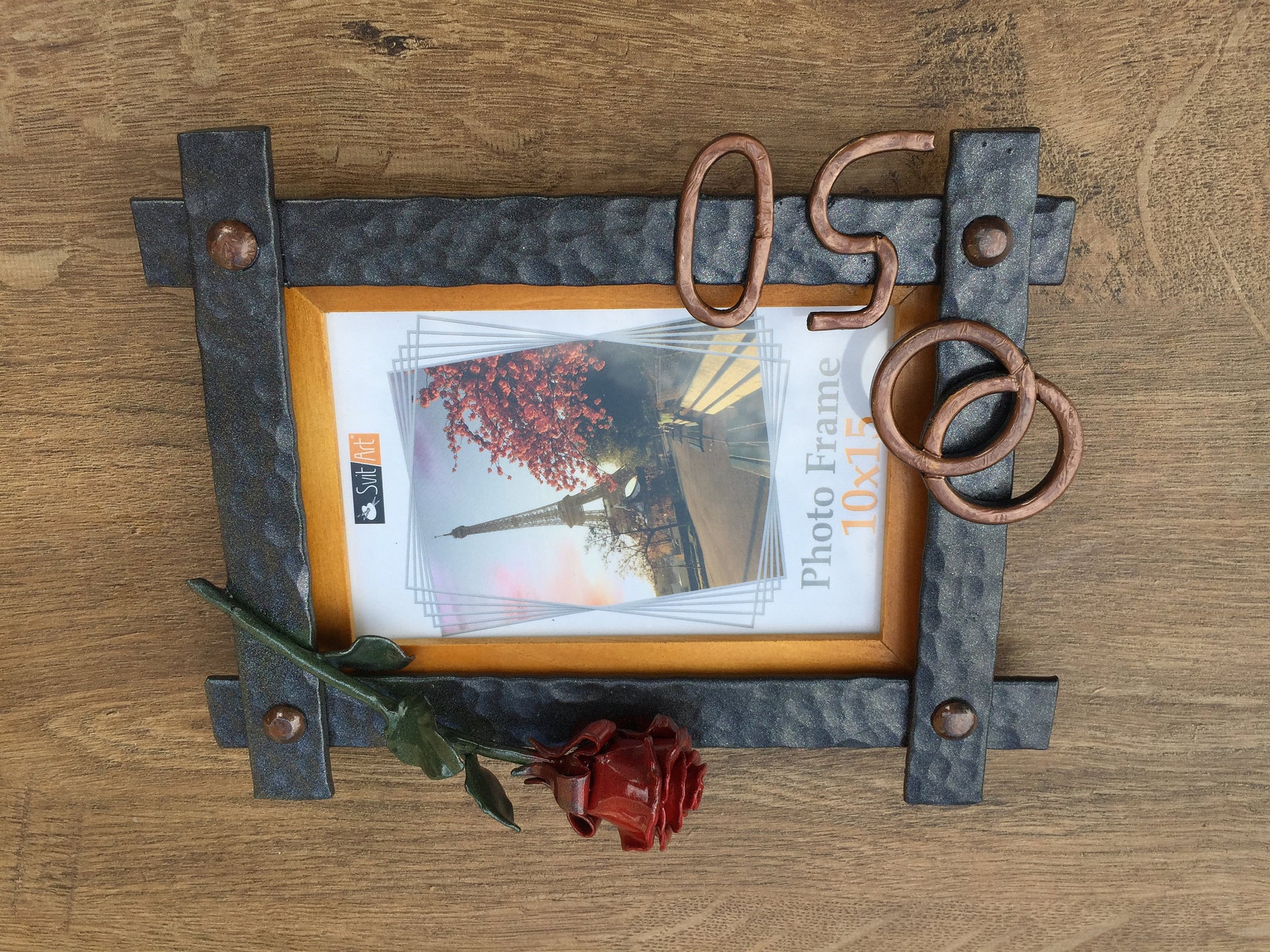 A photo frame can be not only a usual photo frame but a masterpiece which can decorate your home, can fix your best life events. Here is a nice hand made hand forged hand hammered photo frame done in a very decorative way, with an iron rose. It has two rings and a year of anniversary. A year of anniversary can be changed on any you need. It is a nice photo frame to keep the wedding anniversary photos. It is also a good gift for any birthday since you can customize it with a year of anniversary.