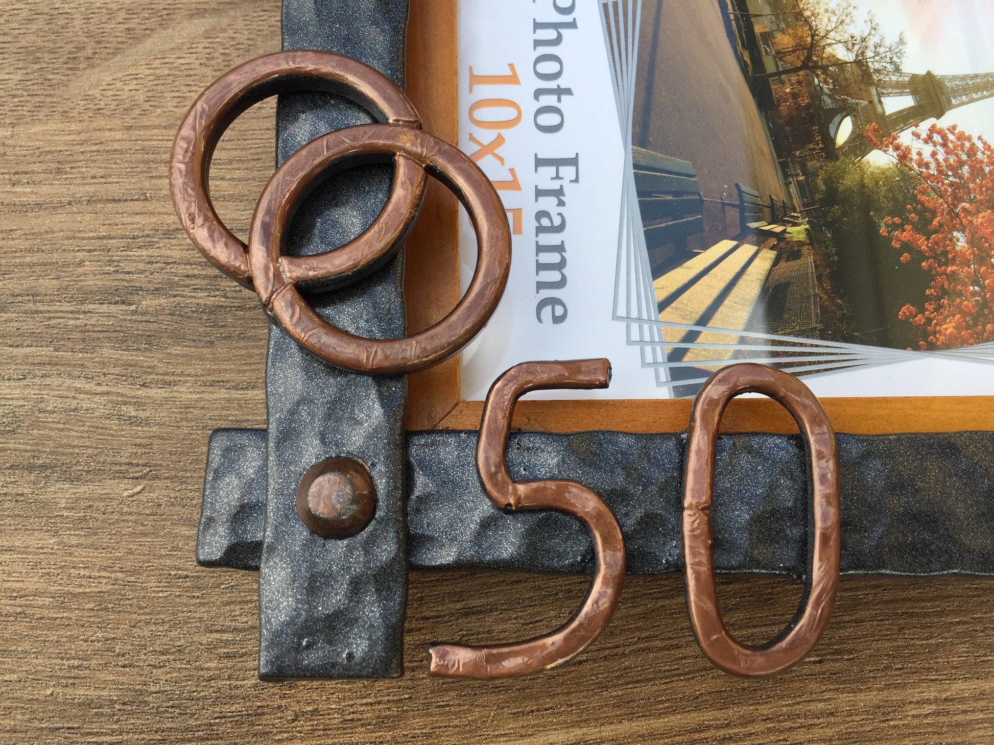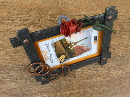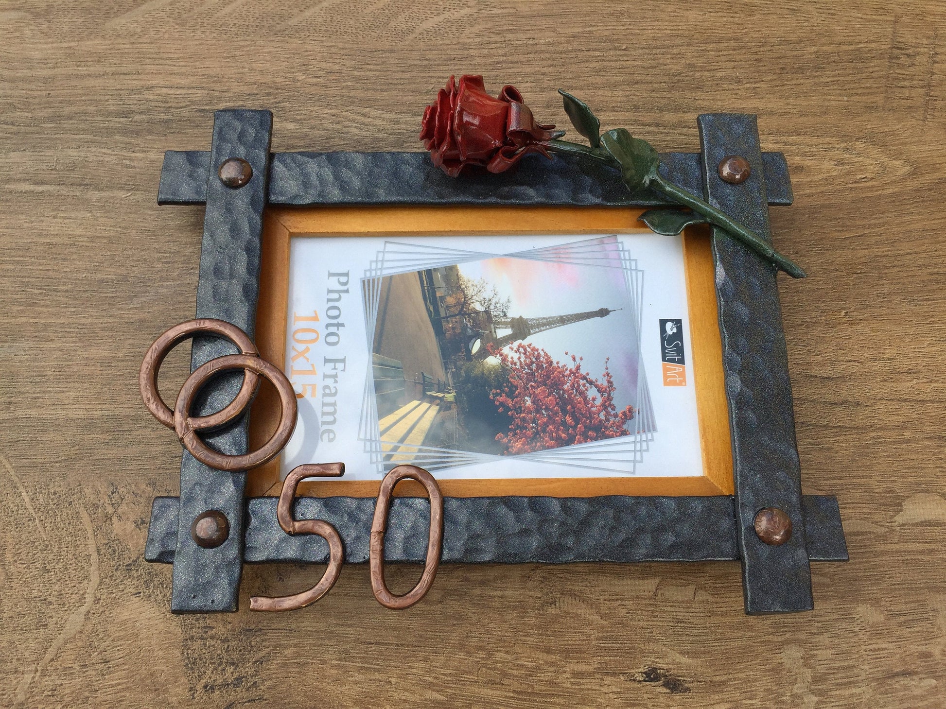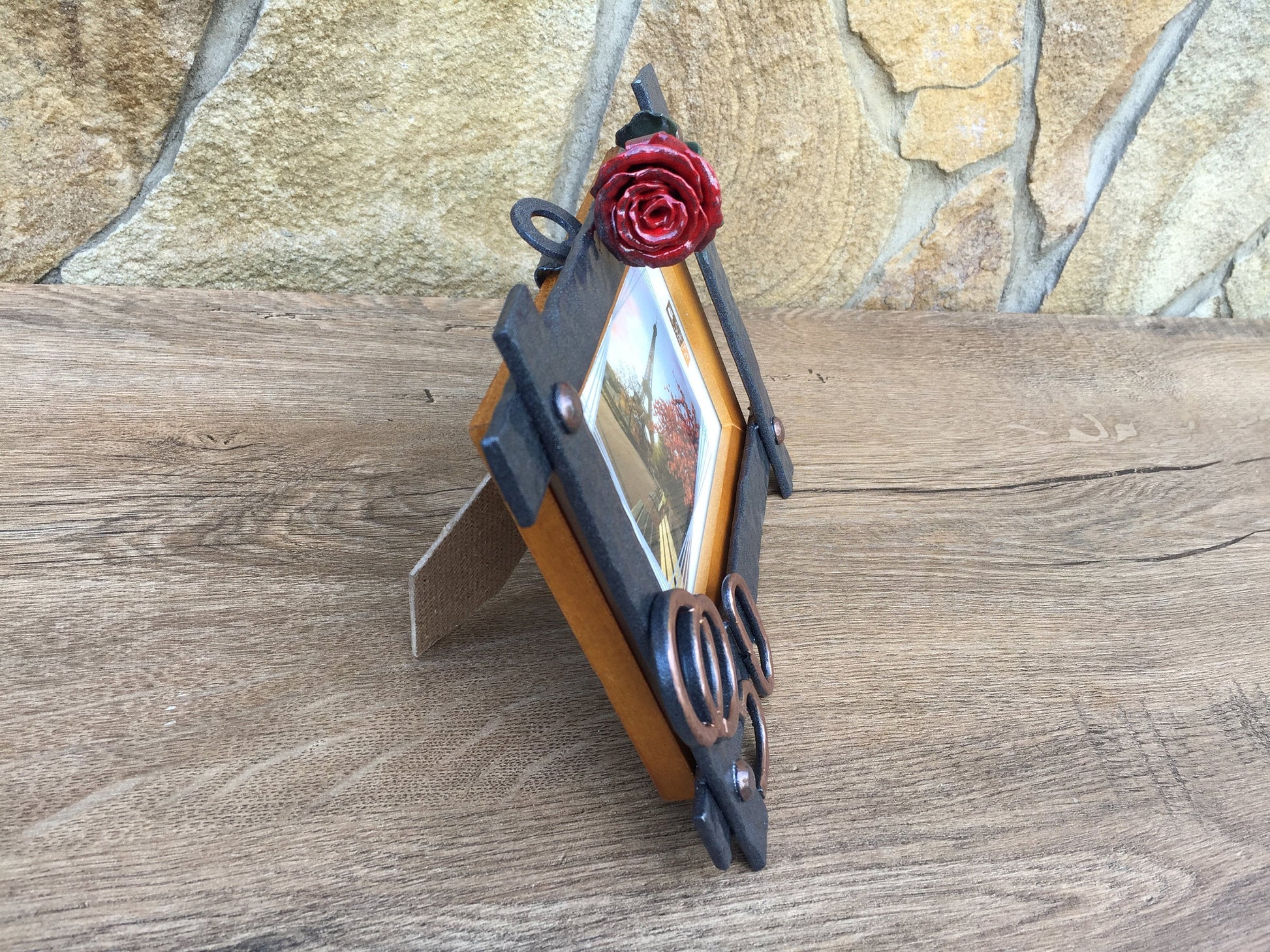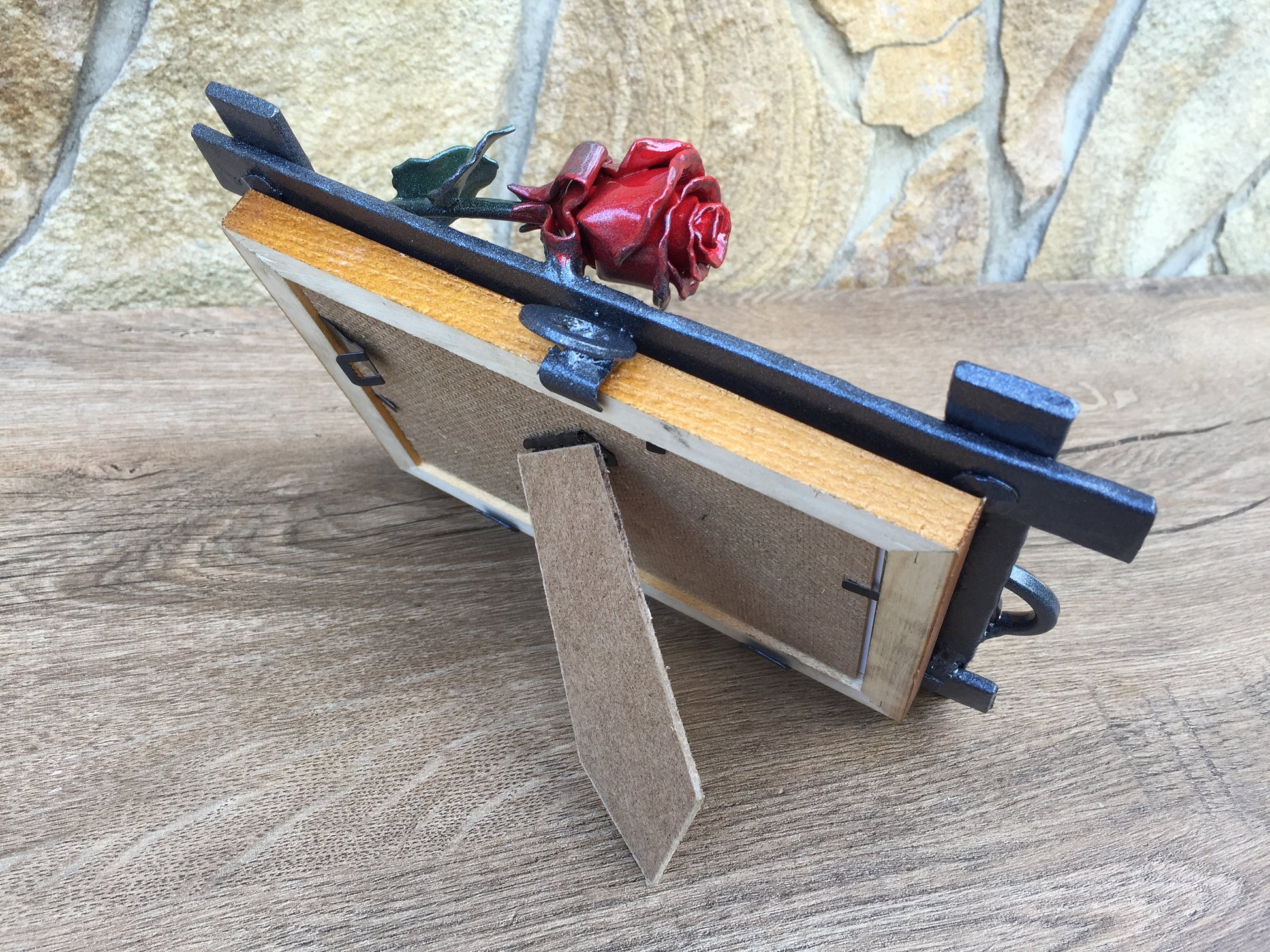 A photo frame can be not only a usual photo frame but a masterpiece which can decorate your home, can fix your best life events. Here is a nice hand made hand forged hand hammered photo frame done in a very decorative way, with an iron rose. It has two rings and a year of anniversary. A year of anniversary can be changed on any you need. It is a nice photo frame to keep the wedding anniversary photos. It is also a good gift for any birthday since you can customize it with a year of anniversary.