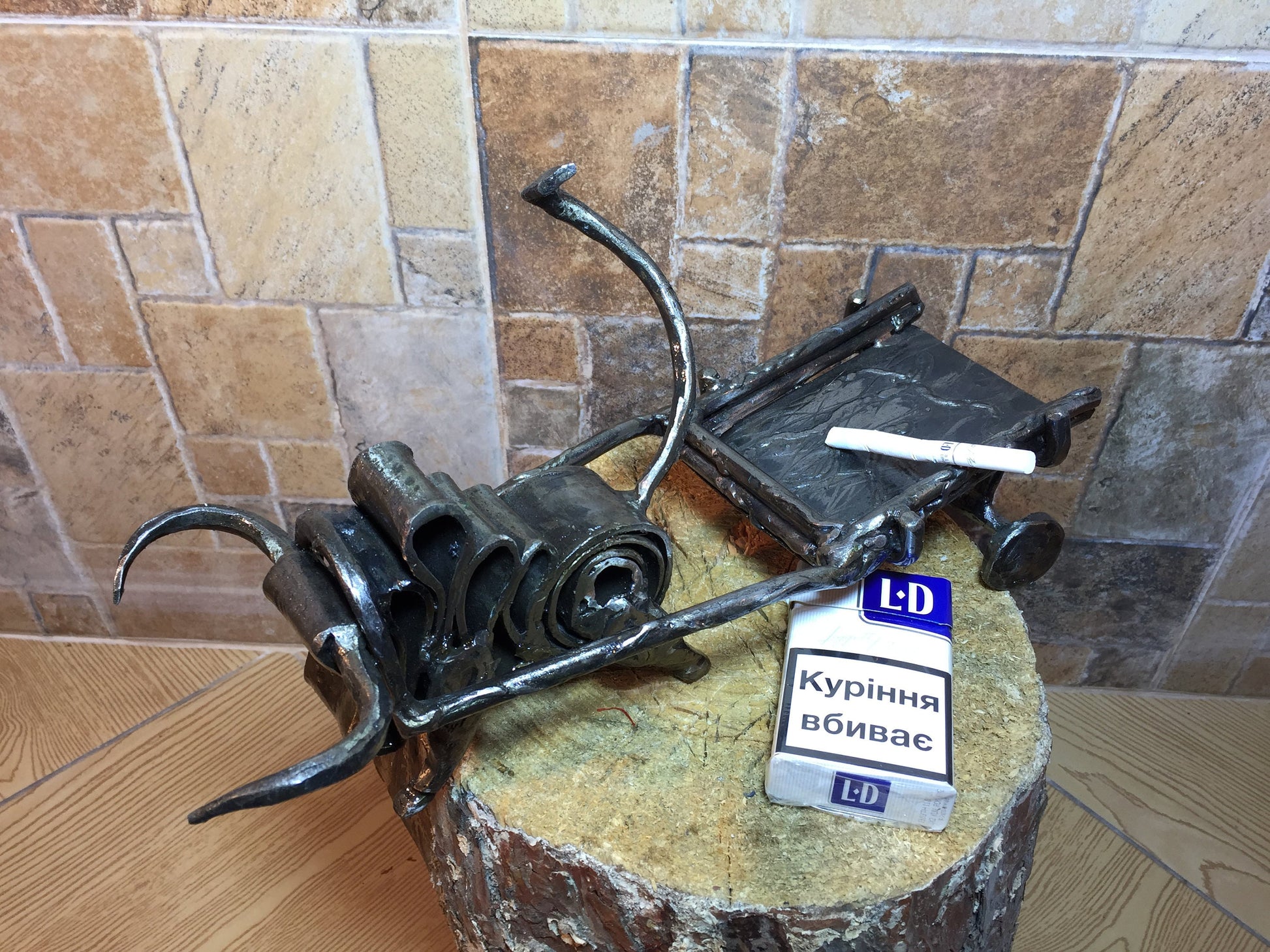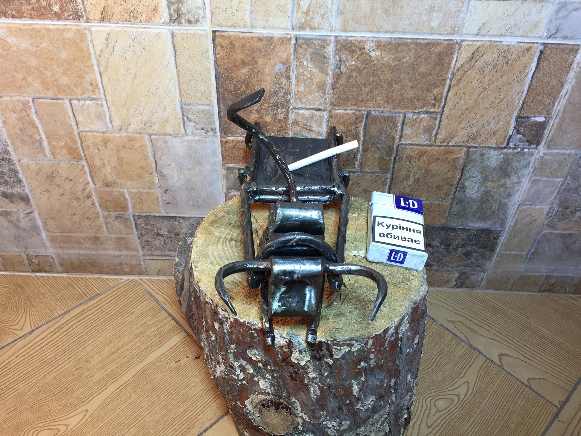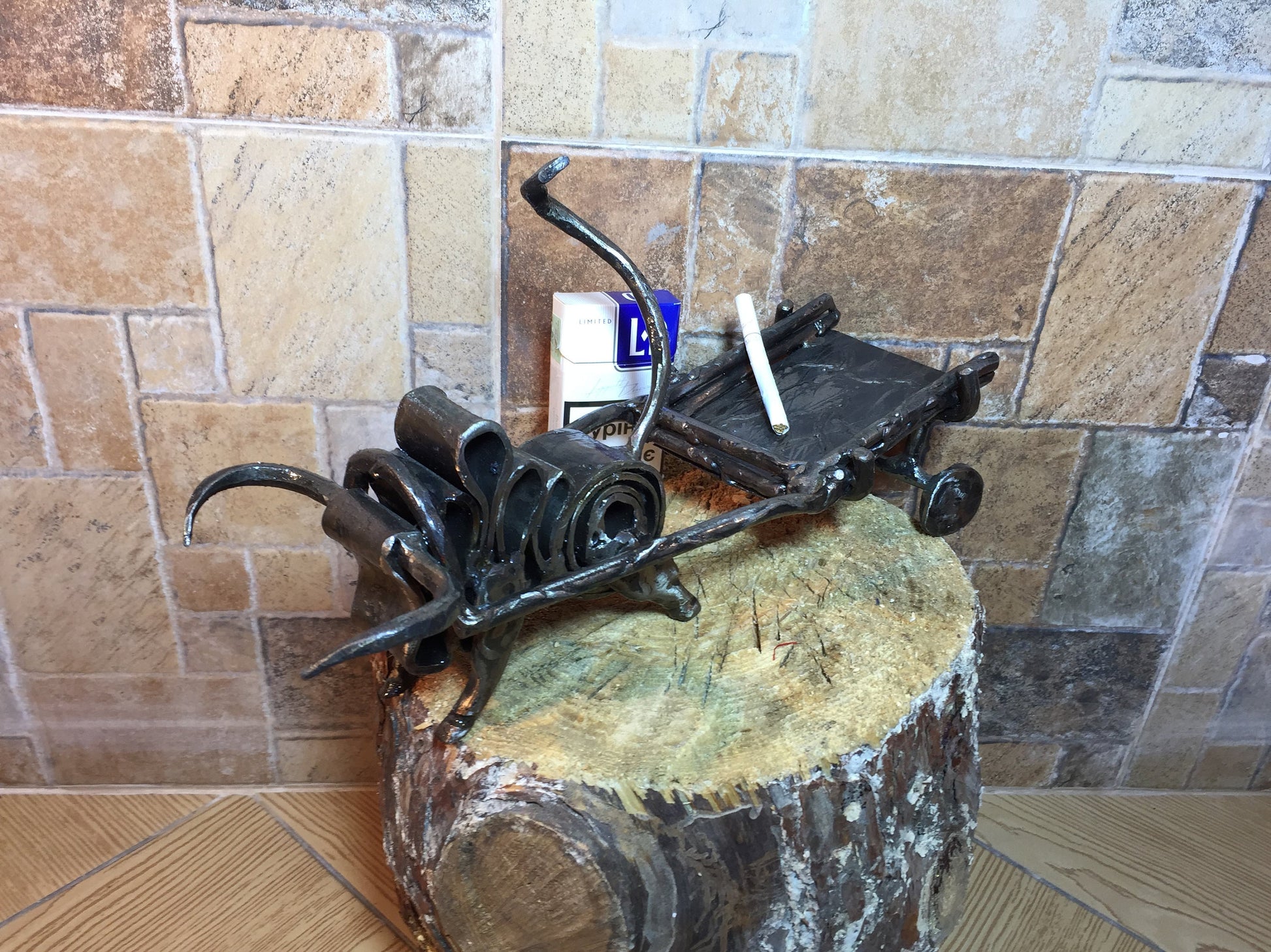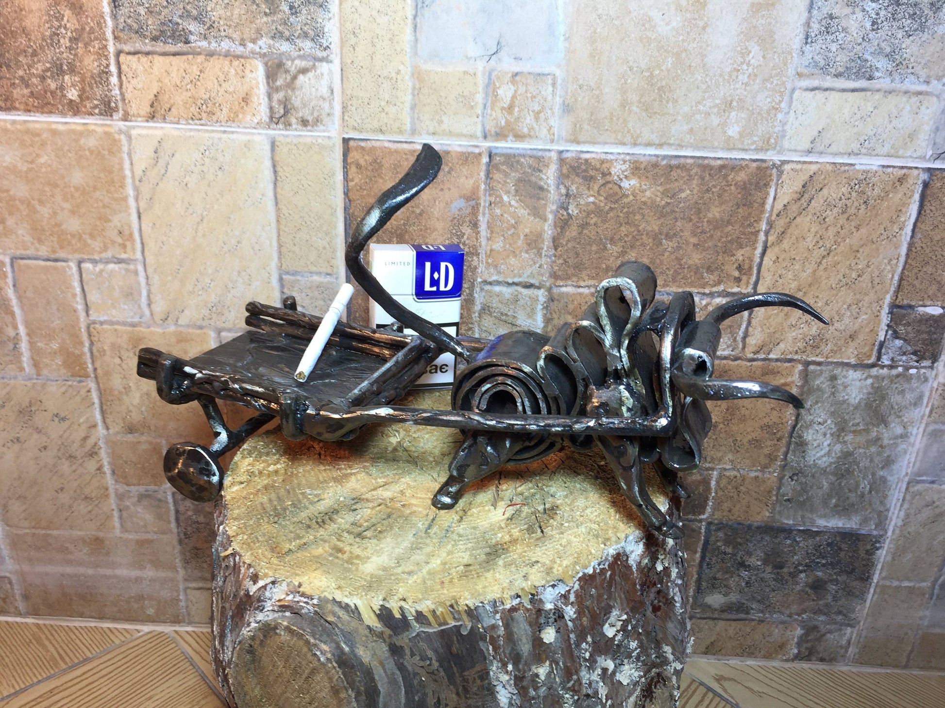 An ashtray can be not a usual tray but a masterpiece which decorates your house and outlines the features of your interior. Here is a hand forged ashtray in a style of a bull with a hammer holder.