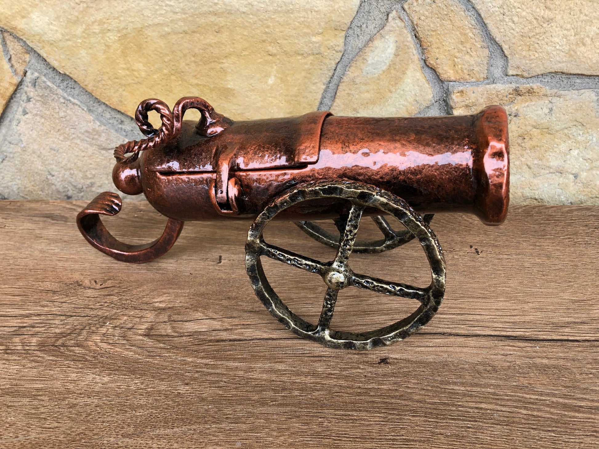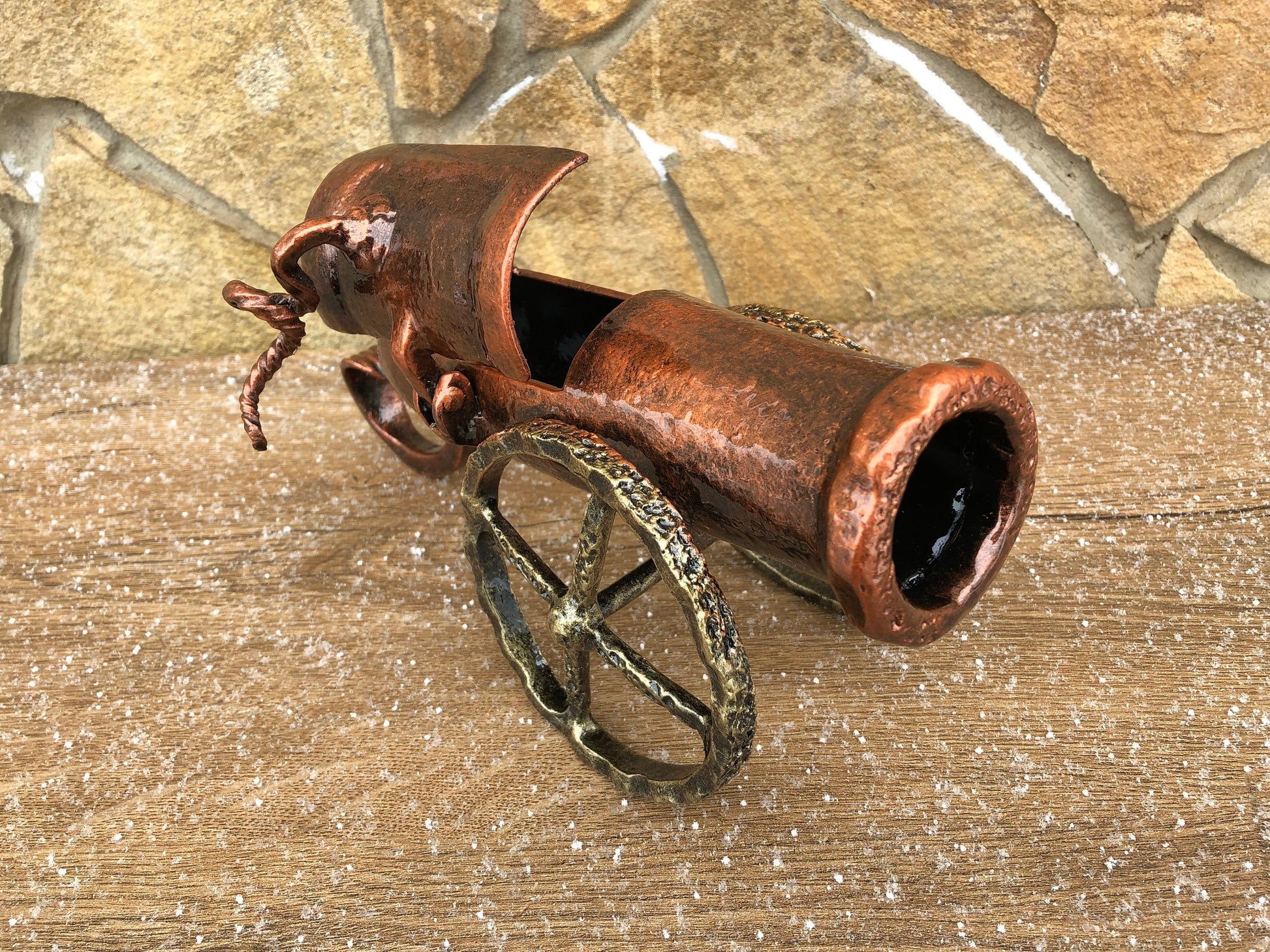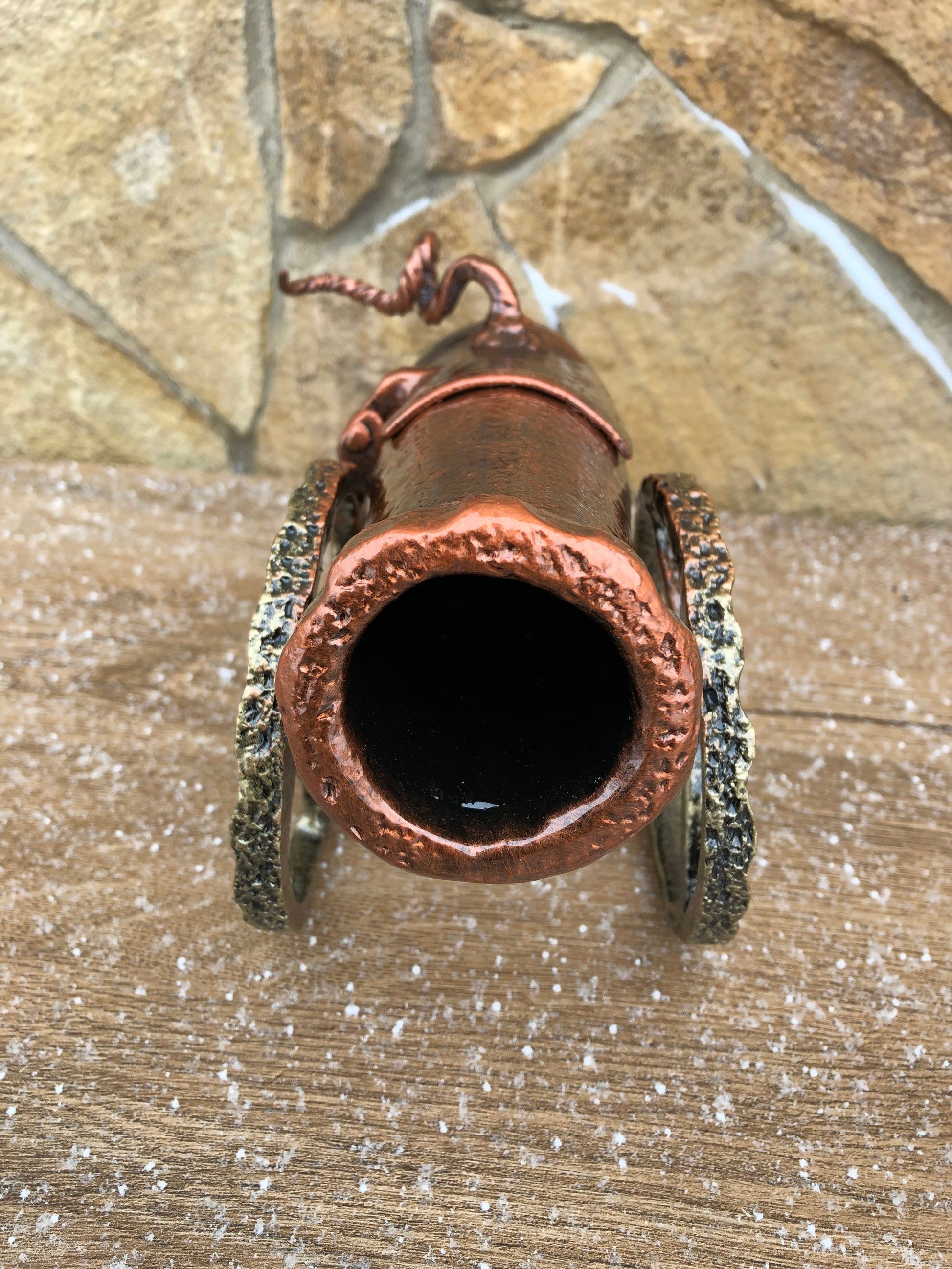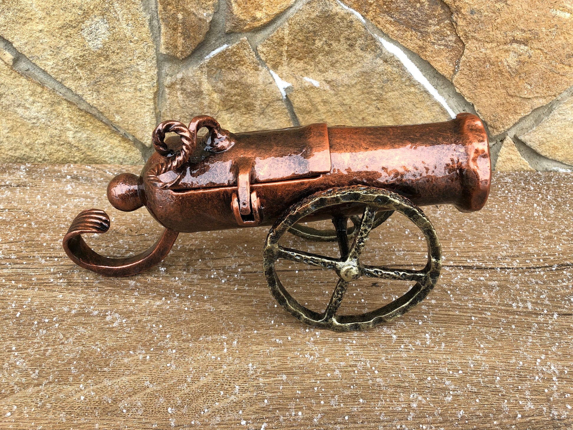 An ashtray can be not a usual ash tray but a masterpiece which decorates your house and outlines the features of your interior. Here is a forged ashtray in a view of a nice canon. On the top of it there is a match to pull for opening. You can open it while smoking and you can close it after that. You can place a pack of cigarettes on the opened cover of a canon.
