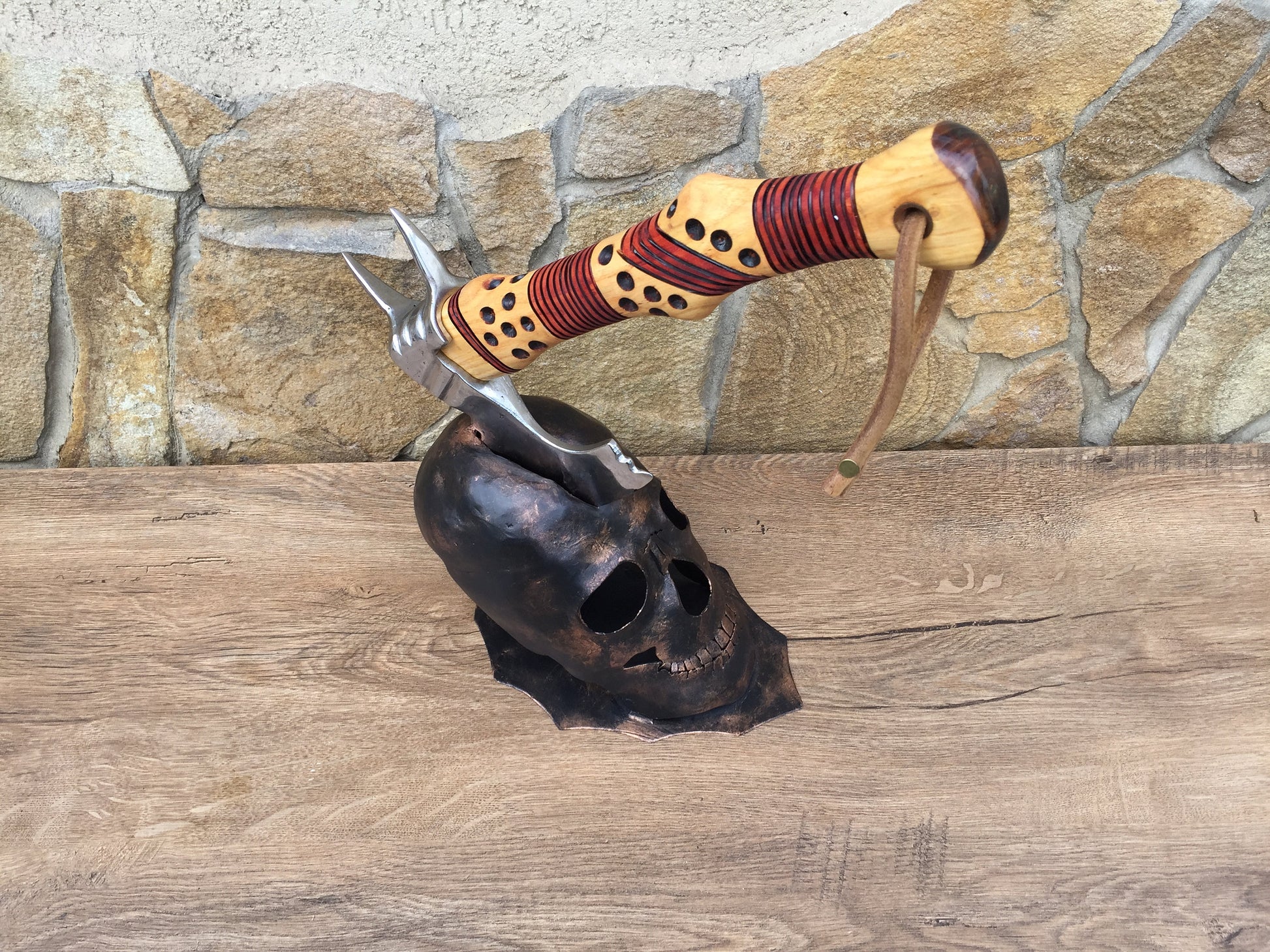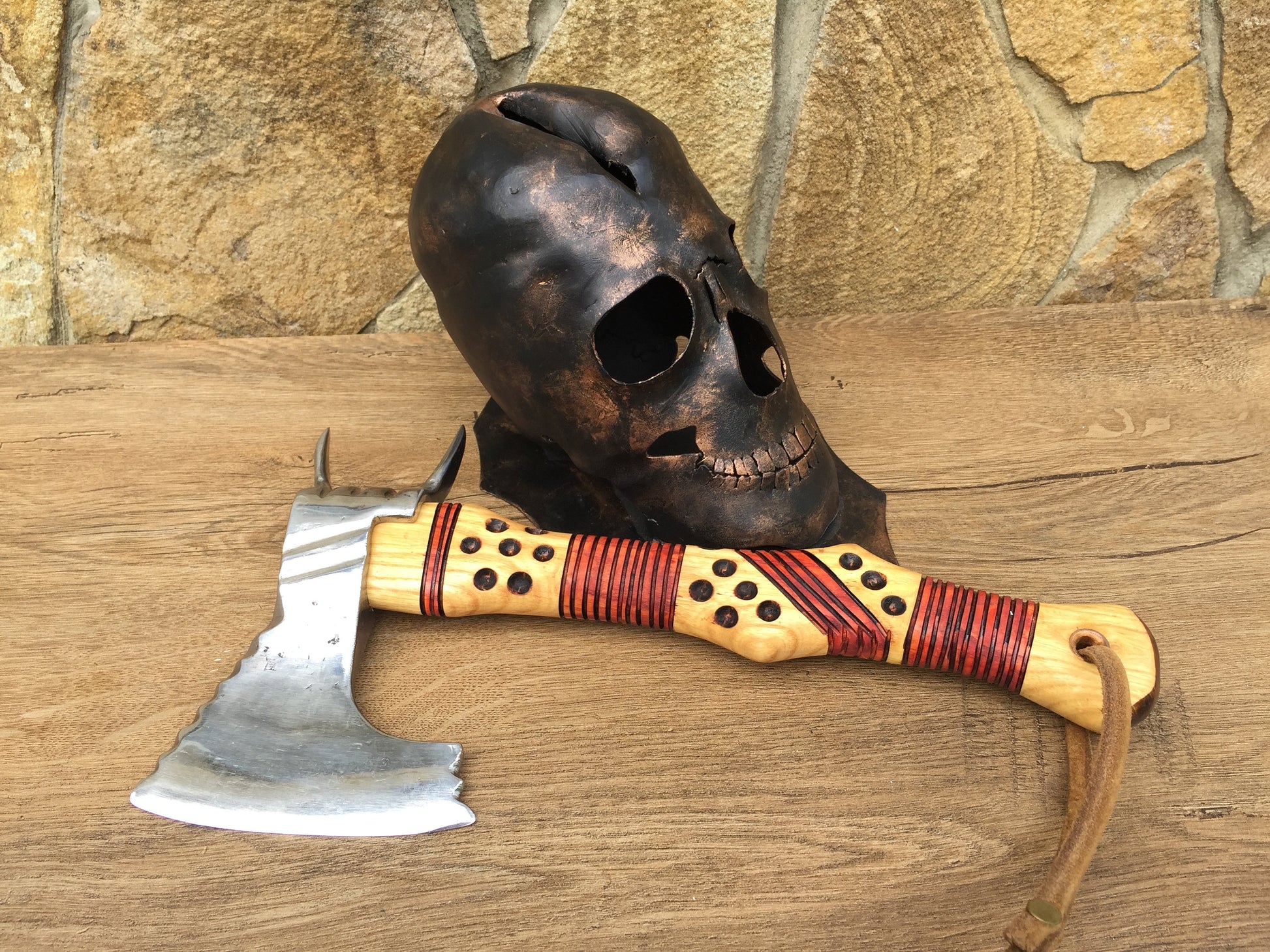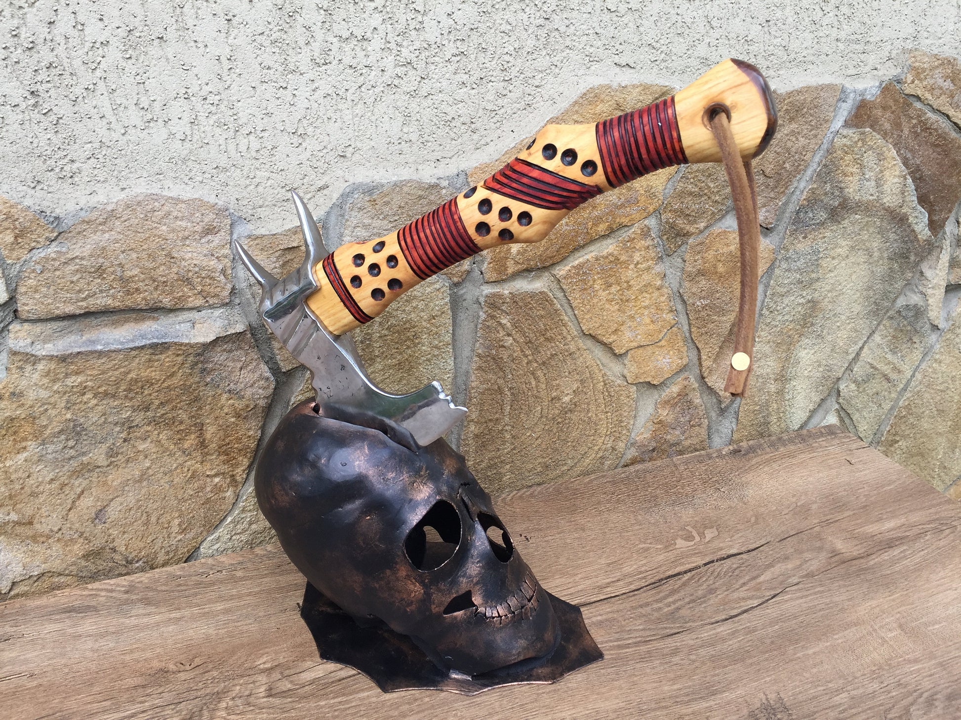 Here is an axe holder in a view of a skull. You can place the axe into a slot in the skull. It look very decorative. The skull looks very realistic!
