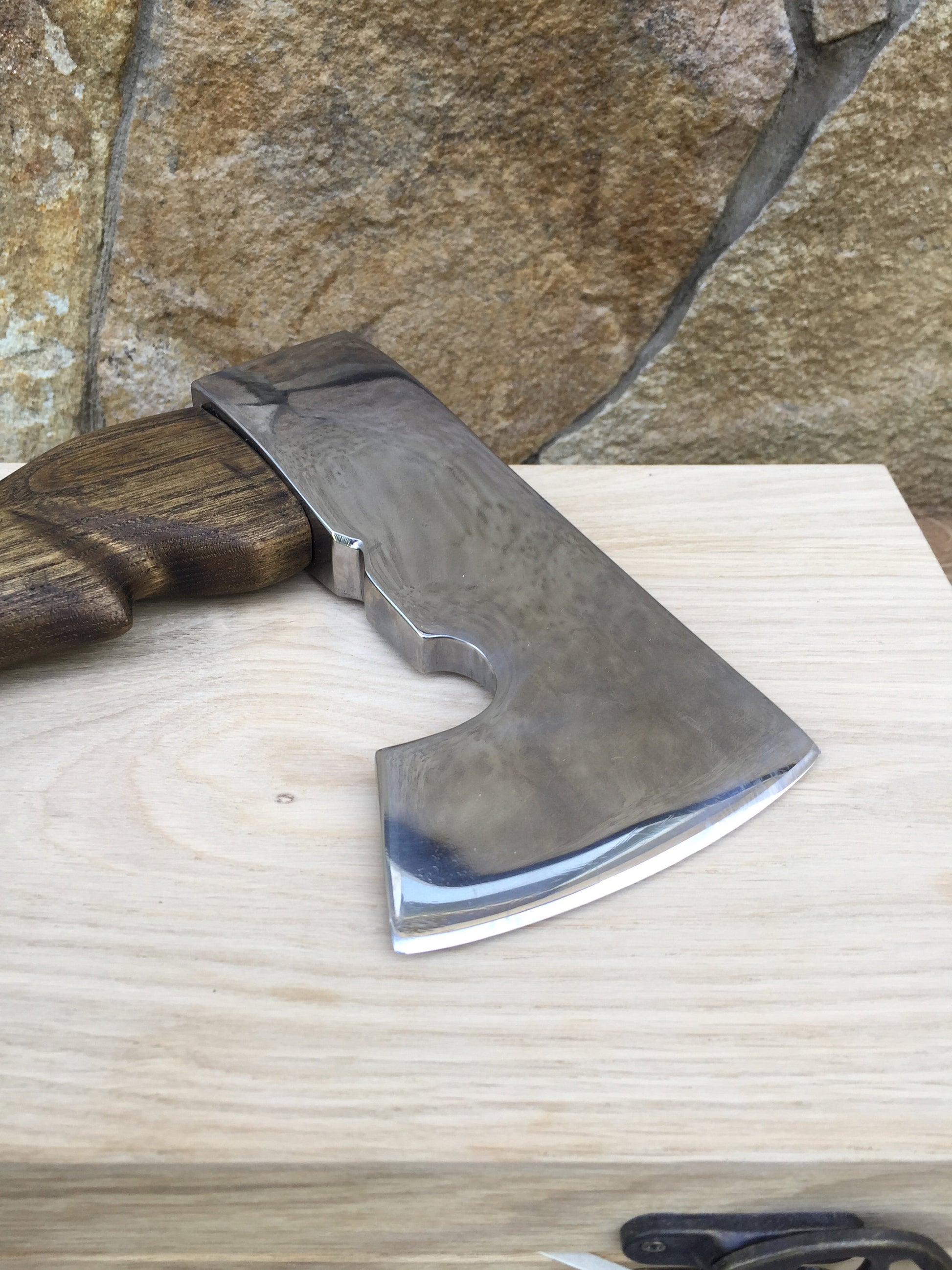 A compact outdoors axe, with a mirror surface axe head, hand-forged and made from carbon steel using traditional blacksmith methods. The steel is stuck several times, increasing its density and thereby the durability of the axe. Perfect for packing in a rucksack, the axe can also be worn on a belt. It will be a perfect companion in your ventures through the wilds, through the woods of the pacific northwest, or at the cabin to make kindling to warm your hearthside. It has a wooden stump.