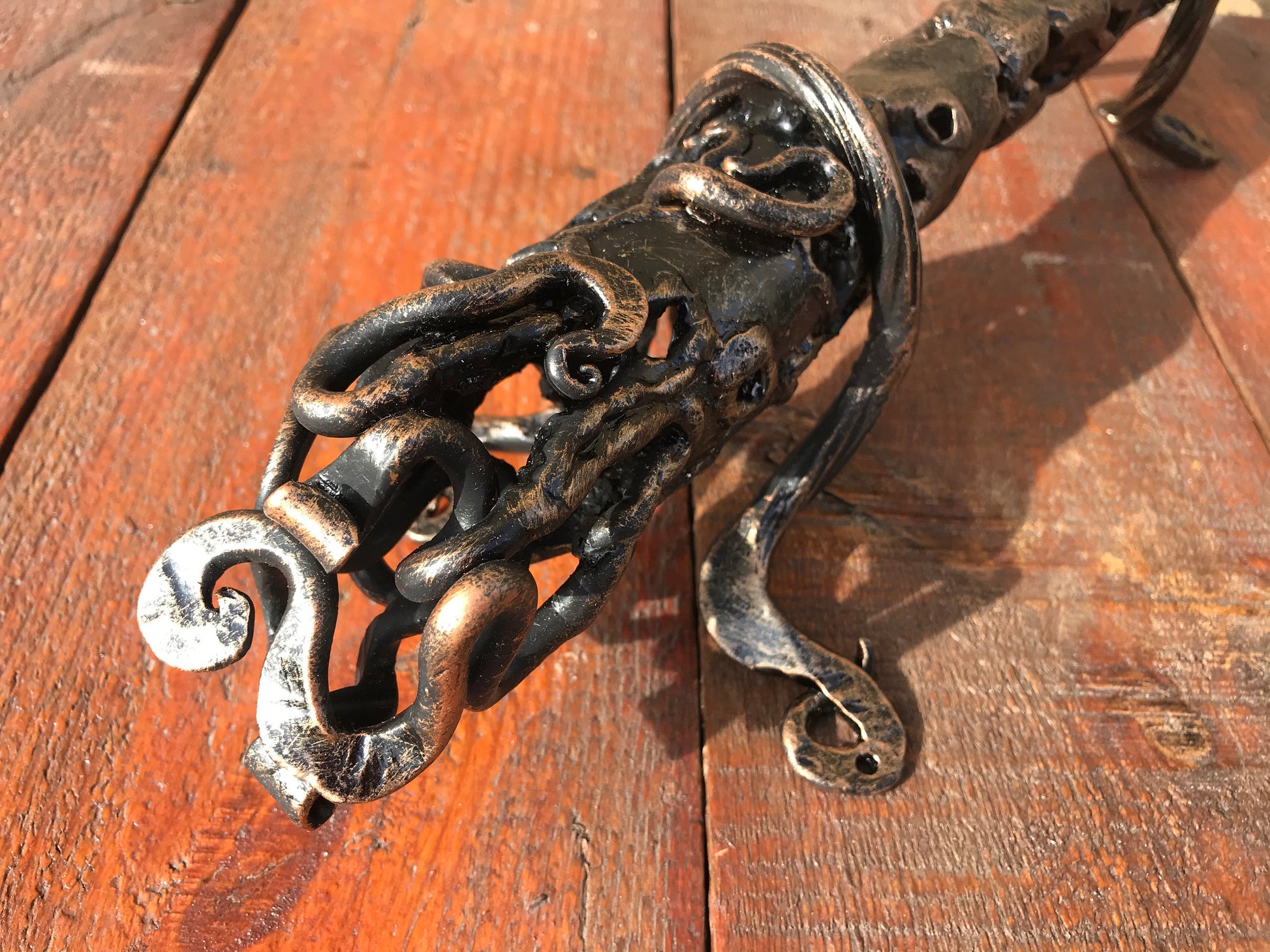 My Fine Art custom door pulls are created from labor intensive tried and tested techniques. Each custom pull is fired by coal and anvil hammered into shape by the hands of my master blacksmiths. All of my custom door handles are made from solid hand forged wrought iron with a natural patina (I never use faux paint or power coating). Available in any size, style, and finish, my Custom Door Pulls can be custom fabricated in any design you can dream up. Order from my online listings the most suitable door pull for further customization or send in your own drawings or photos or send me the preferred description to get started. Order your custom door handles blacksmithed to fine art standards wrought iron, knobs, knockers and door pulls in any style and design – limited by only your imagination – from “Forged Commodities”. Custom designed door pulls and handles created by the hands of Ukrainian craftsmen to age old black smithing tradition. “Dream” designer door pulls, knockers & custom handles by “Forged Commodities” – we ship worldwide.