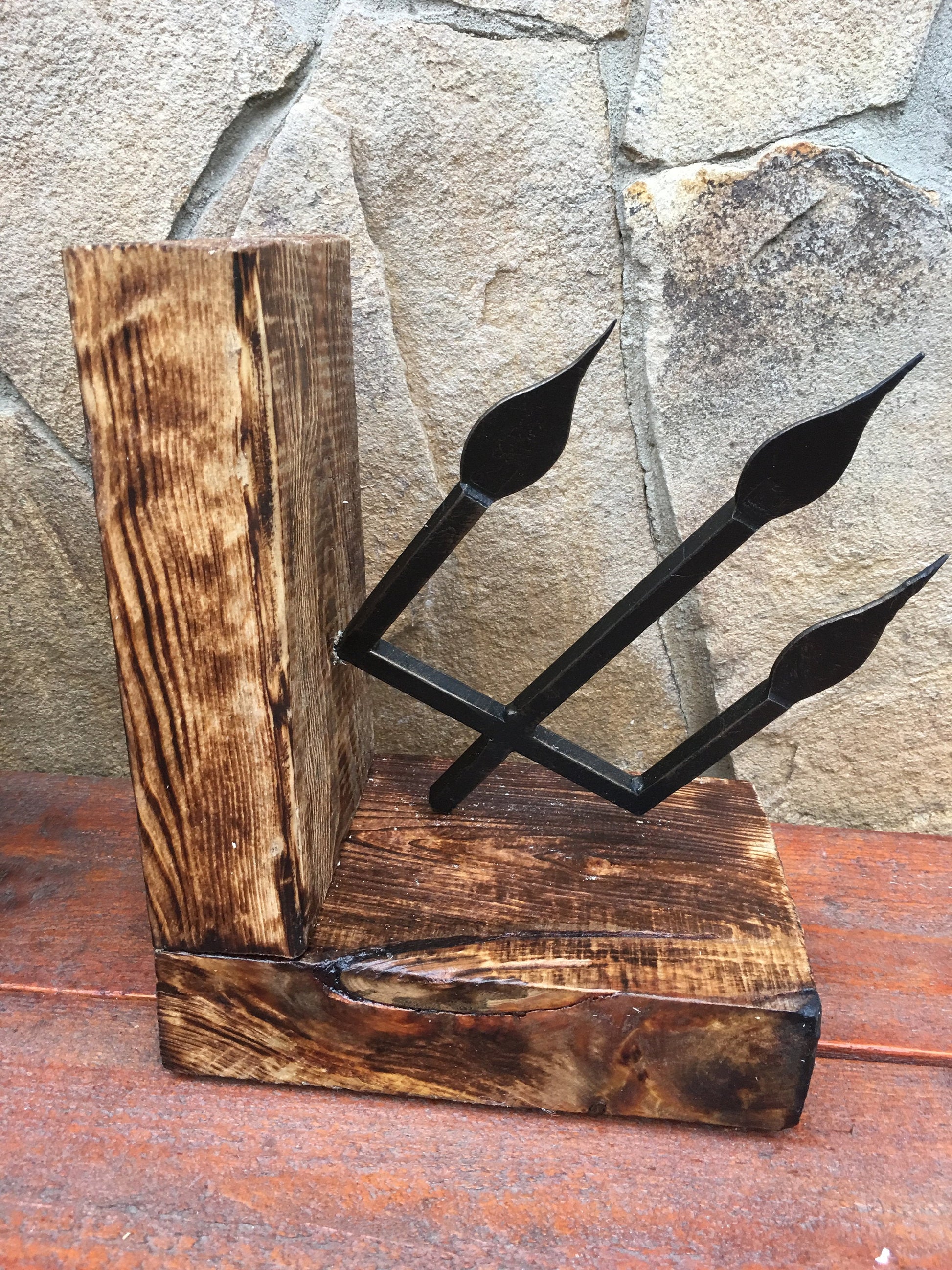 Here is a pair of gothic bookends with a trident made in a mid century style. The wood gets aged.