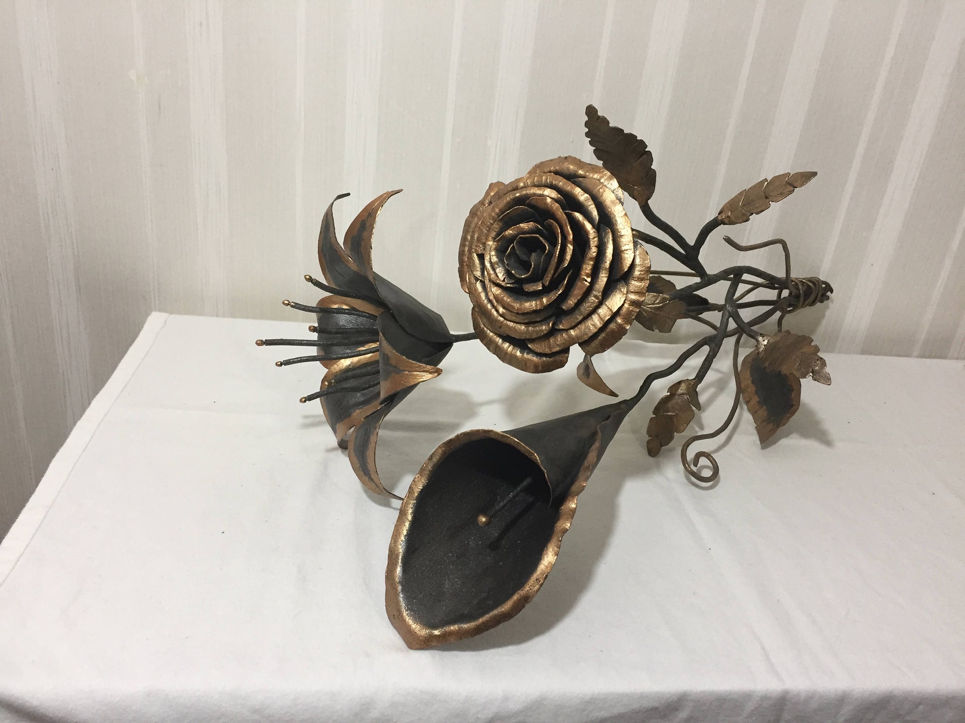 Here is a forged bouquet consisting of three flowers: calla, rose, lily; art painted. The flowers are connected with a forged ribbon. A blacksmith handed over exactly the beauty of these flowers. It is a nice thing for a gift, for a wedding, for a birthday or just as a house decor. Price consists of three flowers as a bouquet.