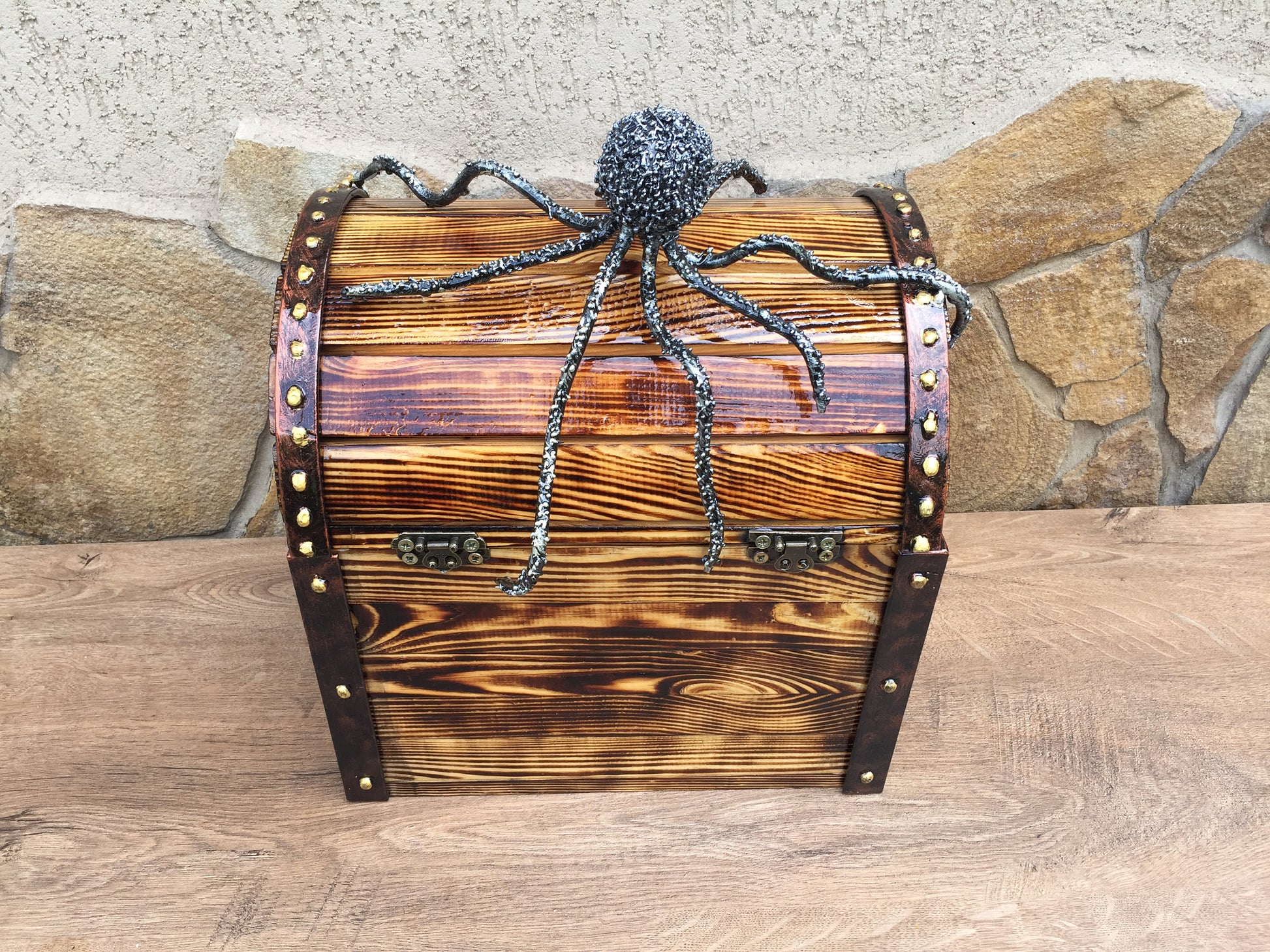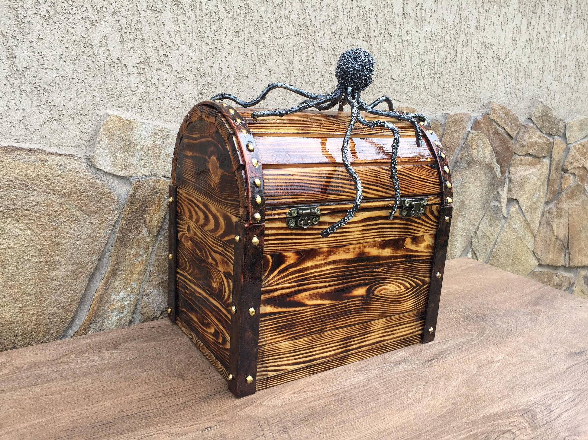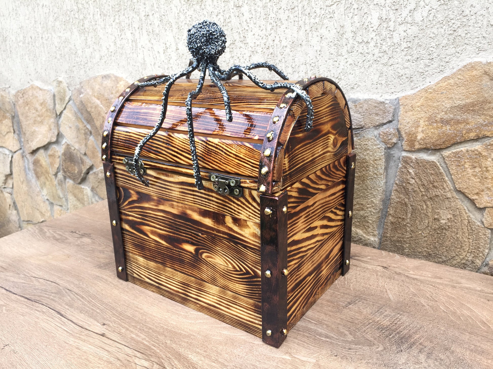 Here is a nice hand made wooden box with a hand forged octopus. A nice present for a wedding, 5th wedding anniversary (wooden anniversary), for expressing love, for engagement, Valentine's Day, as for home decor and many other gifting occasions! It is a cool interior decor!