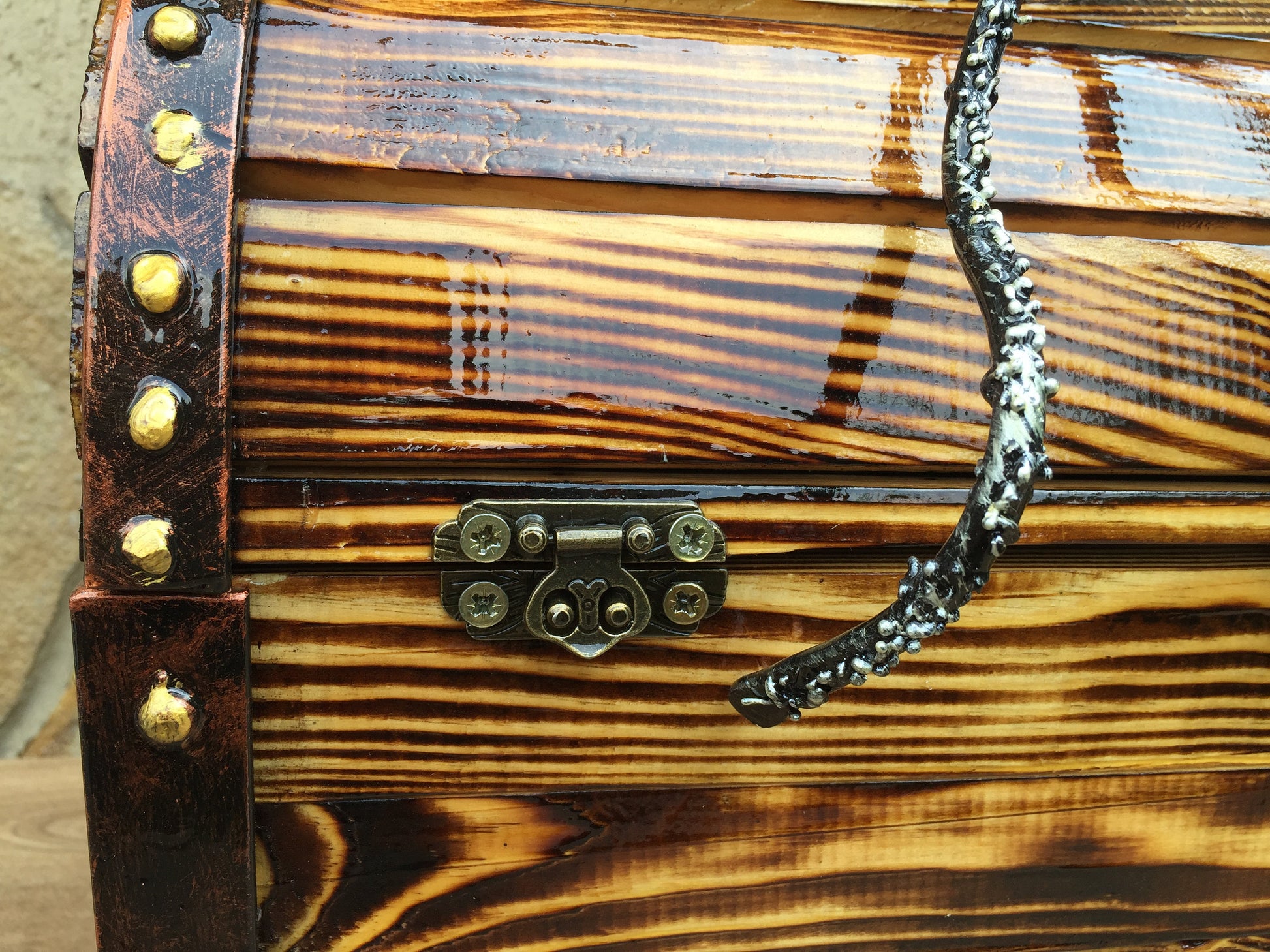 Colour of the box: differen shadows of brown, not painted, laquered. Octopus - black covered by silver patina, lacquered. Rims of the wooden box are made of iron, painted in black and covered by copper patina with colden dots, lacquered.