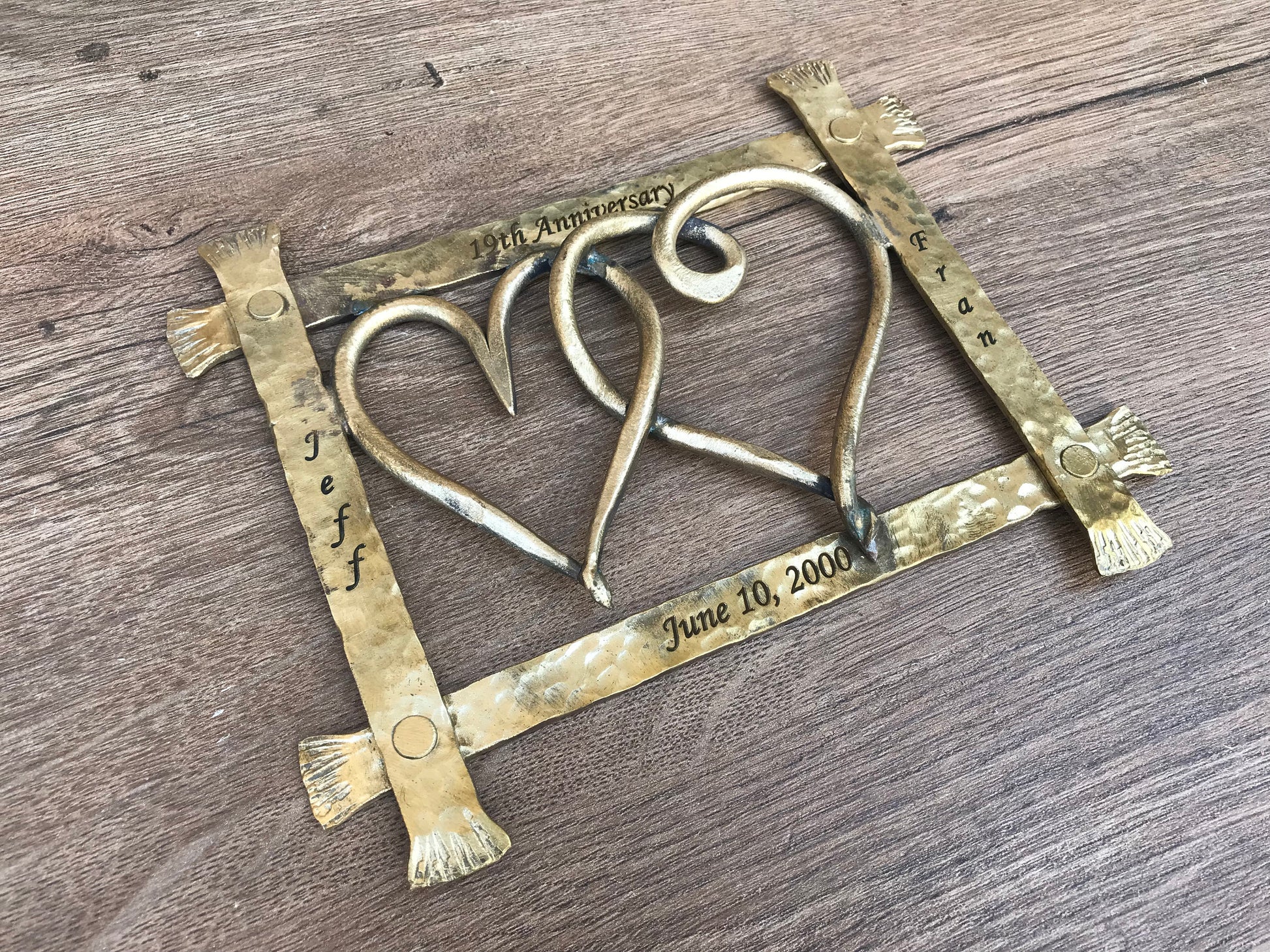 Here is a nice hand hammered bronze frame with two hearts connected with one another. A nice gift for a wedding, 8th wedding anniversary (bronze anniversary), 19th anniversary (a bronze gift is connected with this anniversary), for expressing love, for engagement, Valentine's Day and some other gifting occasions!