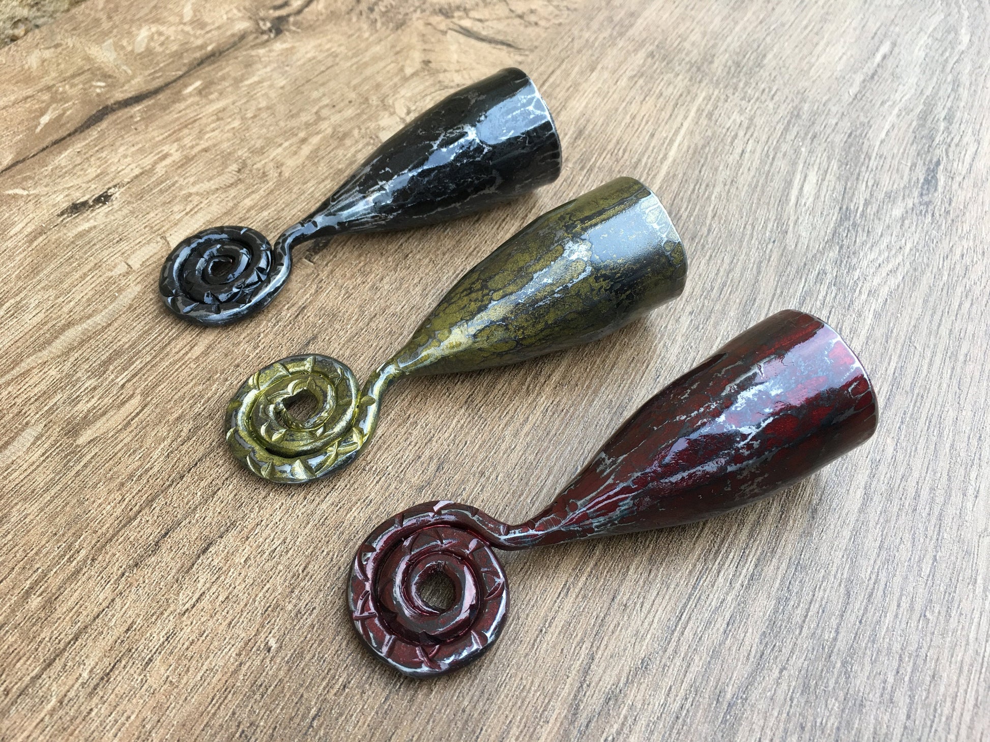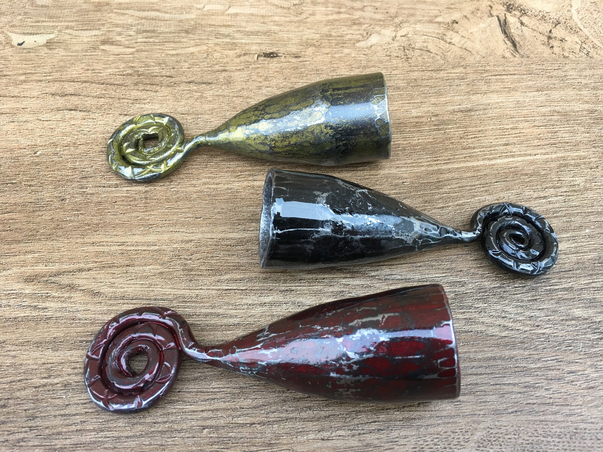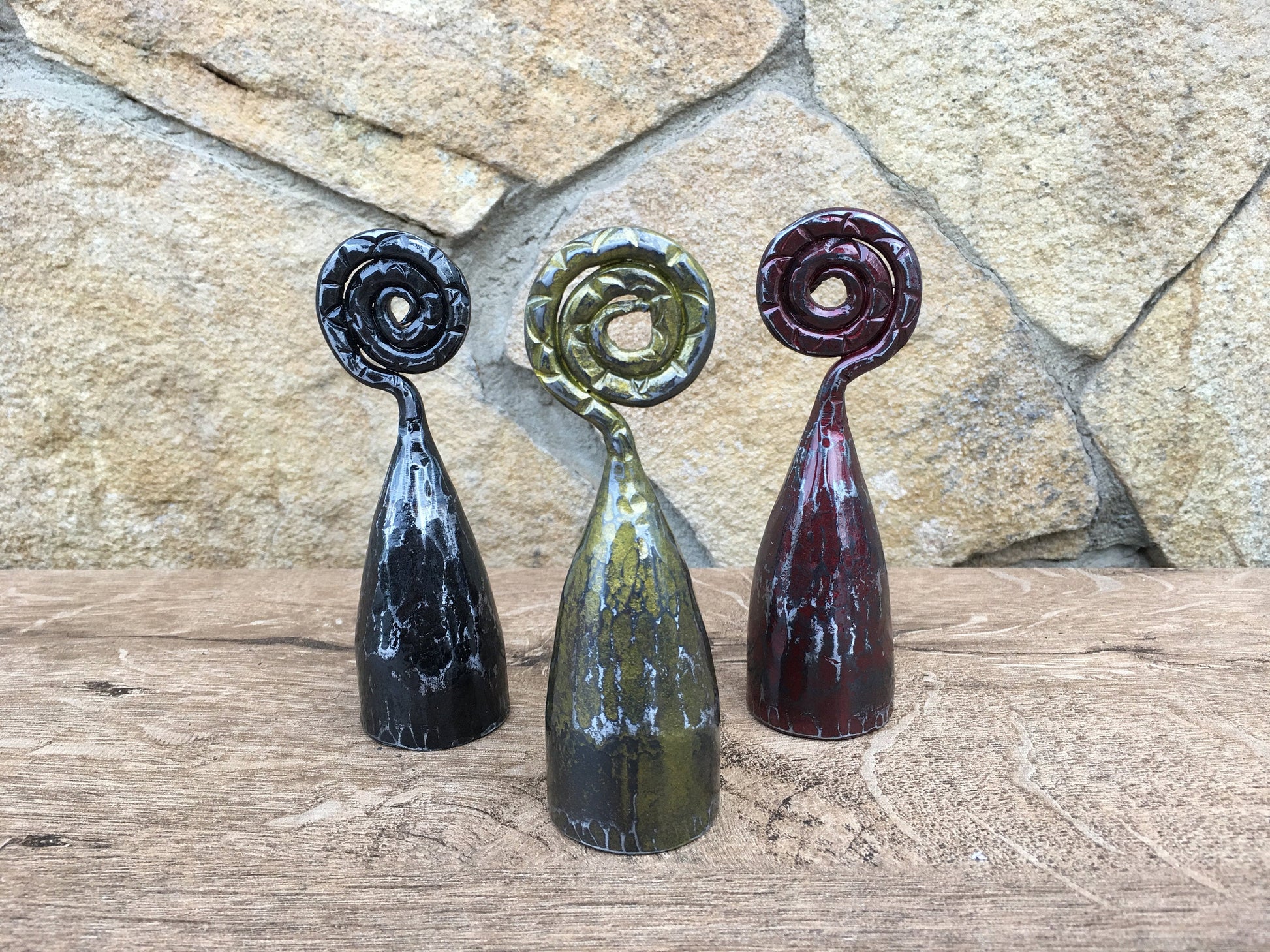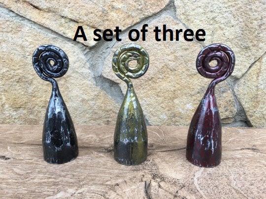 Are you looking for a nice candle snuffer? Gifting occasion? Or just a home decor? Here is a set of three hand forged candle snuffers with scrolled handles. It looks very festive and decorative! It deserves to be a cool gift! It is a functional piece of art!
