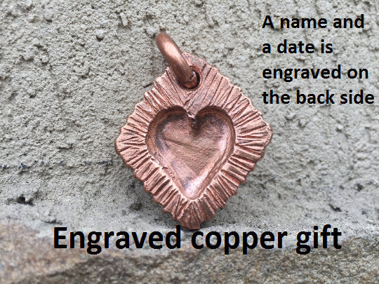 It is done from 100% copper. Hand made. Quite heavy for its size! Due to the thickness of this item (0.12") the heart is carved in the centre of the item.