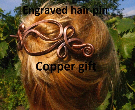 Here is a nice hand hammered copper hair pin. A nice present for a wedding, 7th wedding anniversary (copper anniversary), for expressing love, for engagement, Valentine's Day and some other gifting occasions!