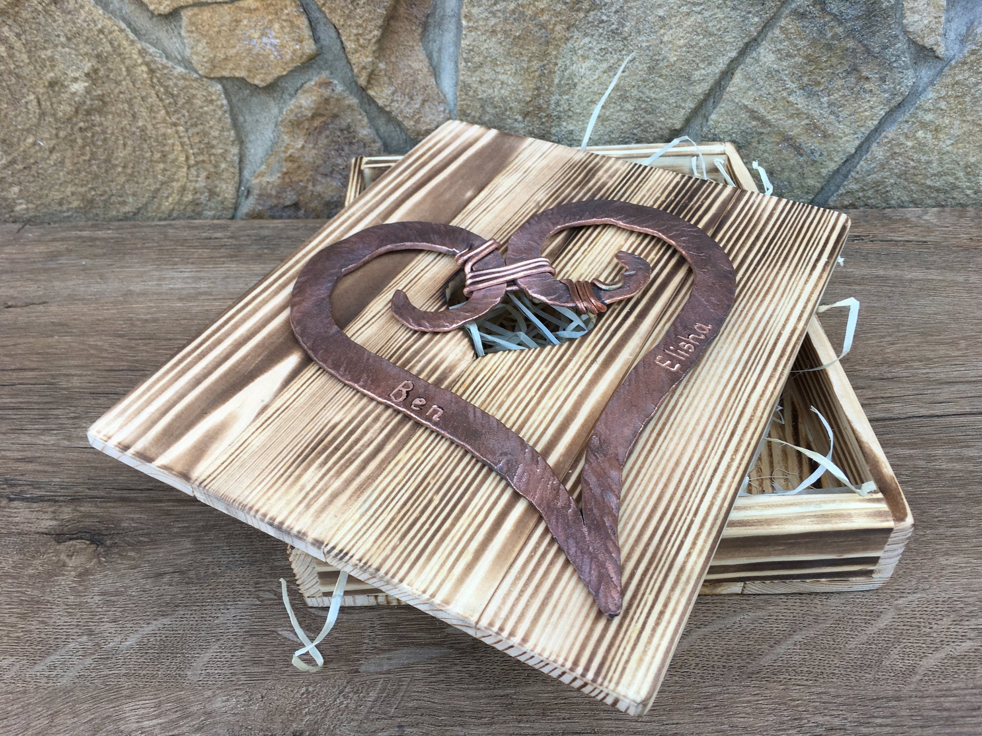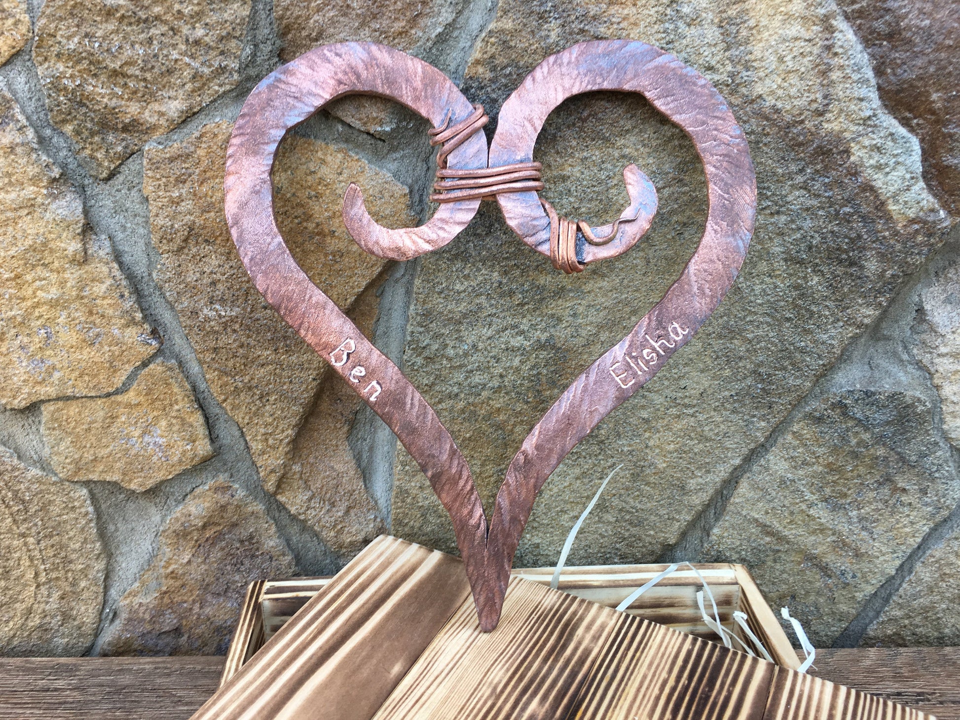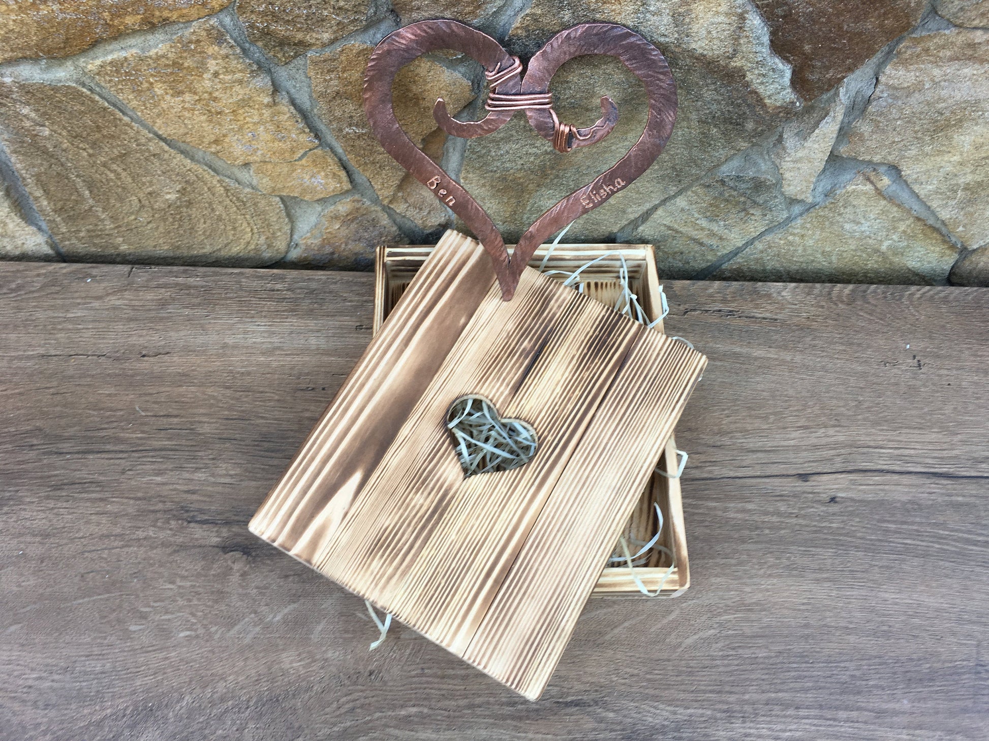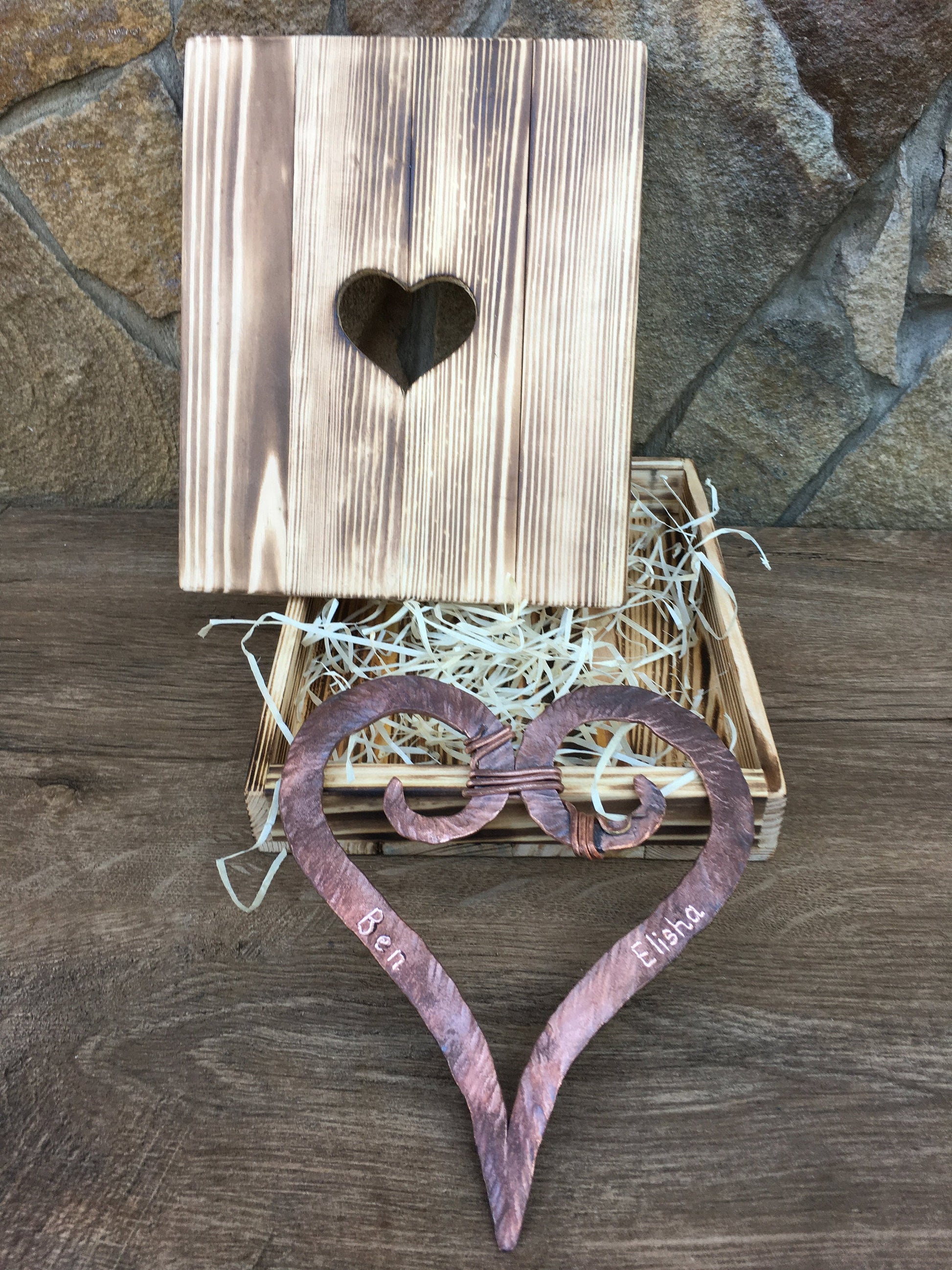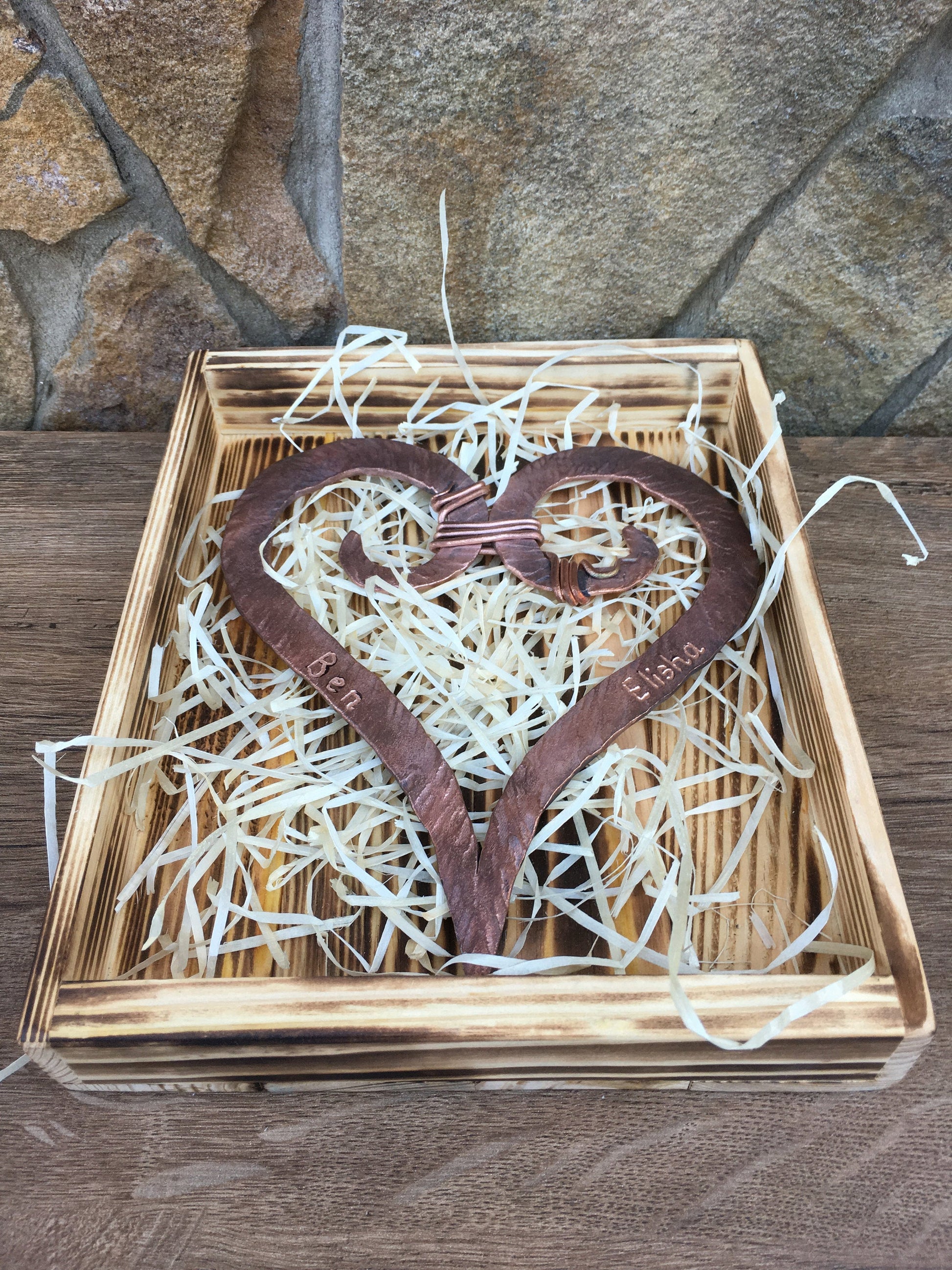 Here is a nice hand hammered copper heart with engraving in a wooden gift box. A nice gift for a wedding, 7th wedding anniversary (copper anniversary), for expressing love, for engagement, Valentine's Day and some other gifting occasions!