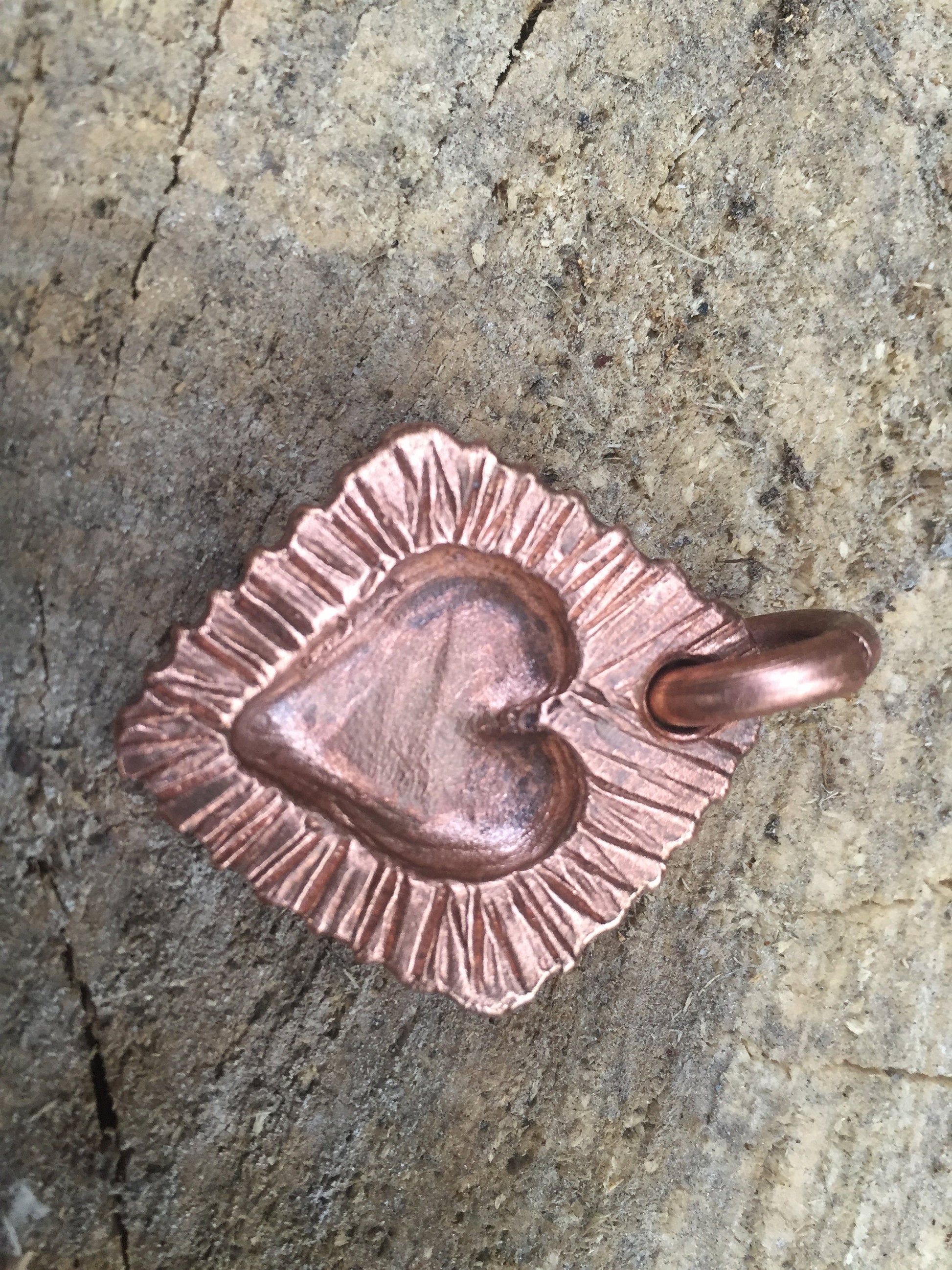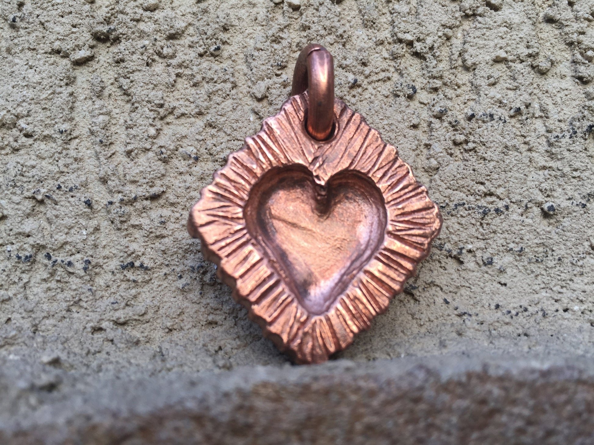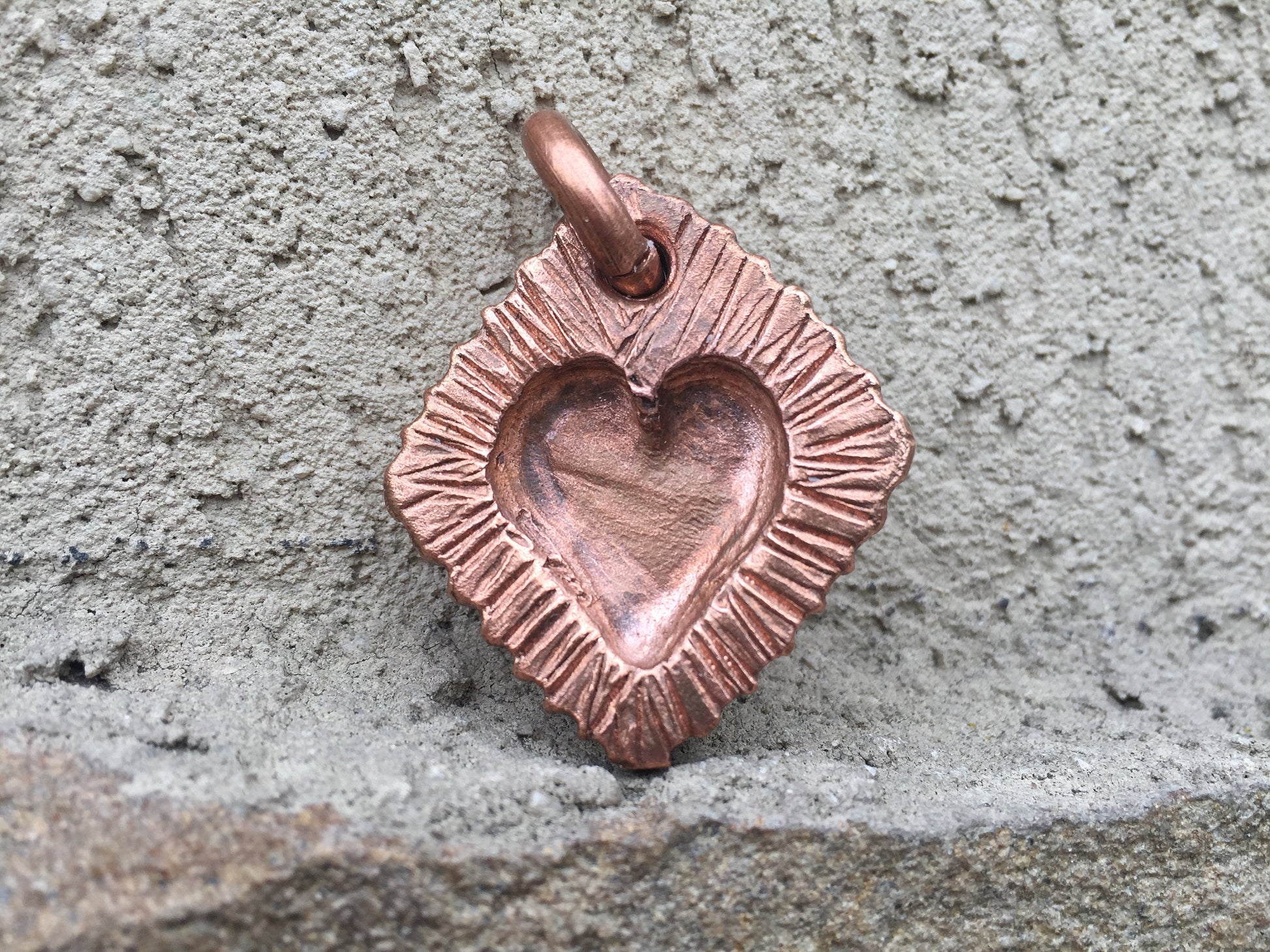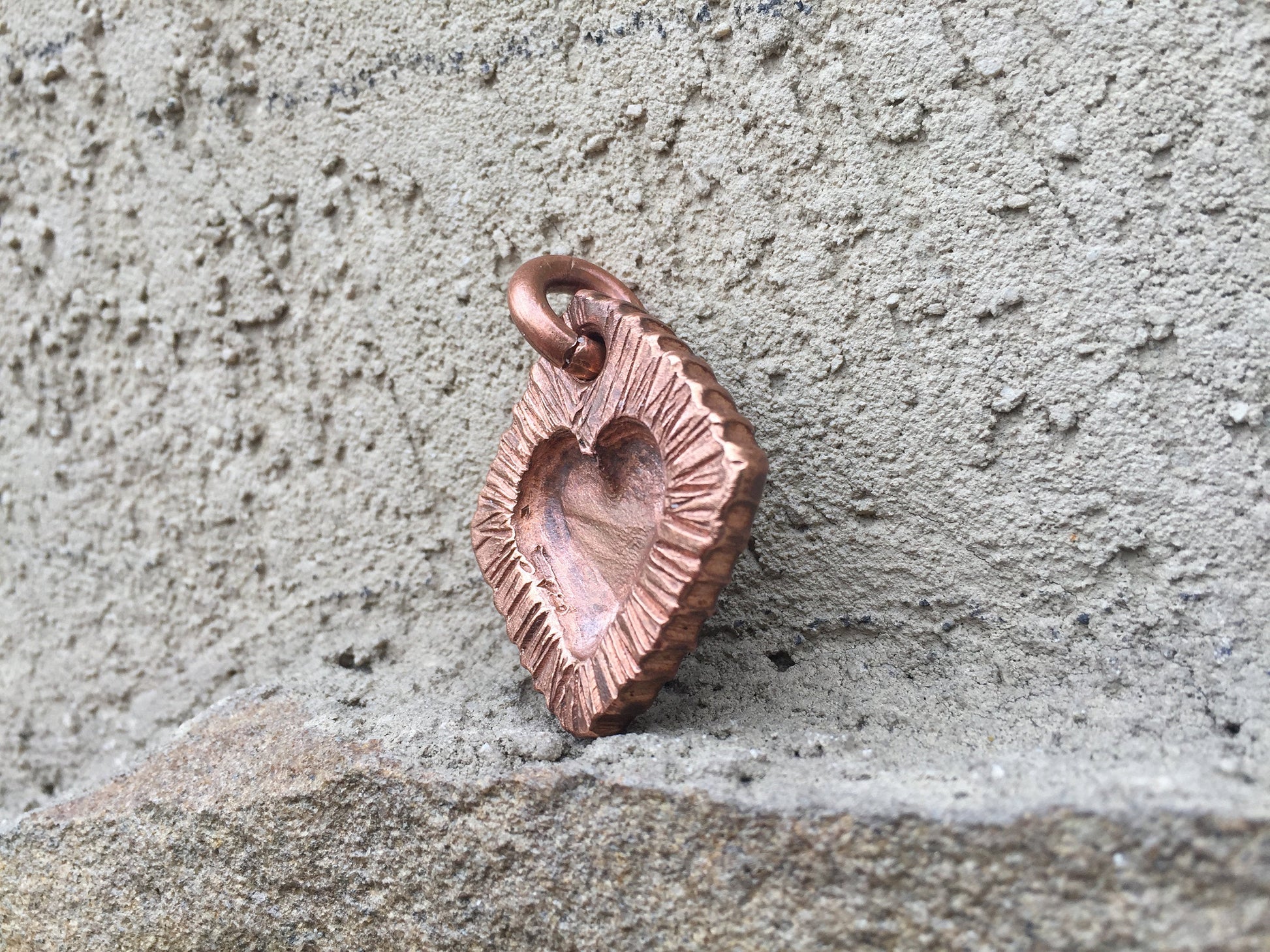 It is done from 100% copper. Hand made. Quite heavy for its size! Due to the thickness of this item (0.12") the heart is carved in the centre of the item.