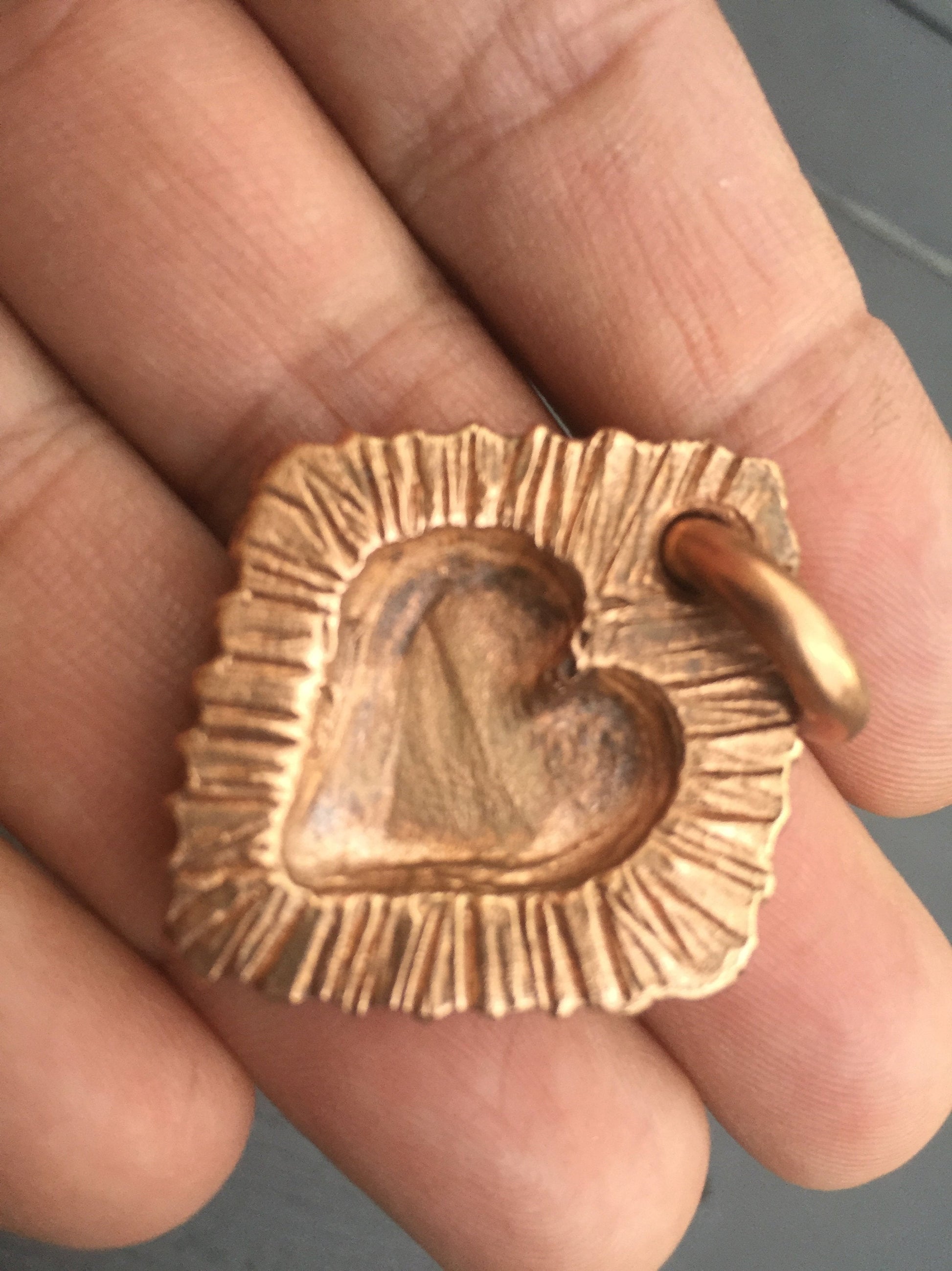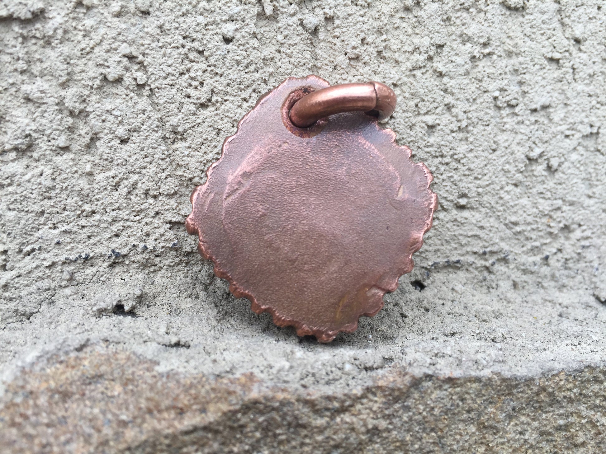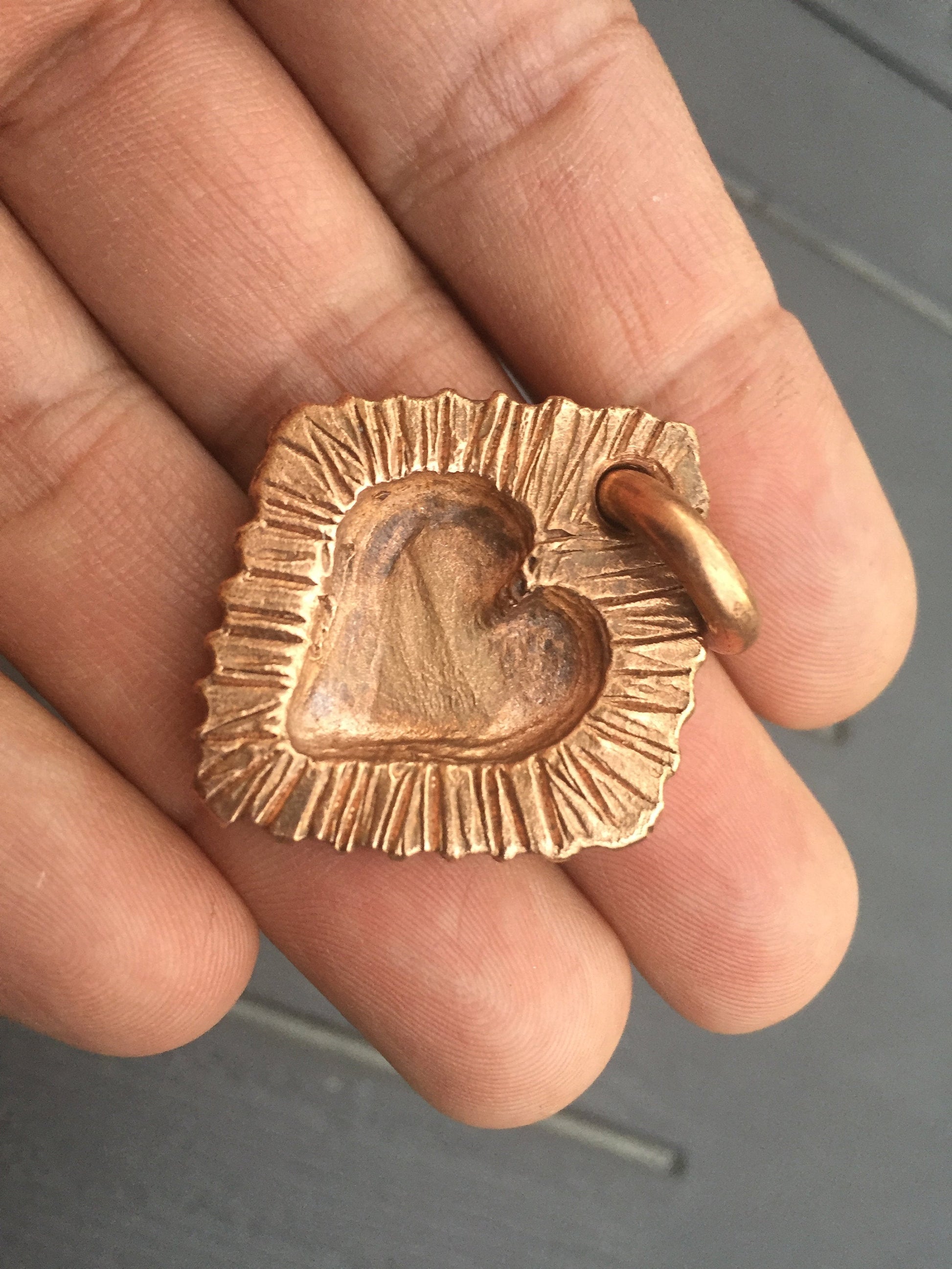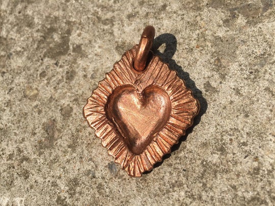It is done from 100% copper. Hand made. Quite heavy for its size! Due to the thickness of this item (0.12") the heart is carved in the centre of the item.