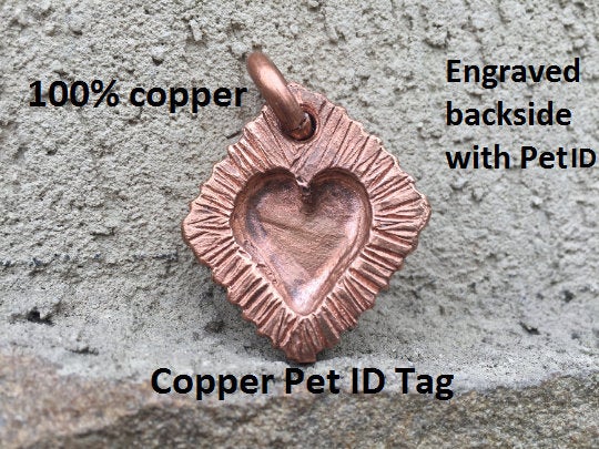 Here is a nice hand hammered copper pet ID tag. A nice gift for a pet lover! It has engraved/carved heart in the center. It can be engraved with a pet name and a telephone number on its backside to make it personal. Your pet deserves to have a luxury looking pet ID tag! It will last forever!