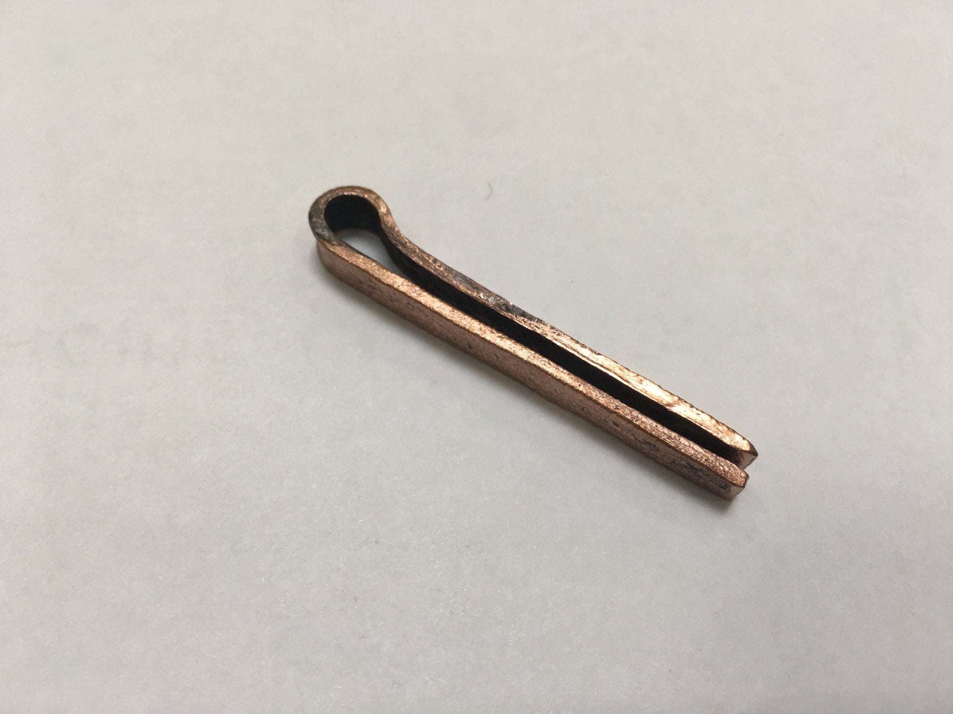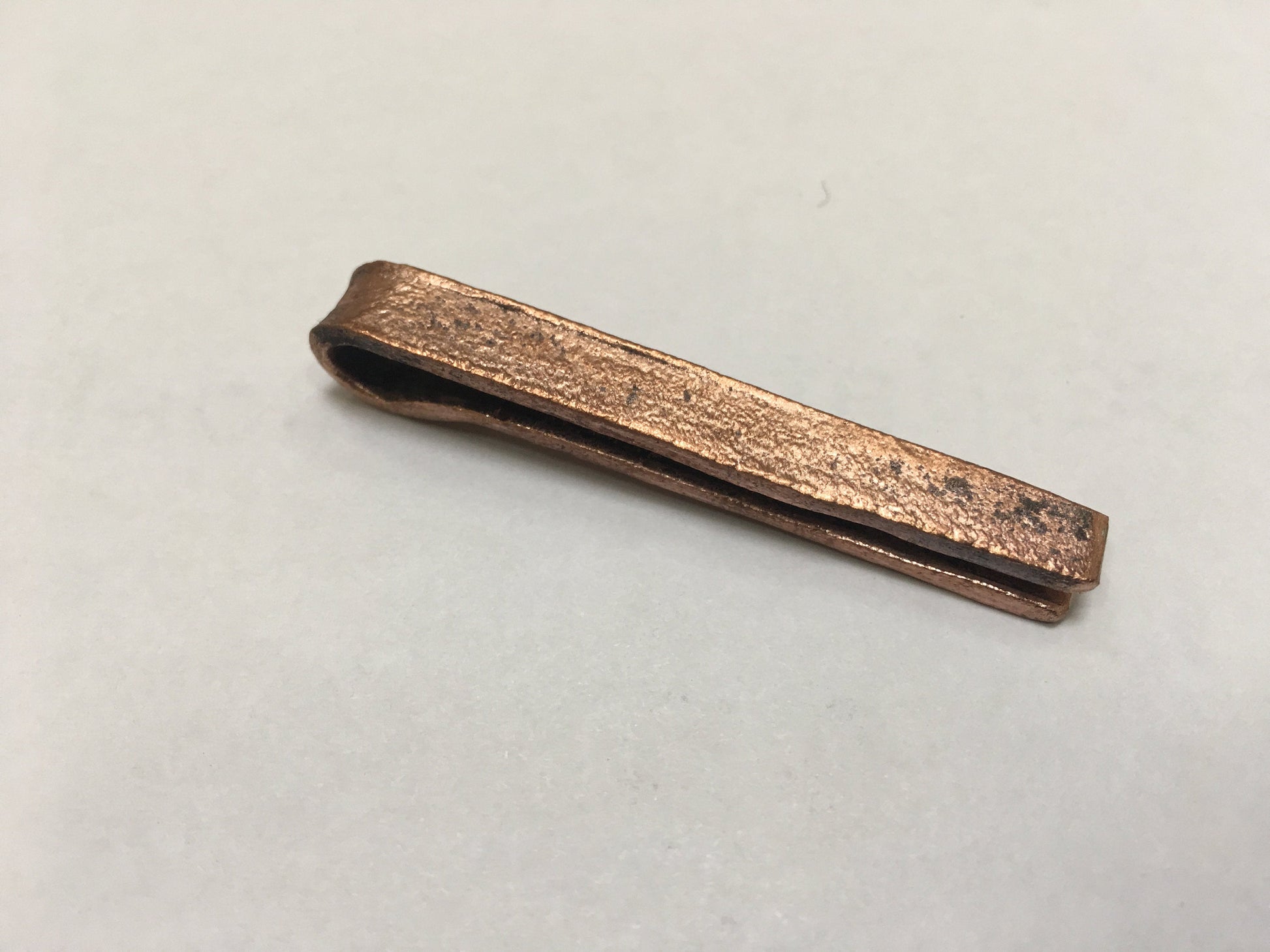 Here is a hand forged copper tie clip. This is a great birthday gift, groomsmen gift, corporate gift, usher gift, groom gift, father of the bride gift, father of the groom gift, 7th anniversary gift (copper anniversary), Father's Day, Christmas gift for a grandfather, graduation gift or a gift for any other gifting occasions.