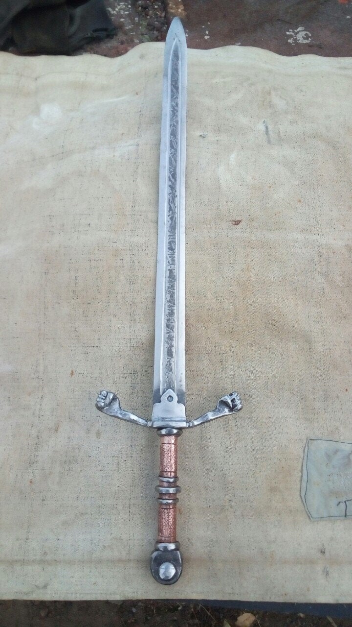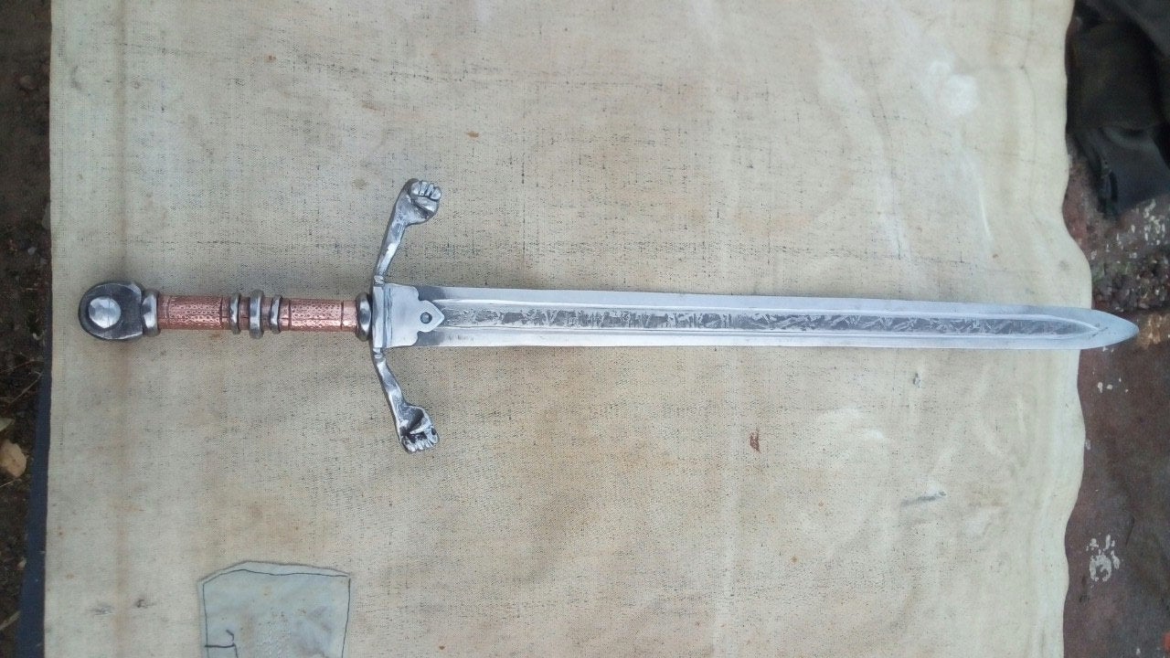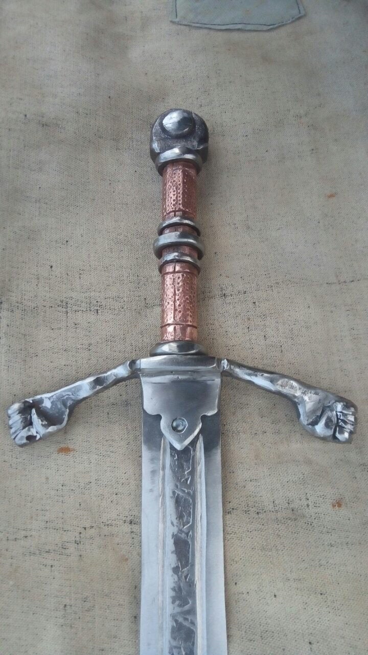 The handle has 2 arms and a copper. The sword blade is blunt. The handle has a screw to be connected with a blade. It will be shipped in disassembled condition.