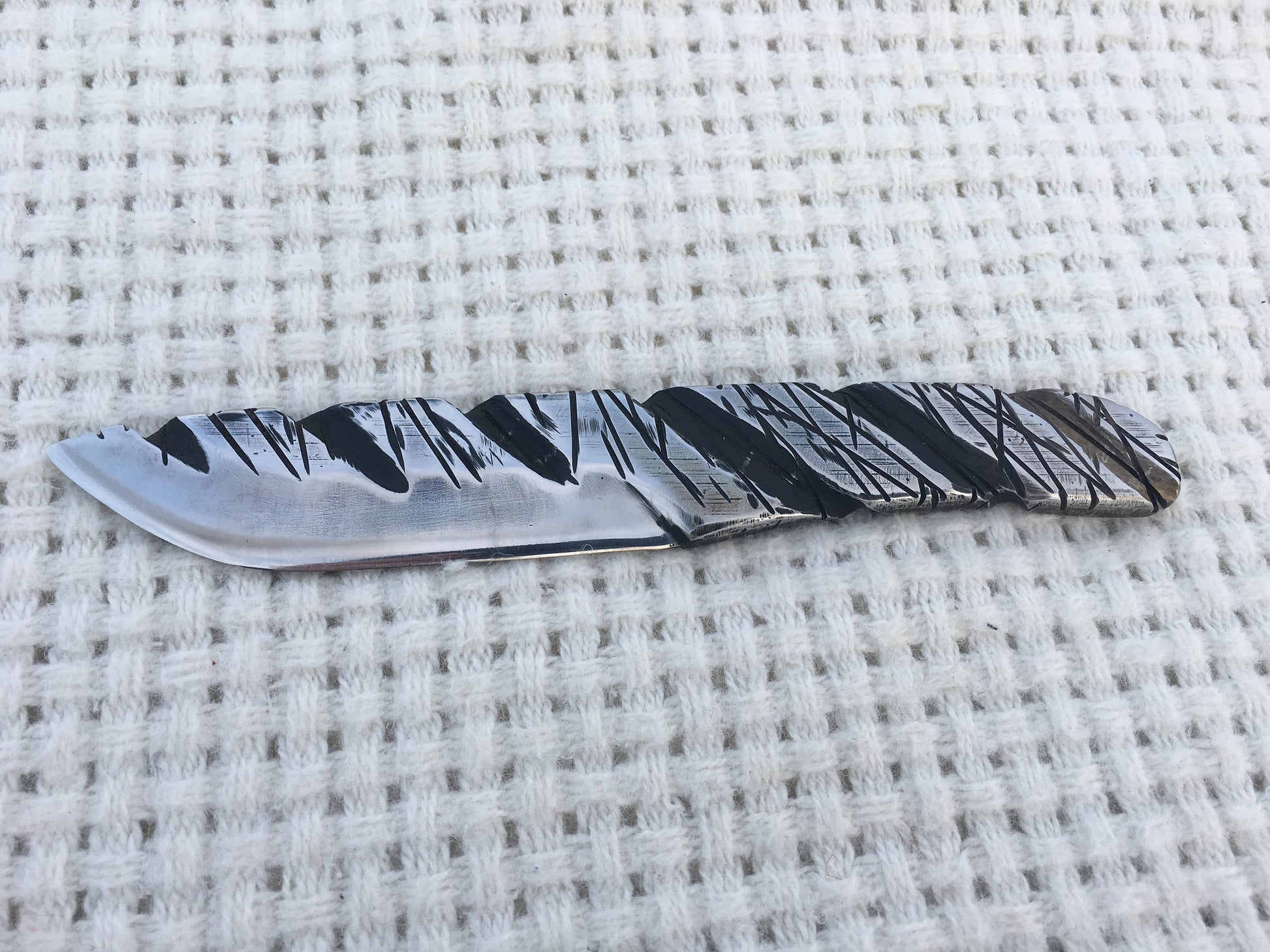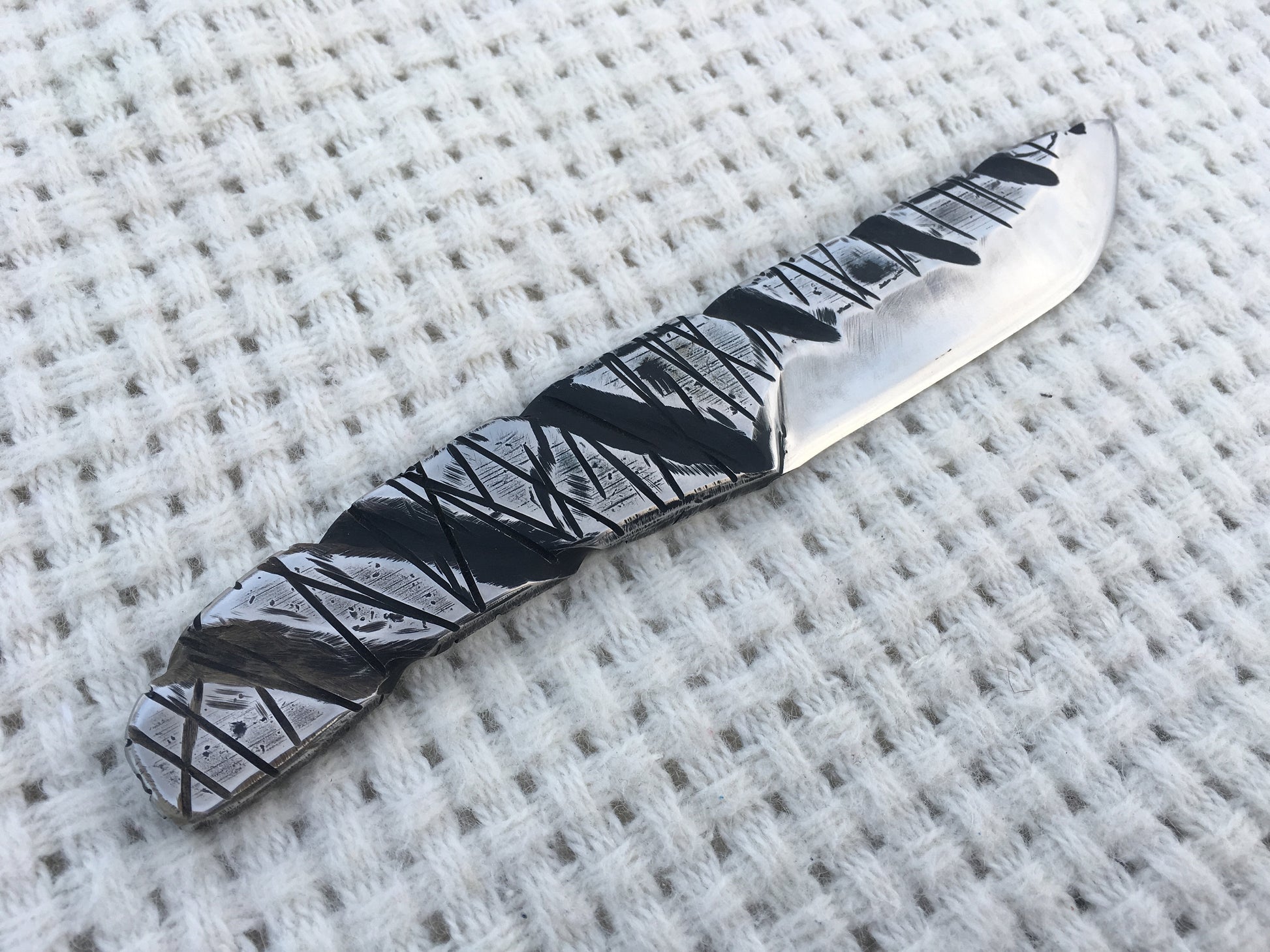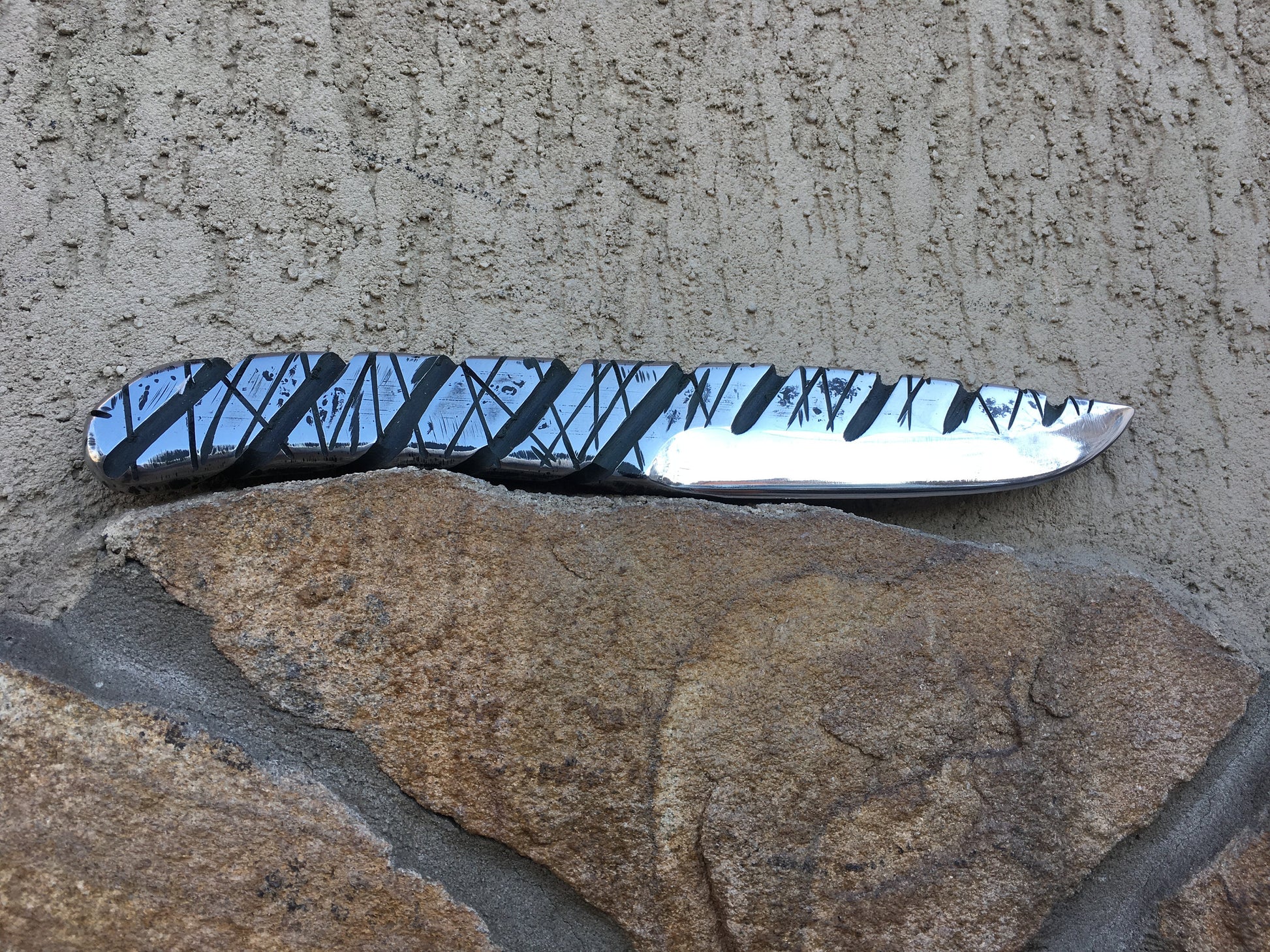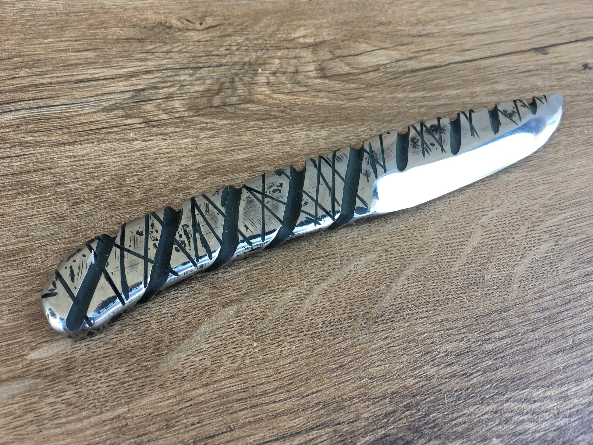 Here is a hand crafted knife made of stainless steel with a nice surface texture. Sturdy (the thickness is 1 cm/0.39").