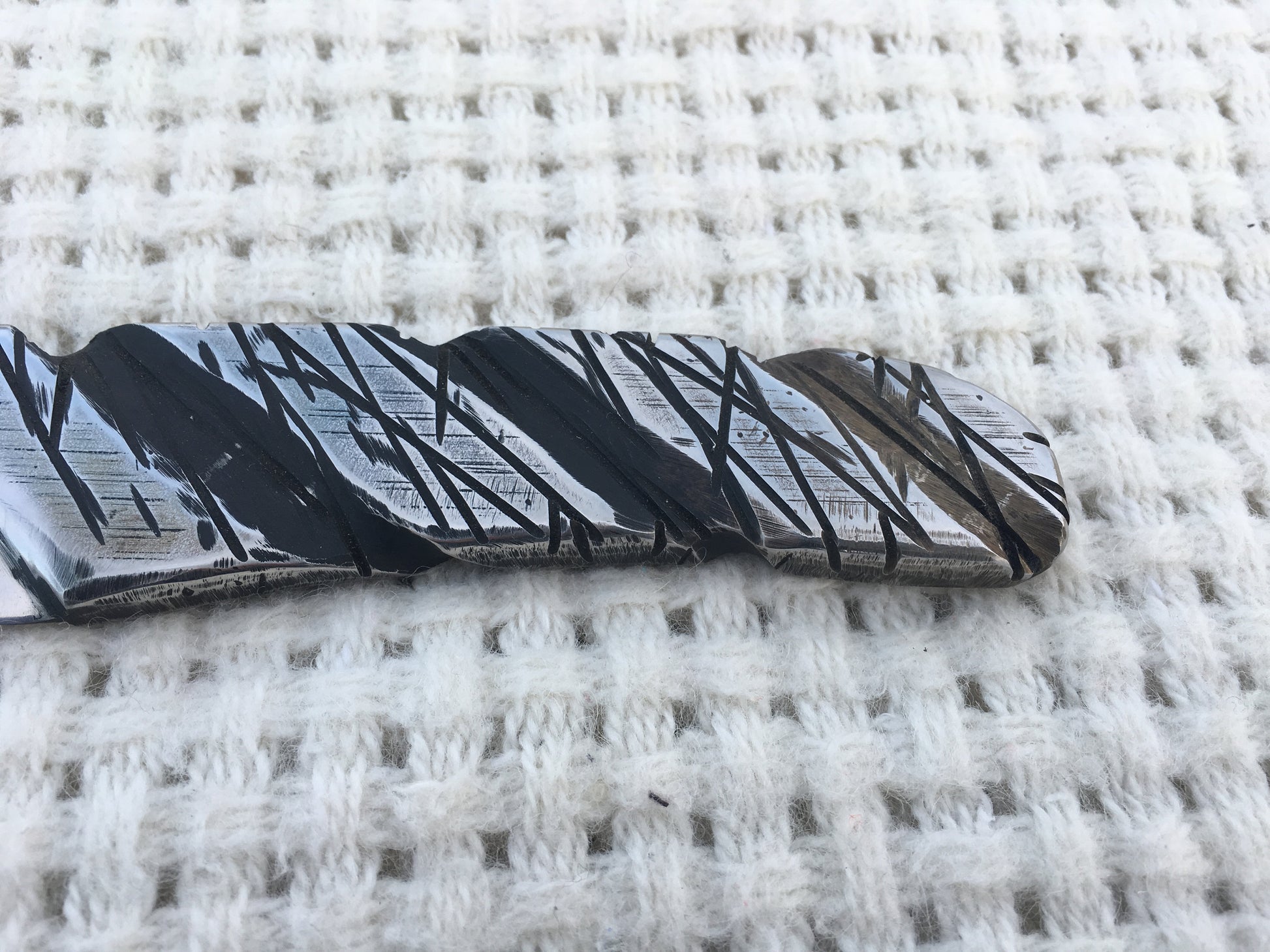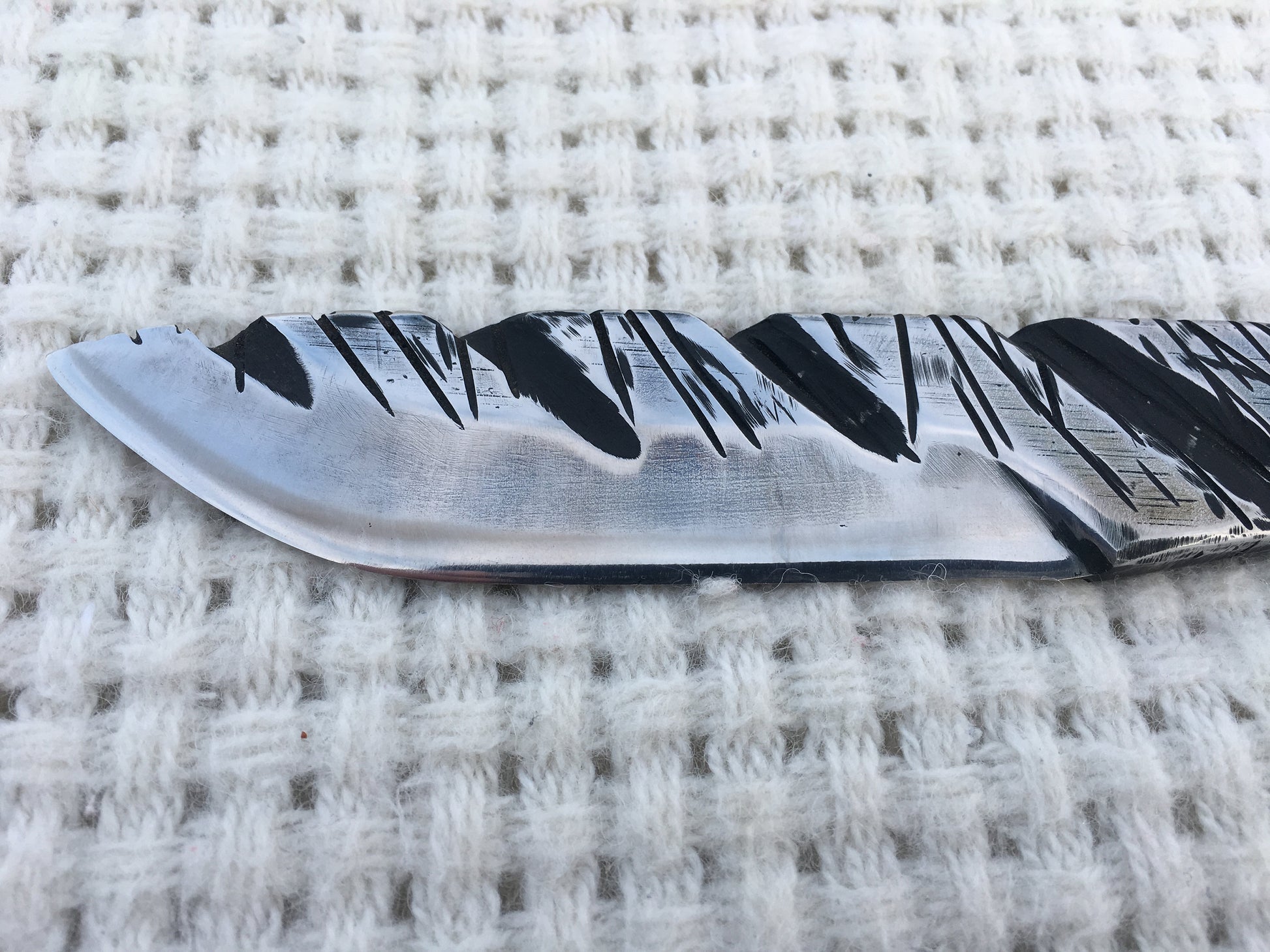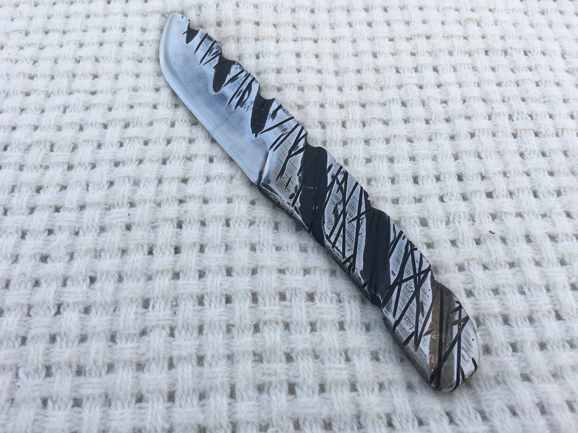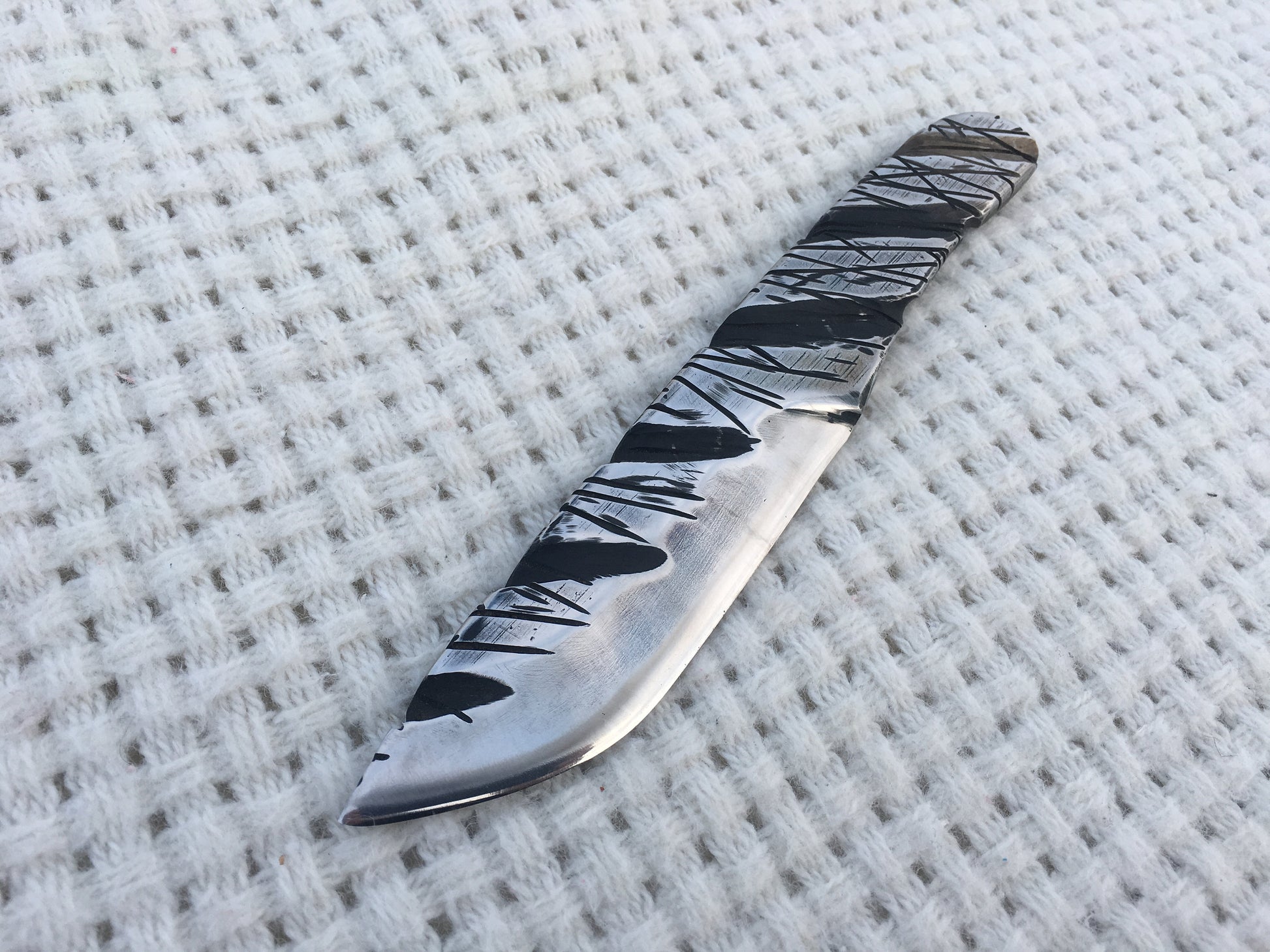 Here is a hand crafted knife made of stainless steel with a nice surface texture. Sturdy (the thickness is 1 cm/0.39").