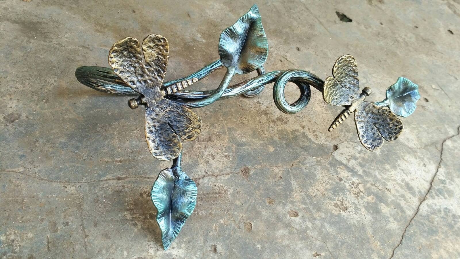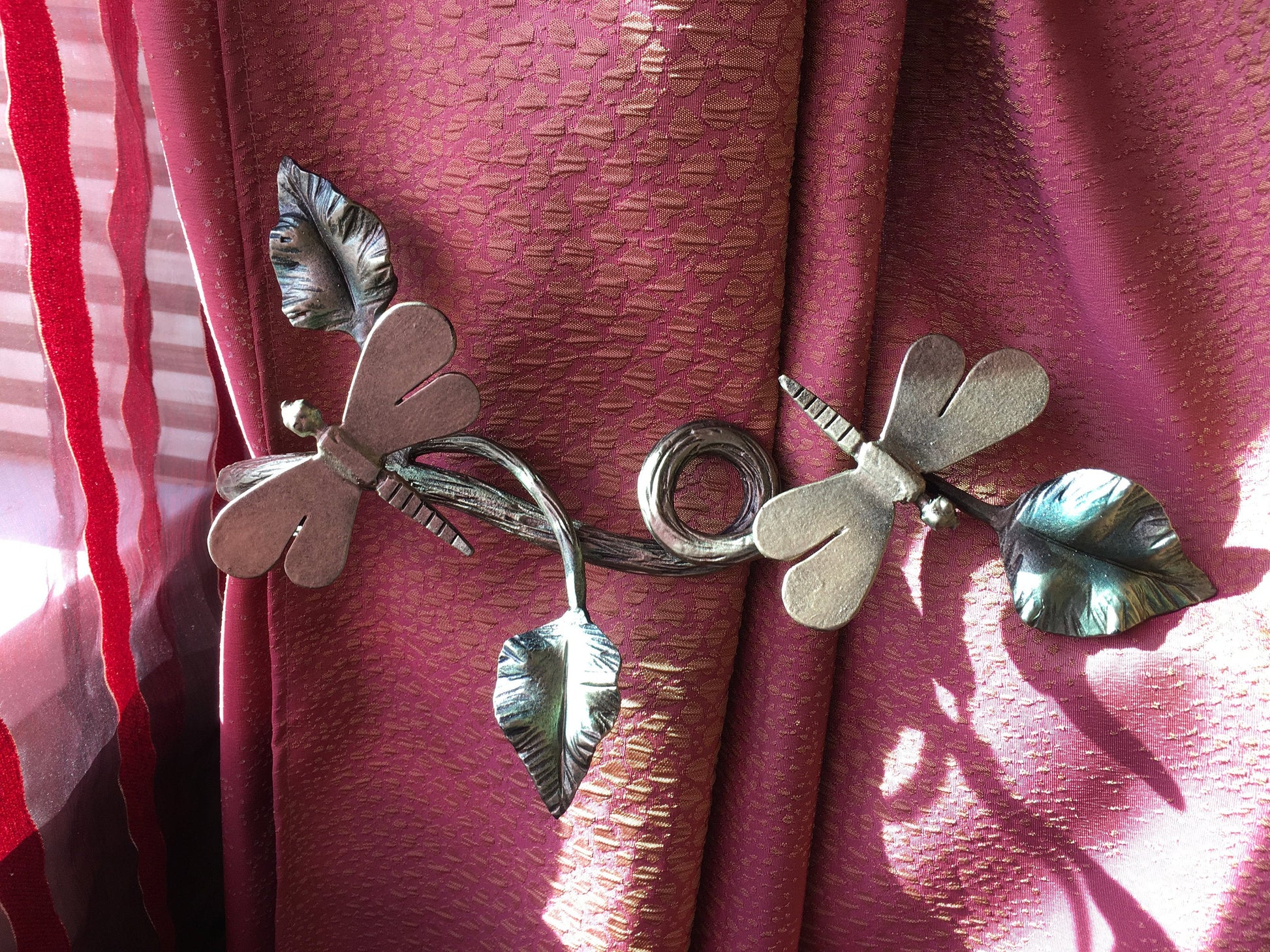Here is a forged hand made curtain holdback in a view of a nice branch with leaves and two dragonflies. Structure of a branch surface looks like a bark. You can use it both for right and left side. It looks gorgeous! It is a functional piece of art!
