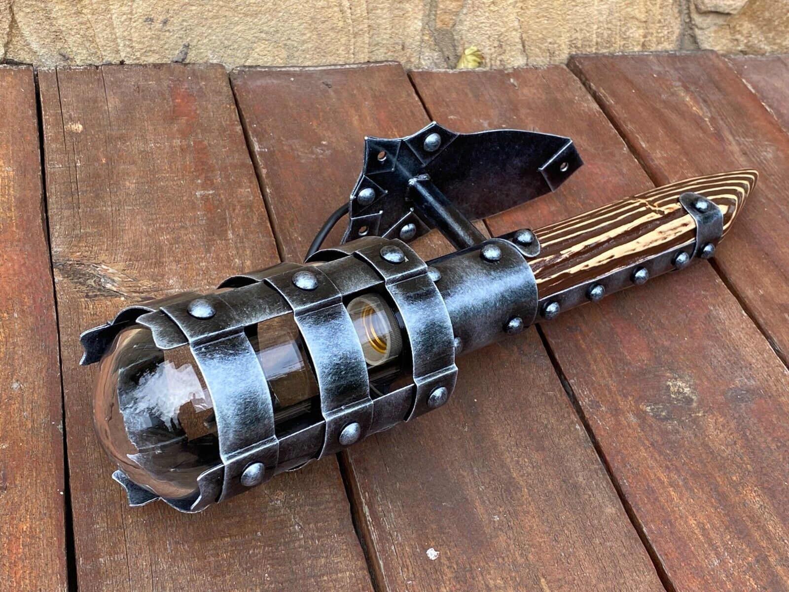 A wall lamp can be not a usual lamp but a masterpiece which can decorate your home and outlines the features of your home interior/exterior. Here is a hand forged outdoor wall sconce made in a view of a torch, with a glass cover for a bulb. It is fixed to a wall. You will not find anything similar to it. It is very decorative! It can serve as a lantern for your porch or entryway lamp or inside/outside house lamp. A wood has a nice surface structure (small waves structure). This lantern creates a medieval atmosphere of old viking times!