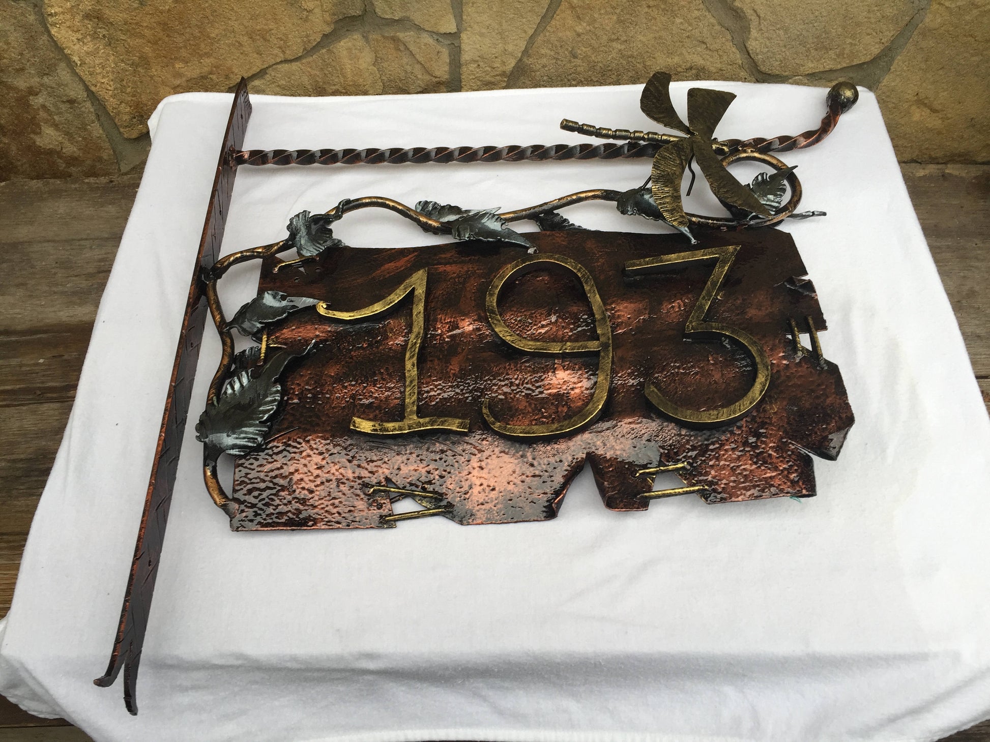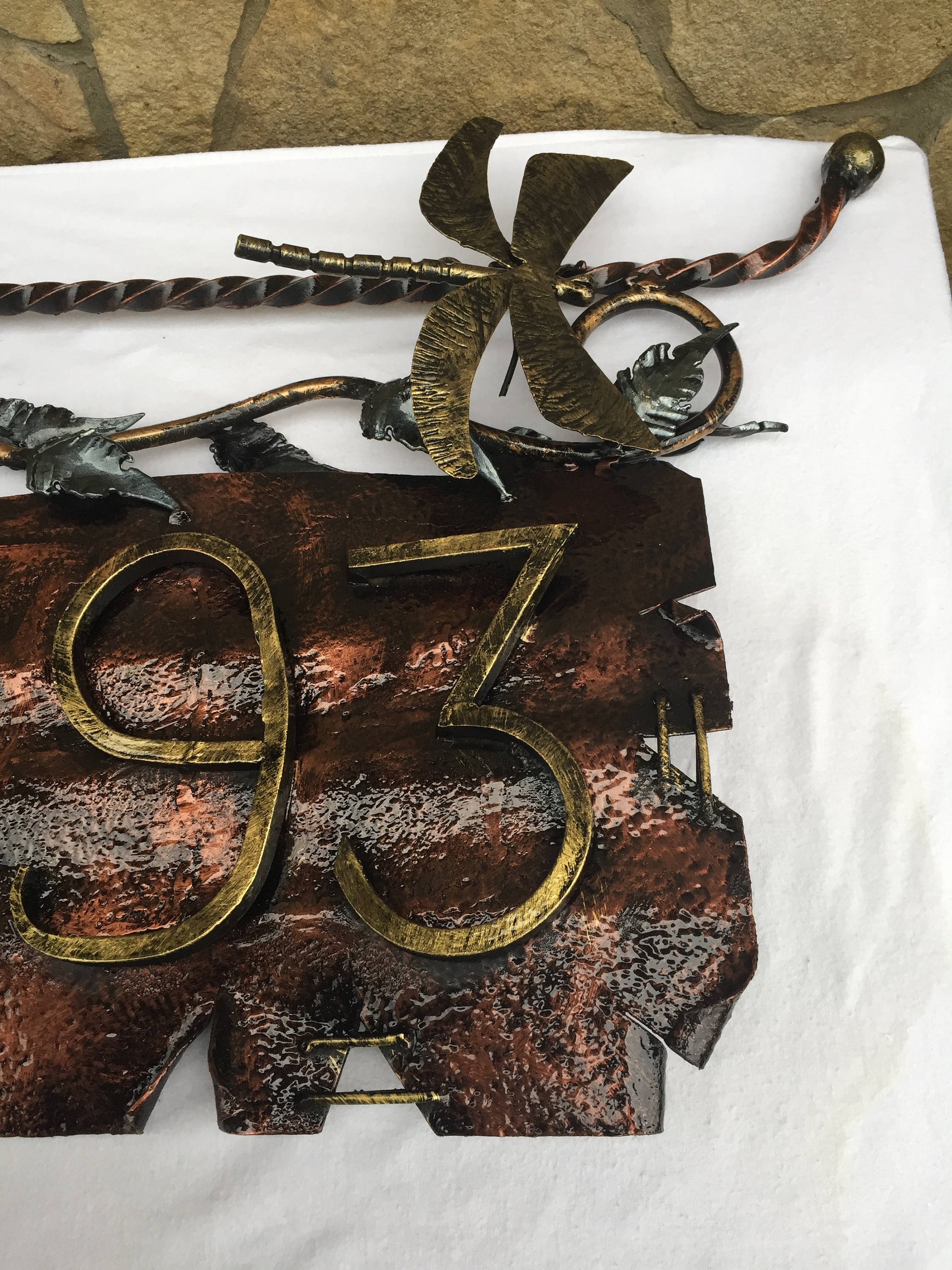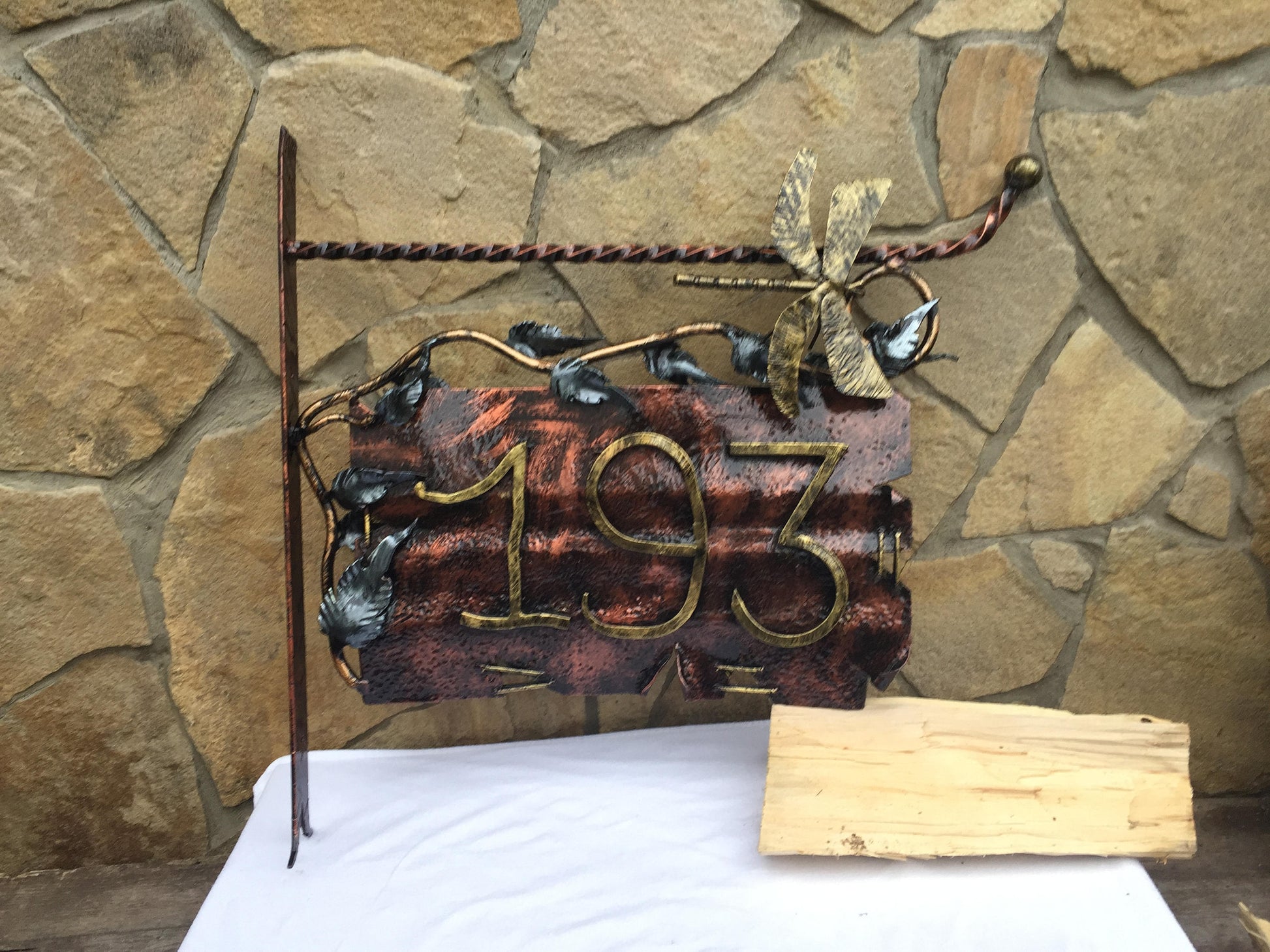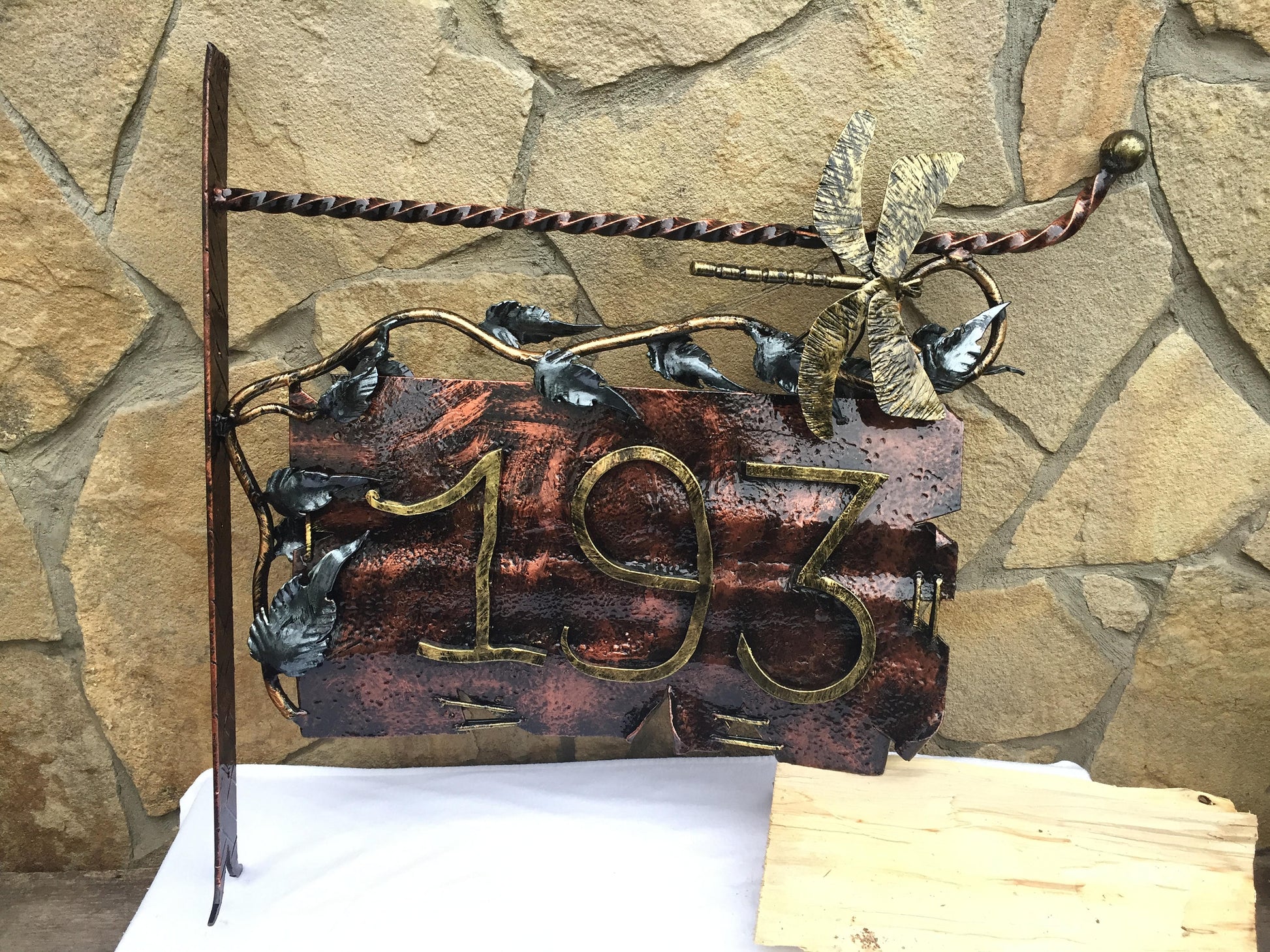 Here is an address sign decor which gives much more beauty to your house and outlines its the exterior features. It is done in a view of a branch with leaves. In some parts it is torn and needled - looks very decorative. It is handmade, art forged. It is a functional piece of art! You will be unique with such an address plaque!