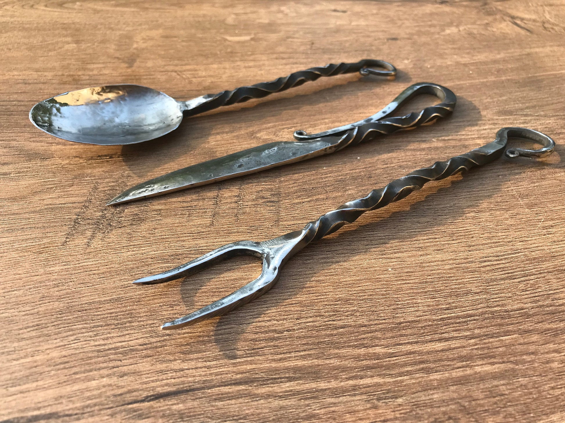 This rustic medieval cutlery is worked entirely by hand and made of hand forged stainless steel. Hand forged in stainless steel -- an elegant but rugged cutlery set, intended for use, while maintaining a pleasing aesthetic presence as well. These items are unique in form but universal in application, and will weather several generations of use.
