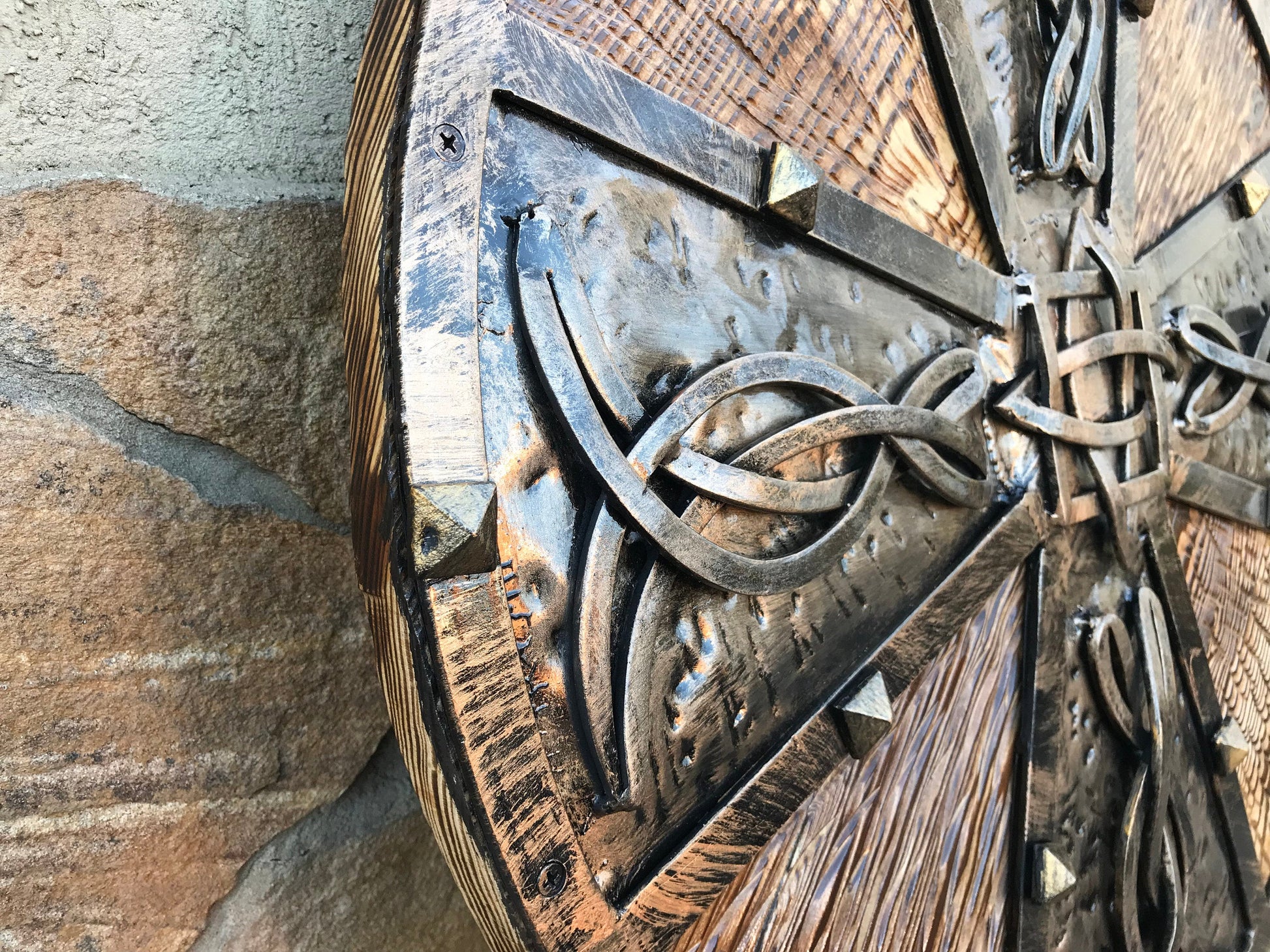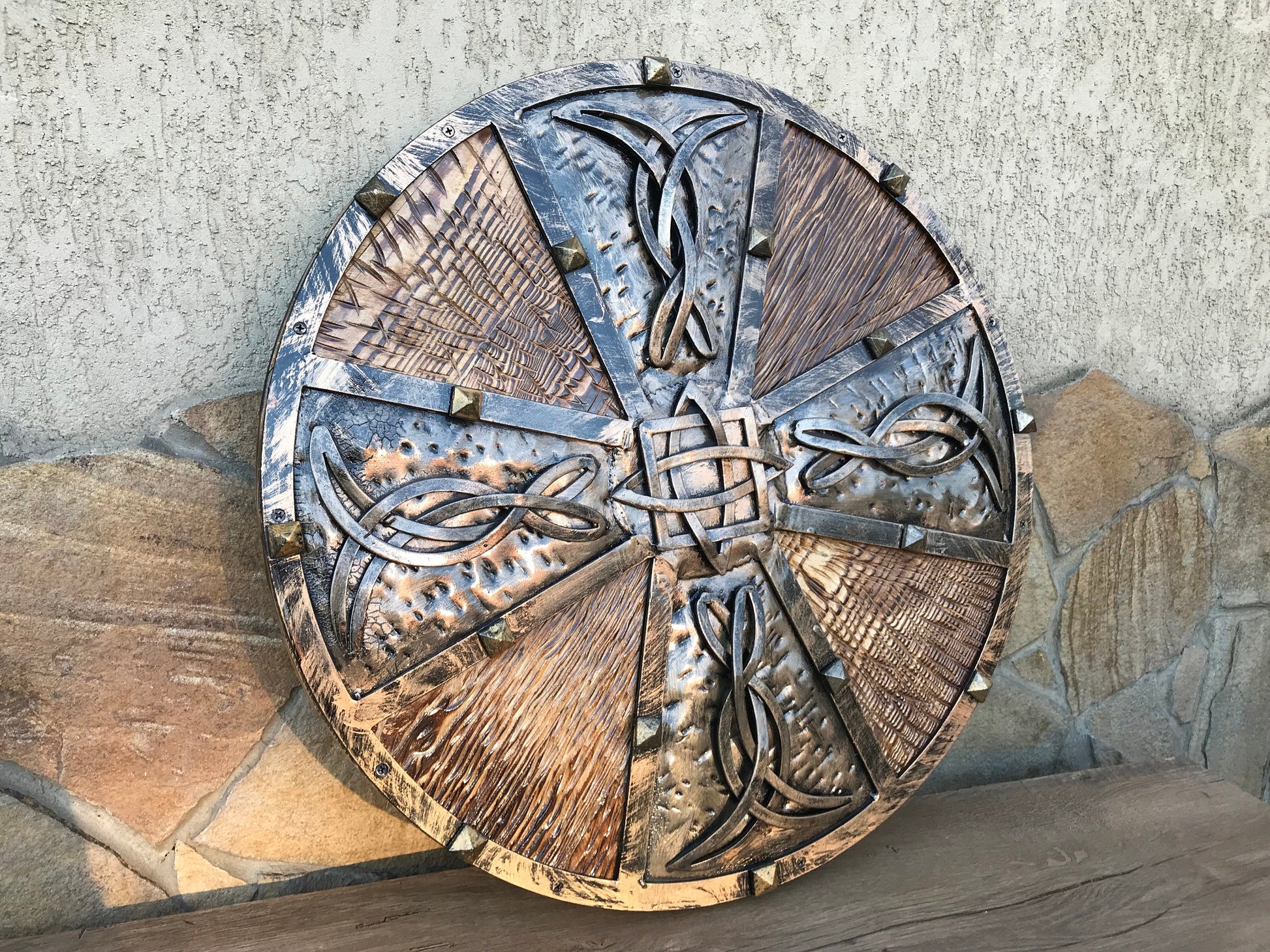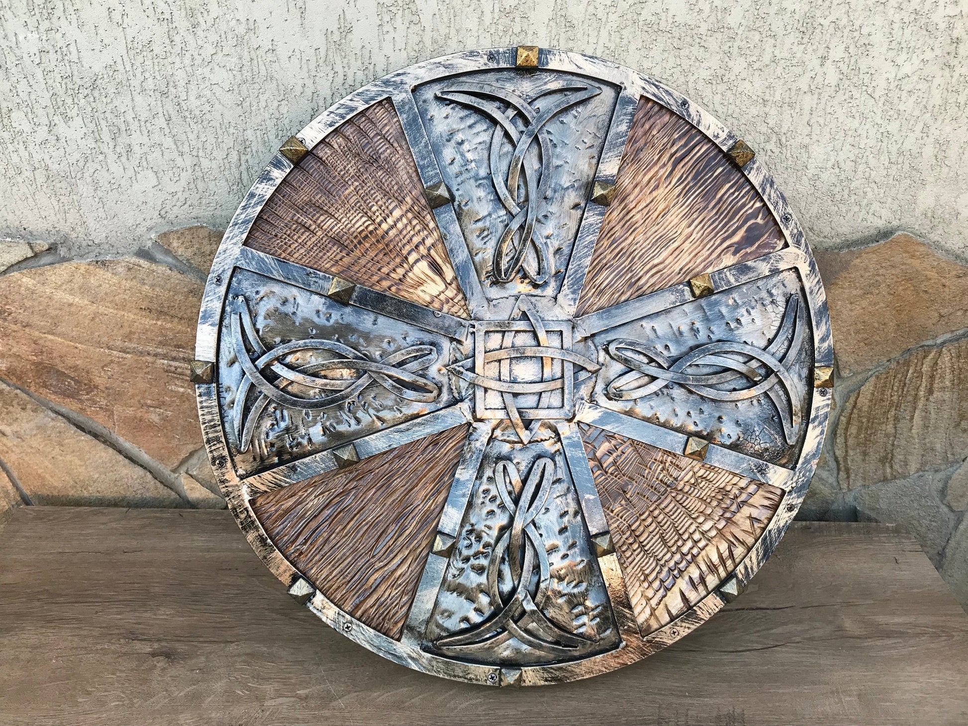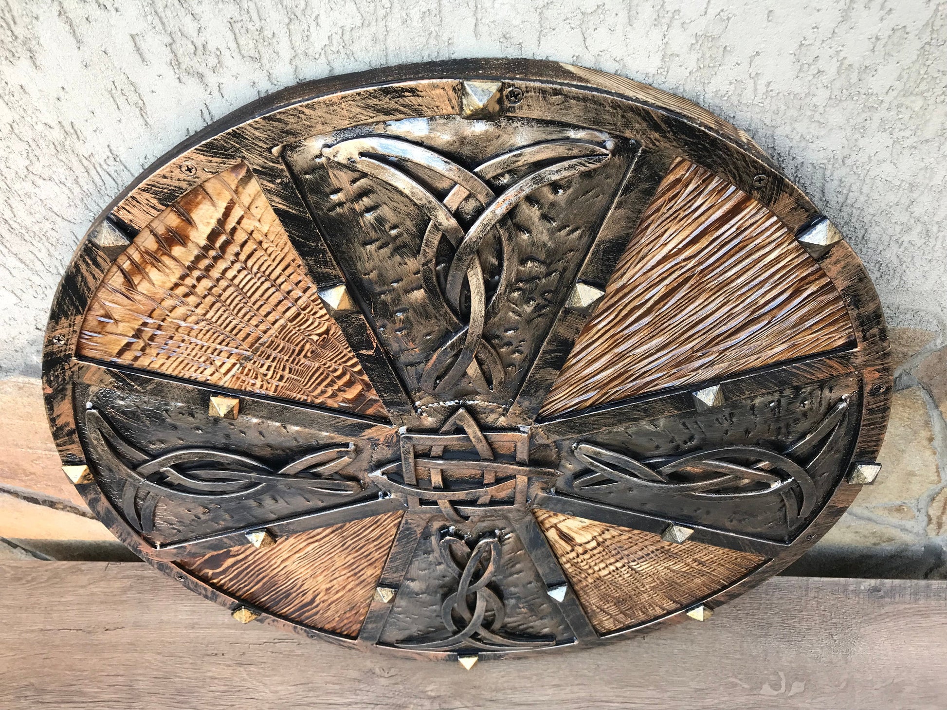 Looking for an unusual hand crafted shield? Here it is! A shield with hand forged elements (Celtic knots).