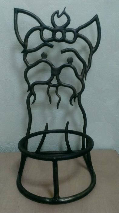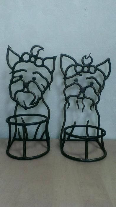A pet bowl holder can be not a usual bowl holder but a masterpiece which can decorate your home and outlines the features of your home interior/exterior. Here is a hand forged dog bowl tray holder, hand made, in a view of a nice girl-dog. You will not find anything similar to it. It is very decorative! It will last forever.
