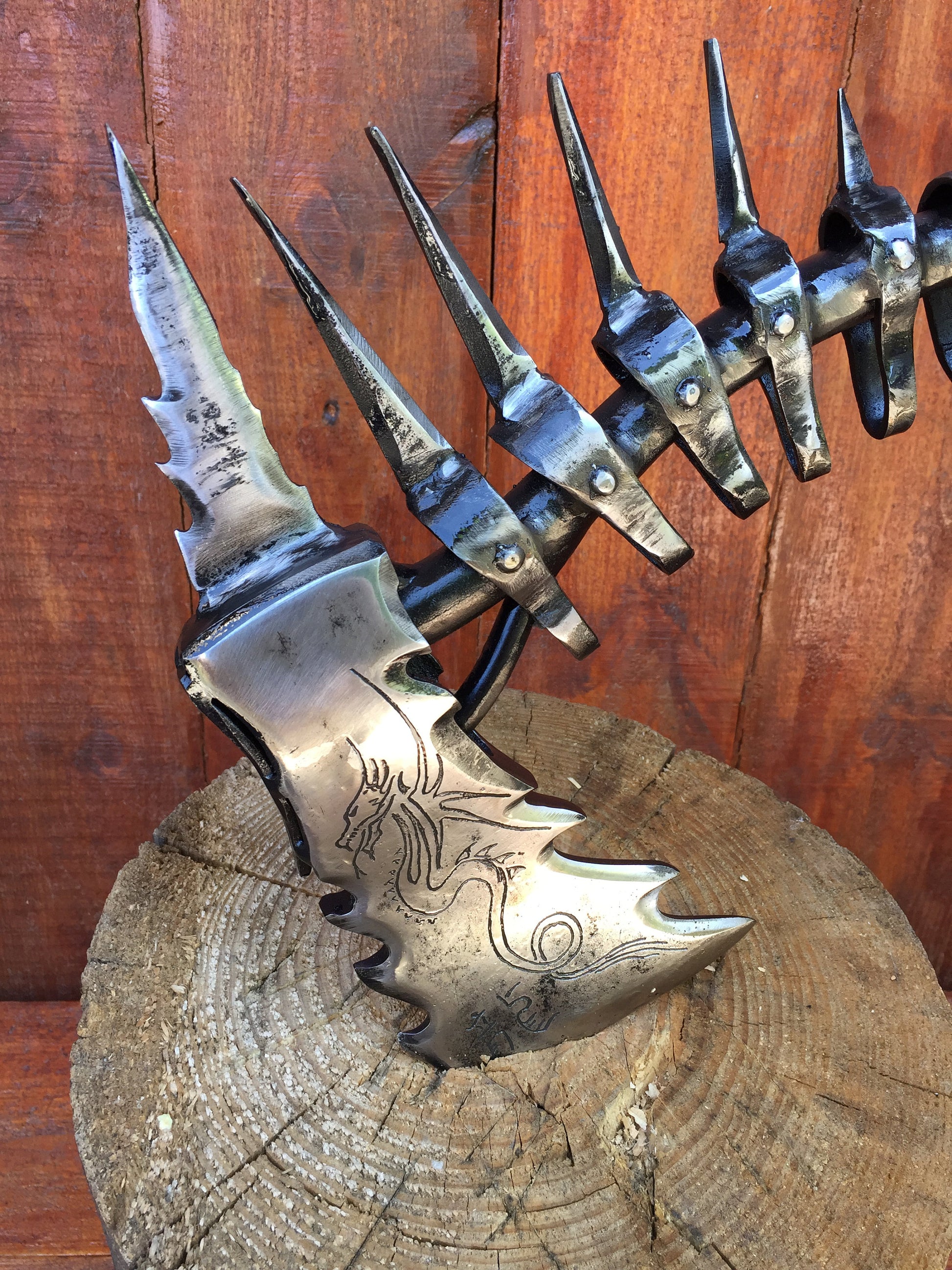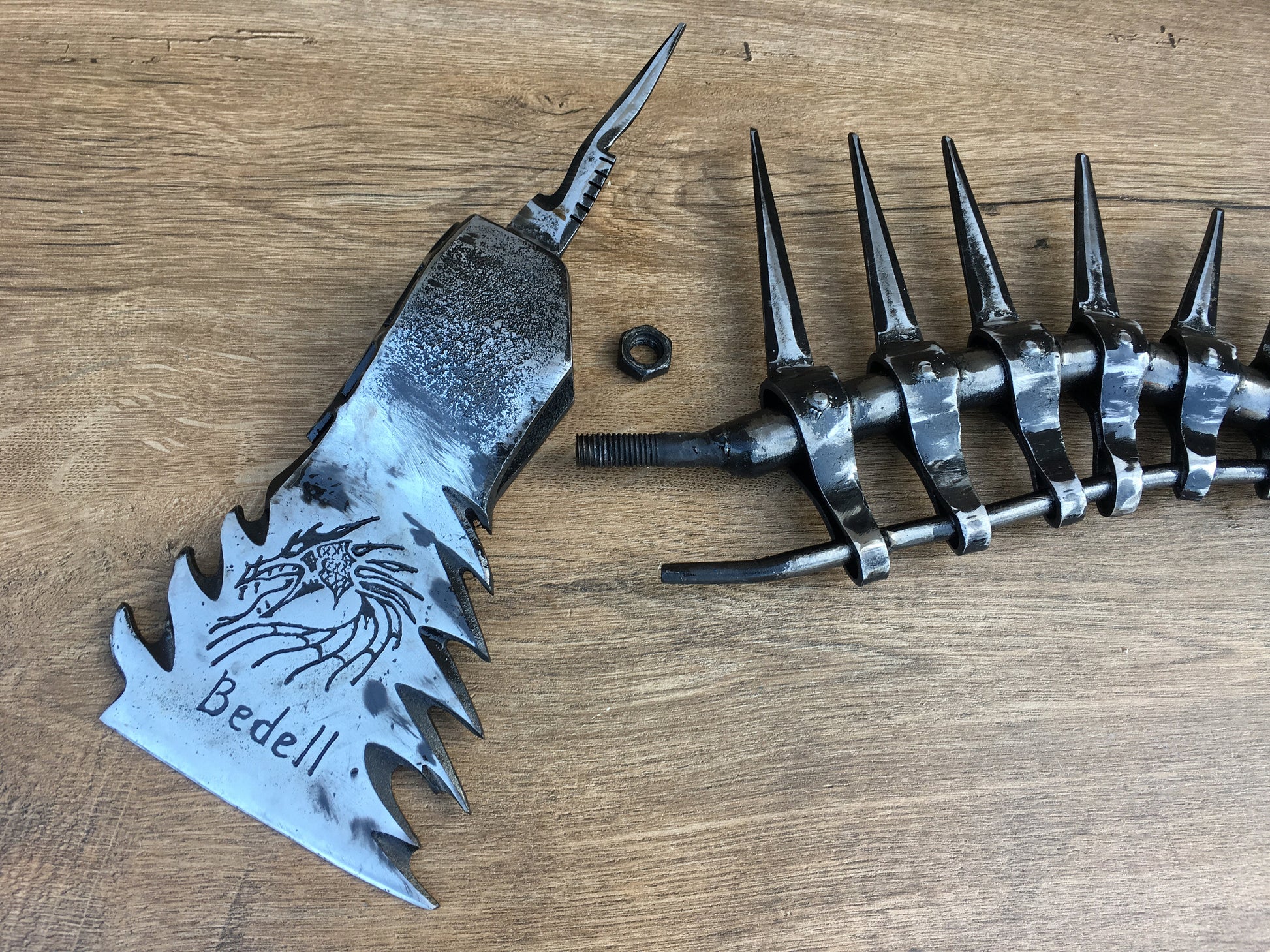There might be some minor unevenness in the axe head drawing due to hand work. The axe head is etched with the dragon. The handle is done in a view of a skeleton.