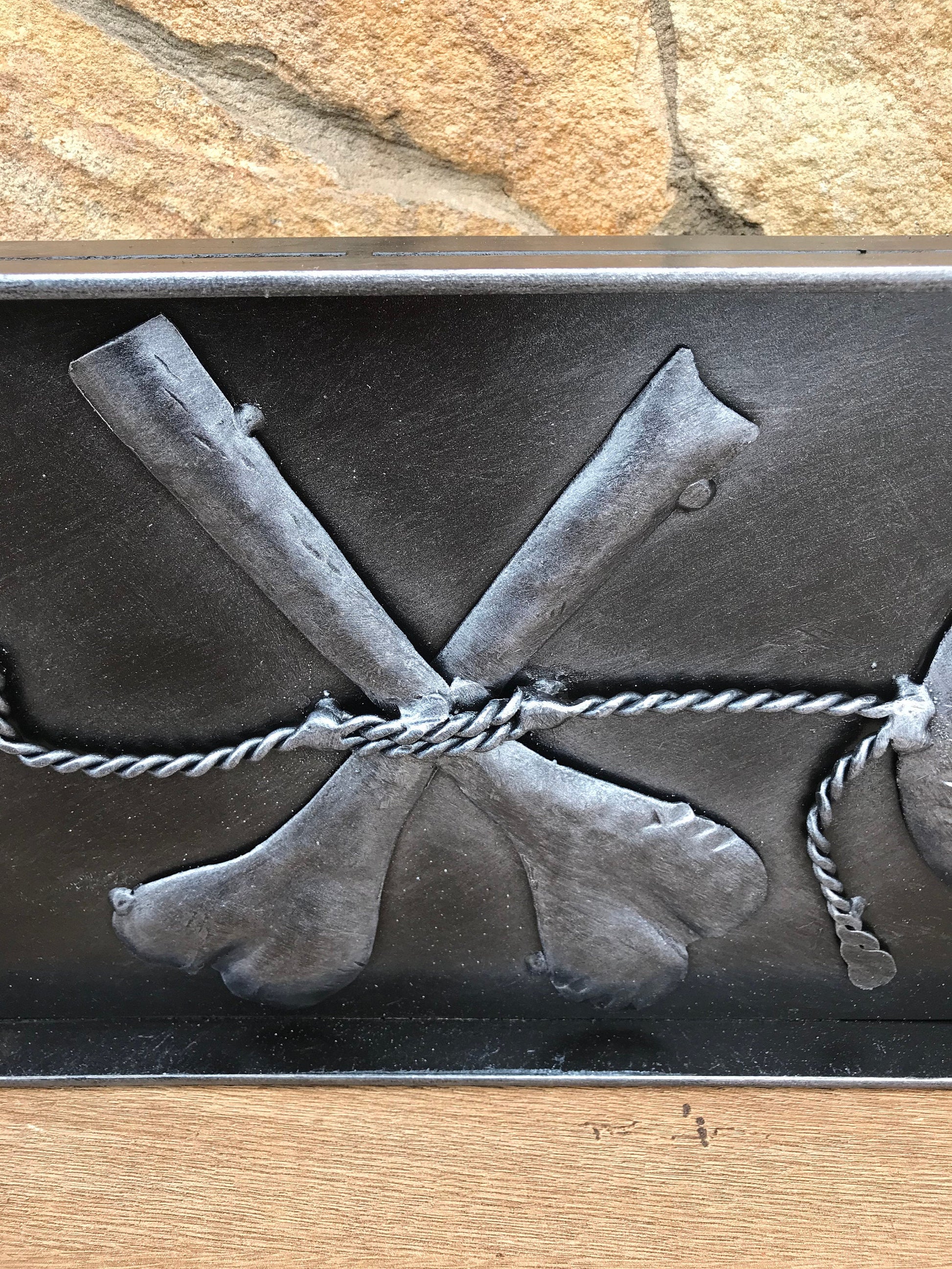 Are you looking for a nice gift? for a nice functional piece of art? Here is a hand forged painting with skulls, bones which can be a nice fireplace decor, wall decor.