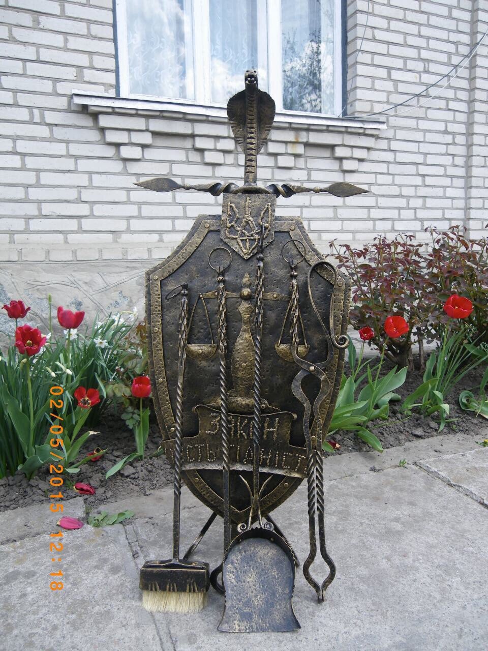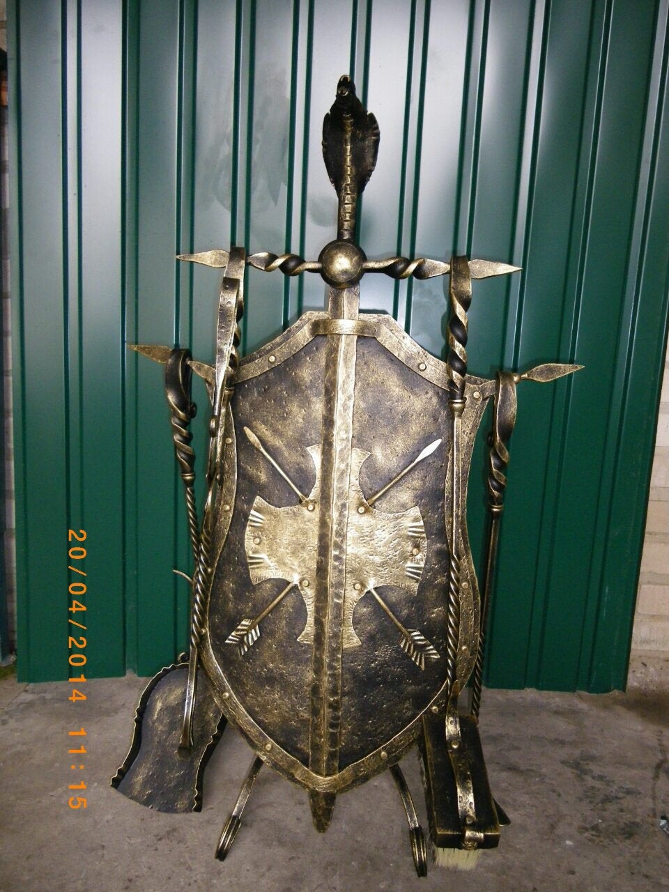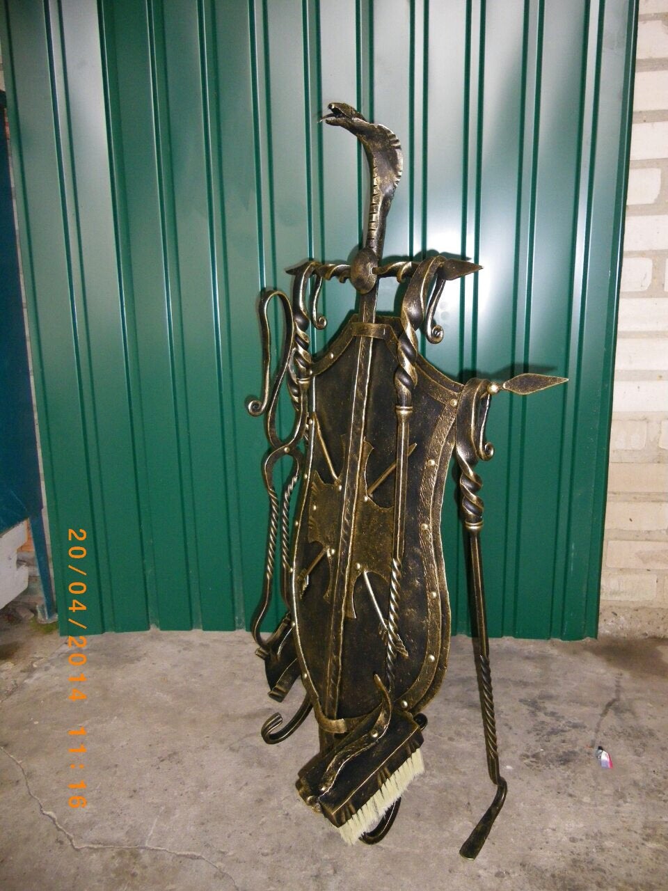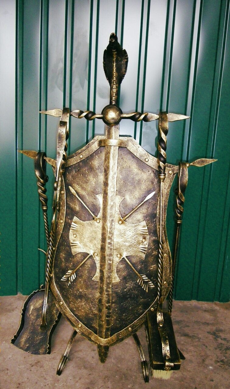 Fireplace accessories can be not only usual accessories for fireplace but a masterpiece which decorates your home and outlines the interior features of your house and a symbol of prestige, comfort and warmth. Here is a forged fireplace accessories set in a view of a medieval shield (Wwith a cobra on its top). An evening at the home at a fireplace in the circle of family will help to relax, relieve fatigue, and charge you with a useful sound energy.
