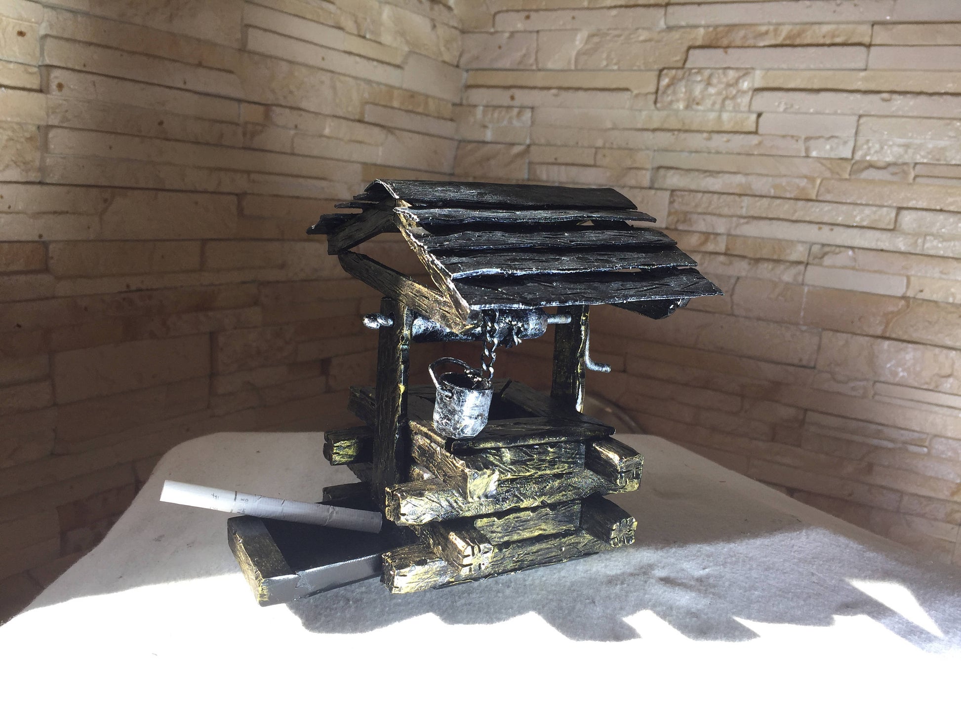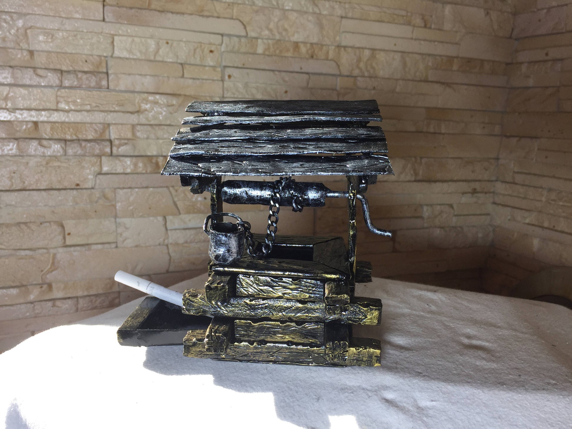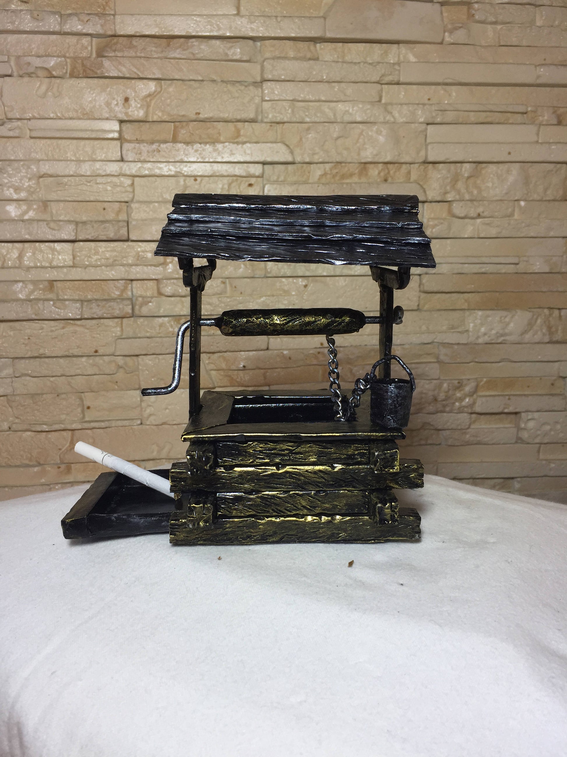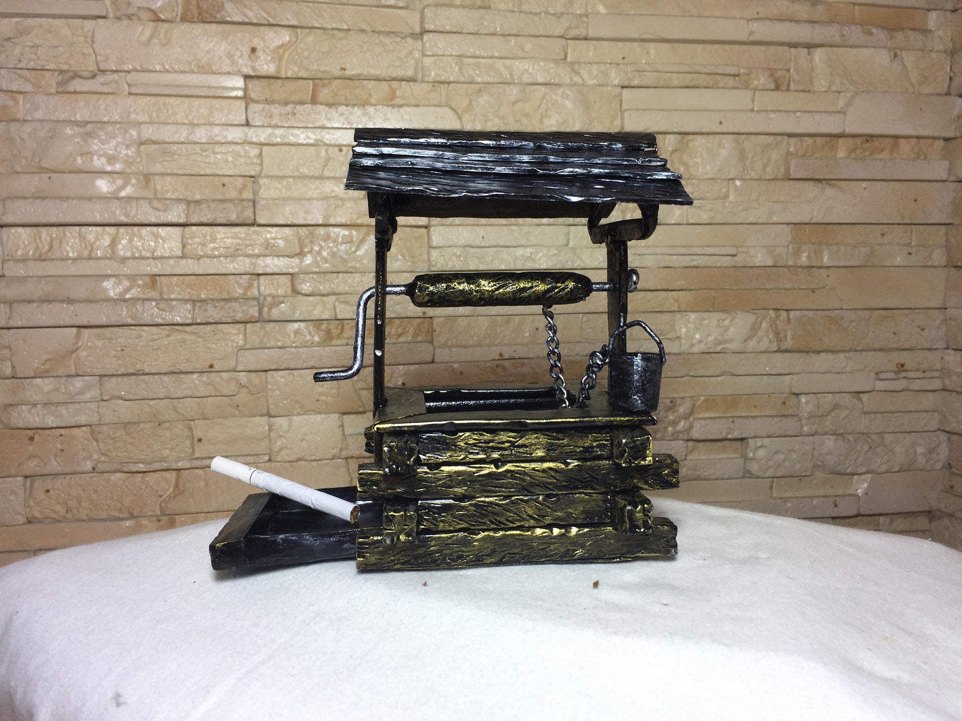 An ashtray can be not a usual ash tray but a masterpiece which decorates your house and outlines the features of your interior. Here is a forged ashtray in a view of a nice well. The handle of the well moves. The bucket on the chain also moves. There is a special tray under the well which is serviced to clean up the ash from the well. While smoking you can put the ash inside the well or you can put the ash on this tray. From one side it is unusual ashtray and from other side it is a nice piece of decoration for your table.