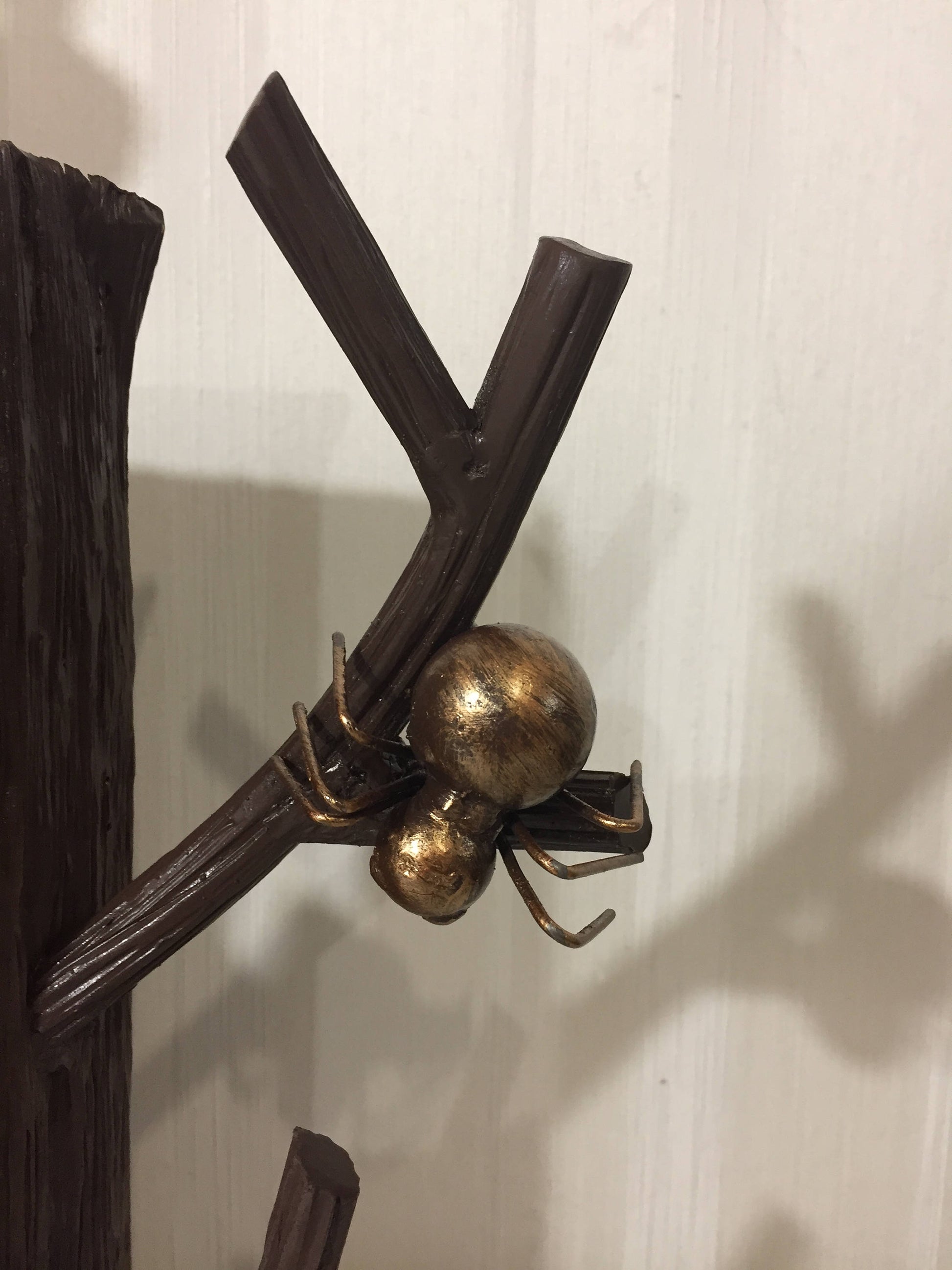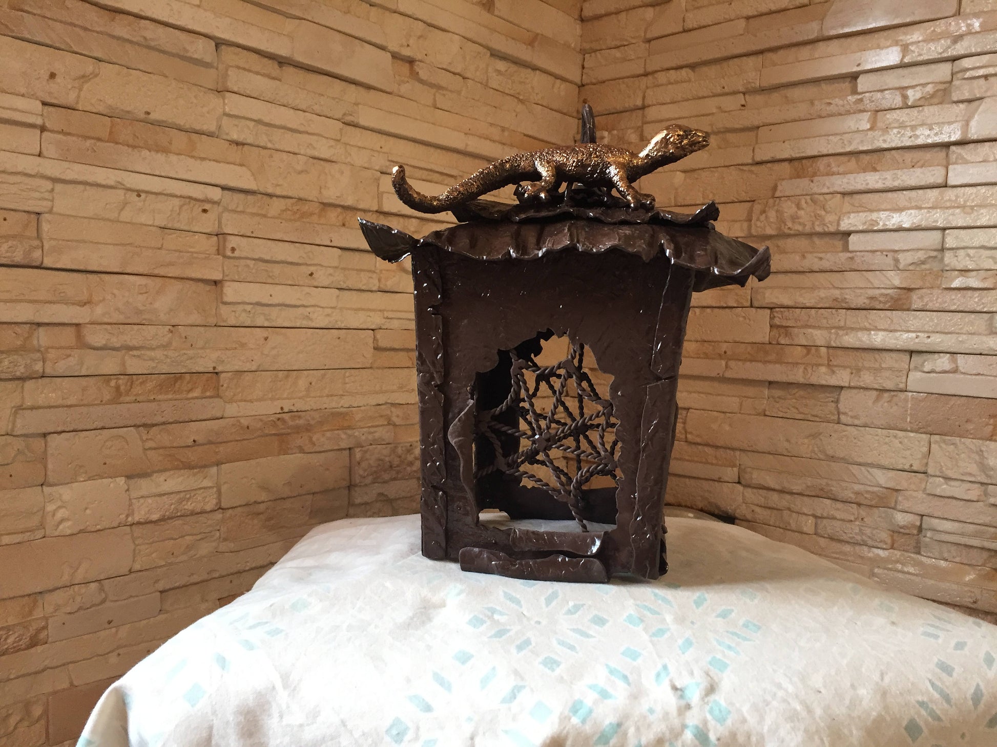 A wall lamp can be not a usual lamp but a masterpiece which can decorate your home and outlines the features of your home interior. Here is a forged wall lamp, hand made. It is done in a view of a branch of a tree with animals (a snake, a squirrel, a beetle, a spider, a woodpecker, a lizard), it hangs on a nice branch and has a nice tree trunk with a hollow. The surface of a trunk is made in a view of real bark. A trunk is fixed to a wall. You will not find anything similar to it. It is very decorative!