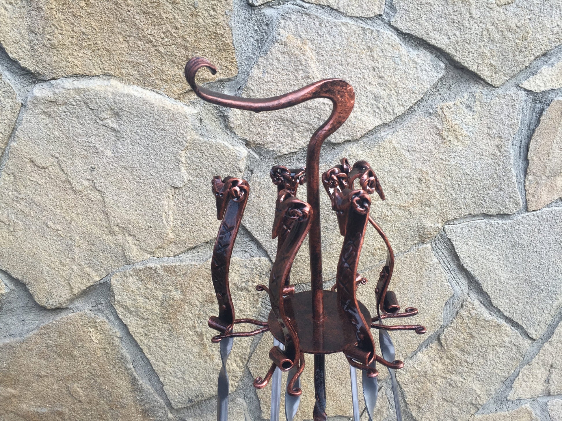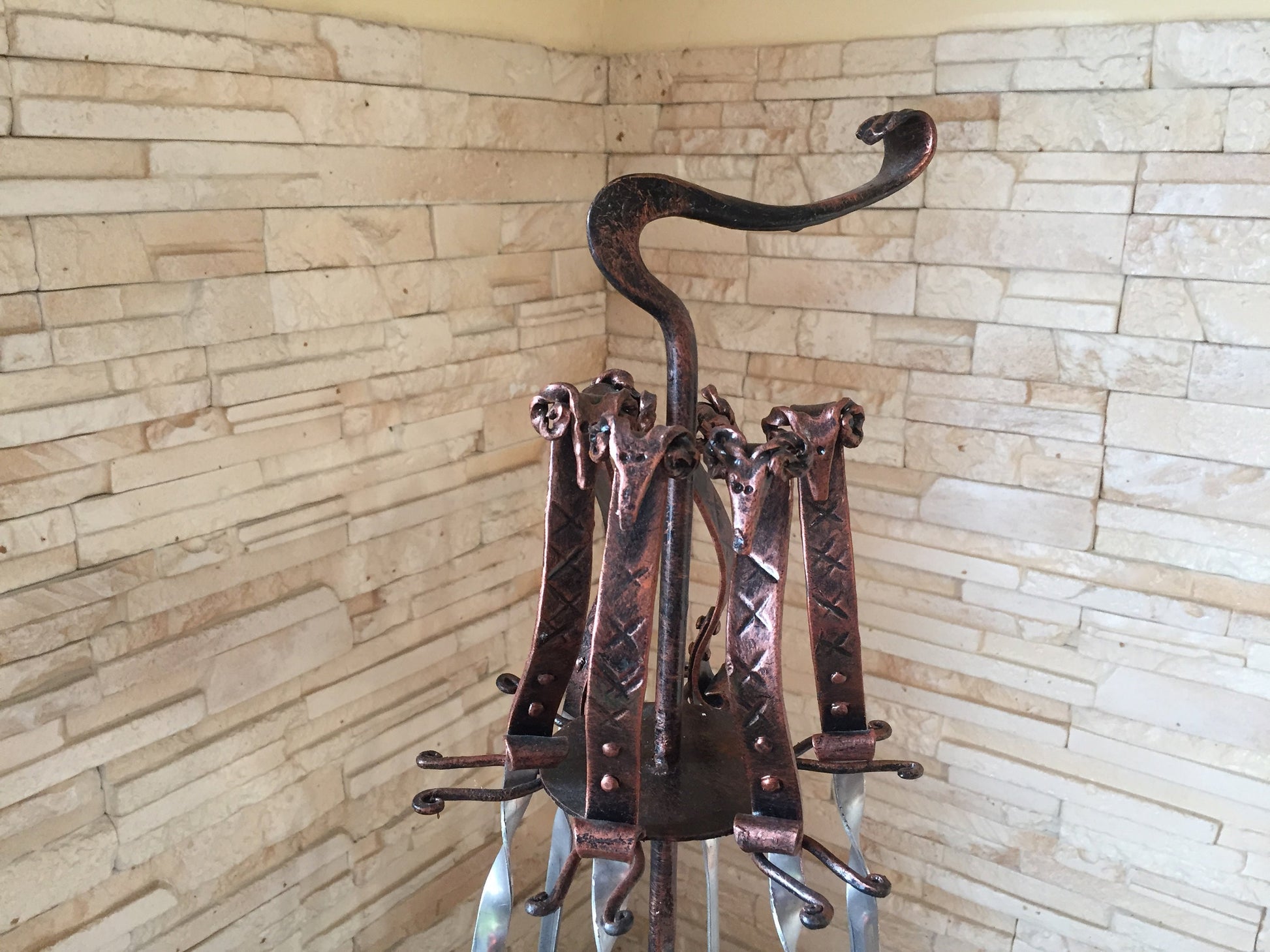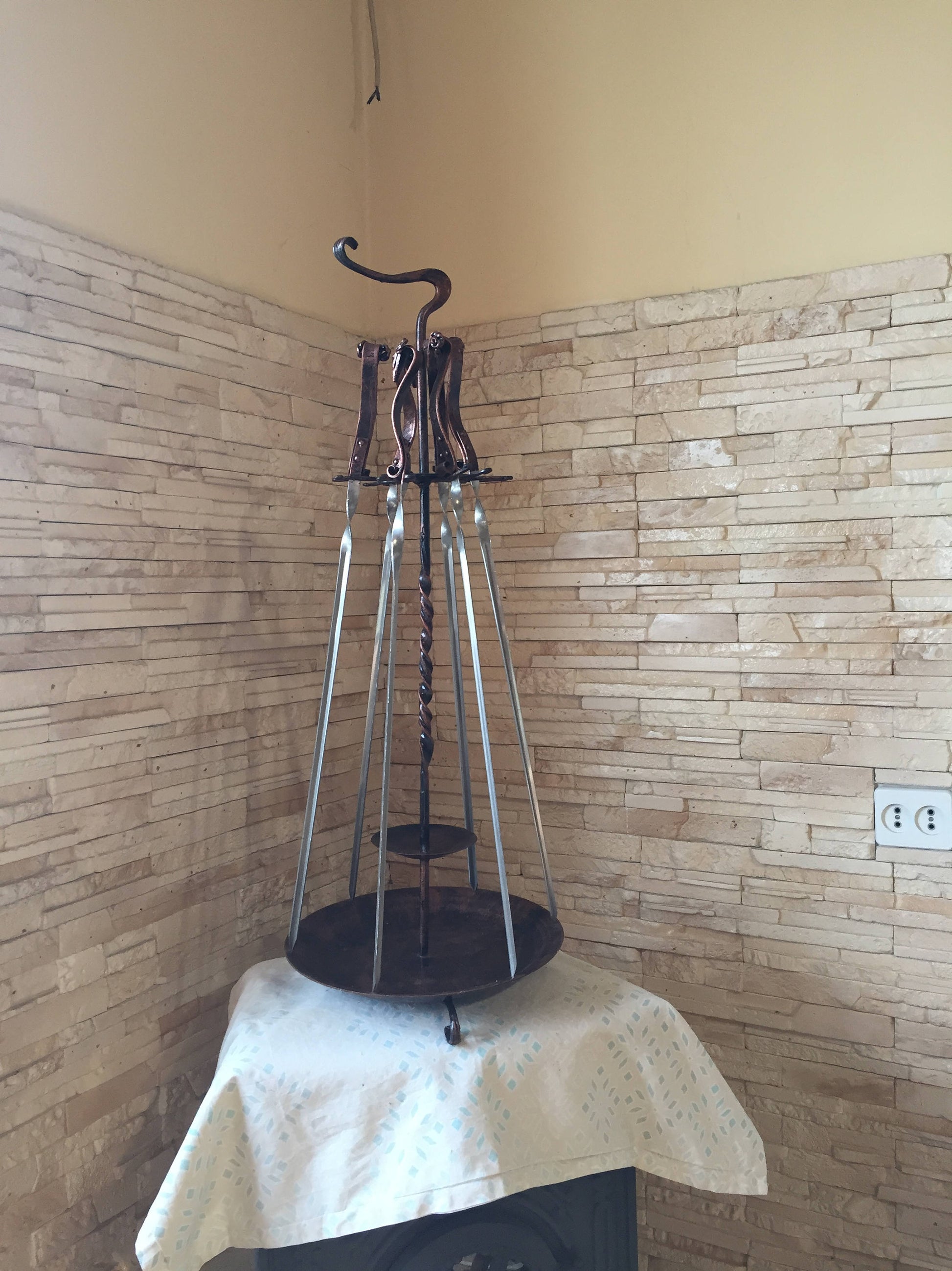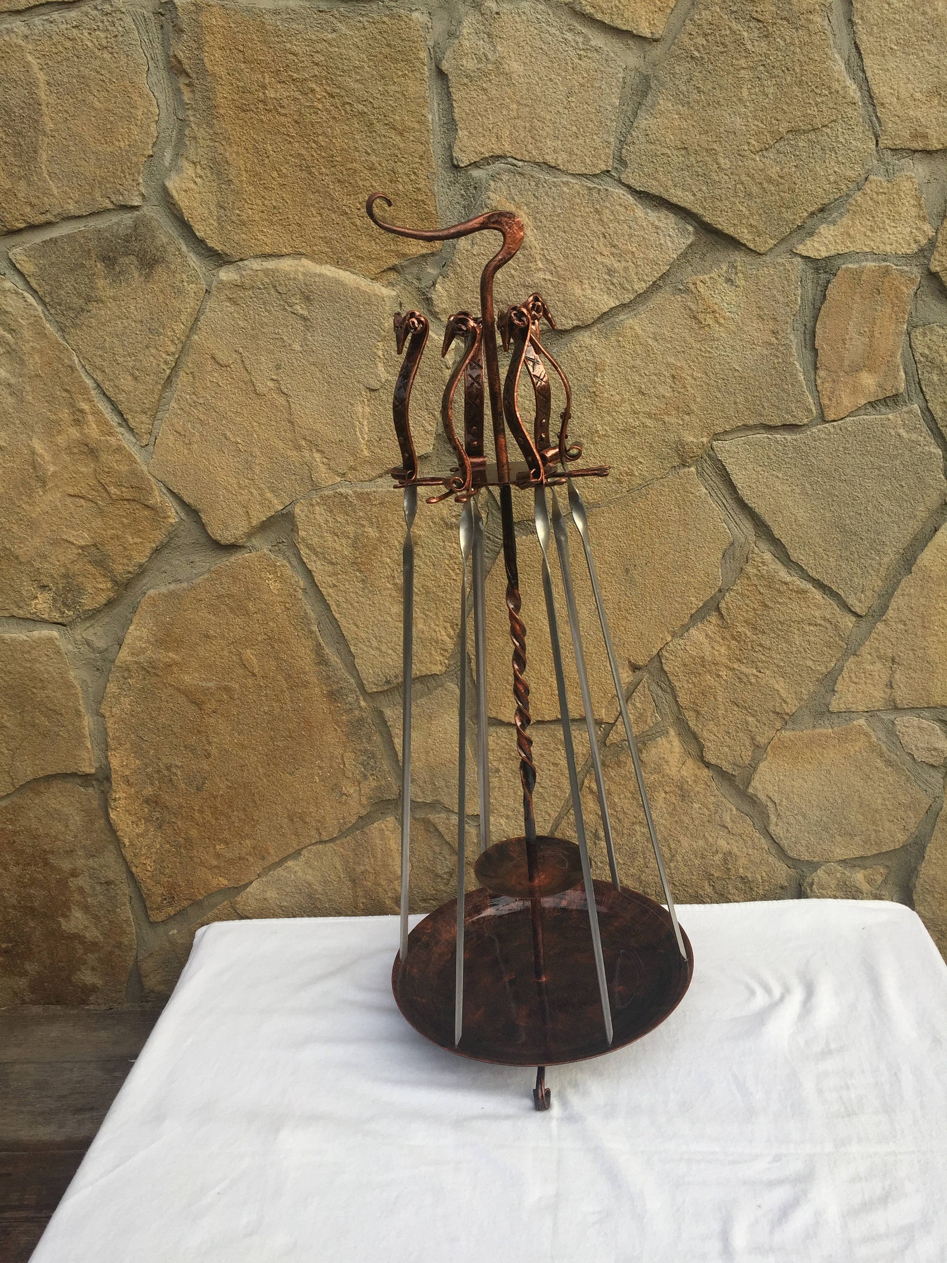 Grill accessories can be not only usual skewers but a masterpiece which decorates your house and outlines your interior features. Here is a hand made forged set of skewers called "Ram" (stainless steel). The composition includes 6 skewers on a decorative stand.