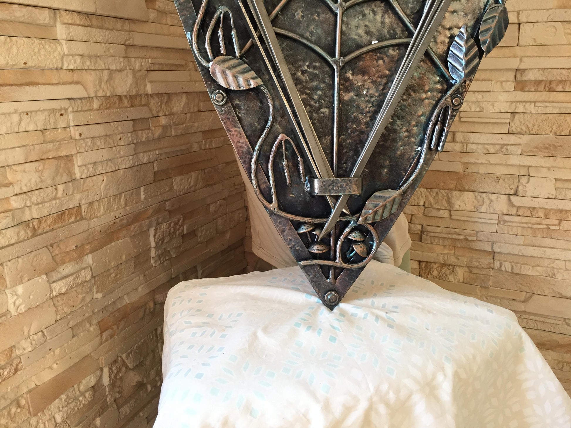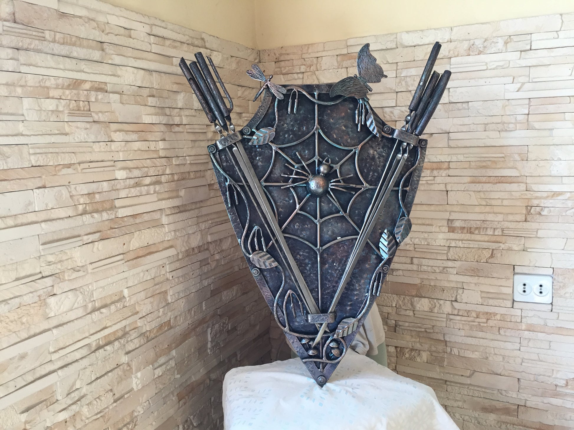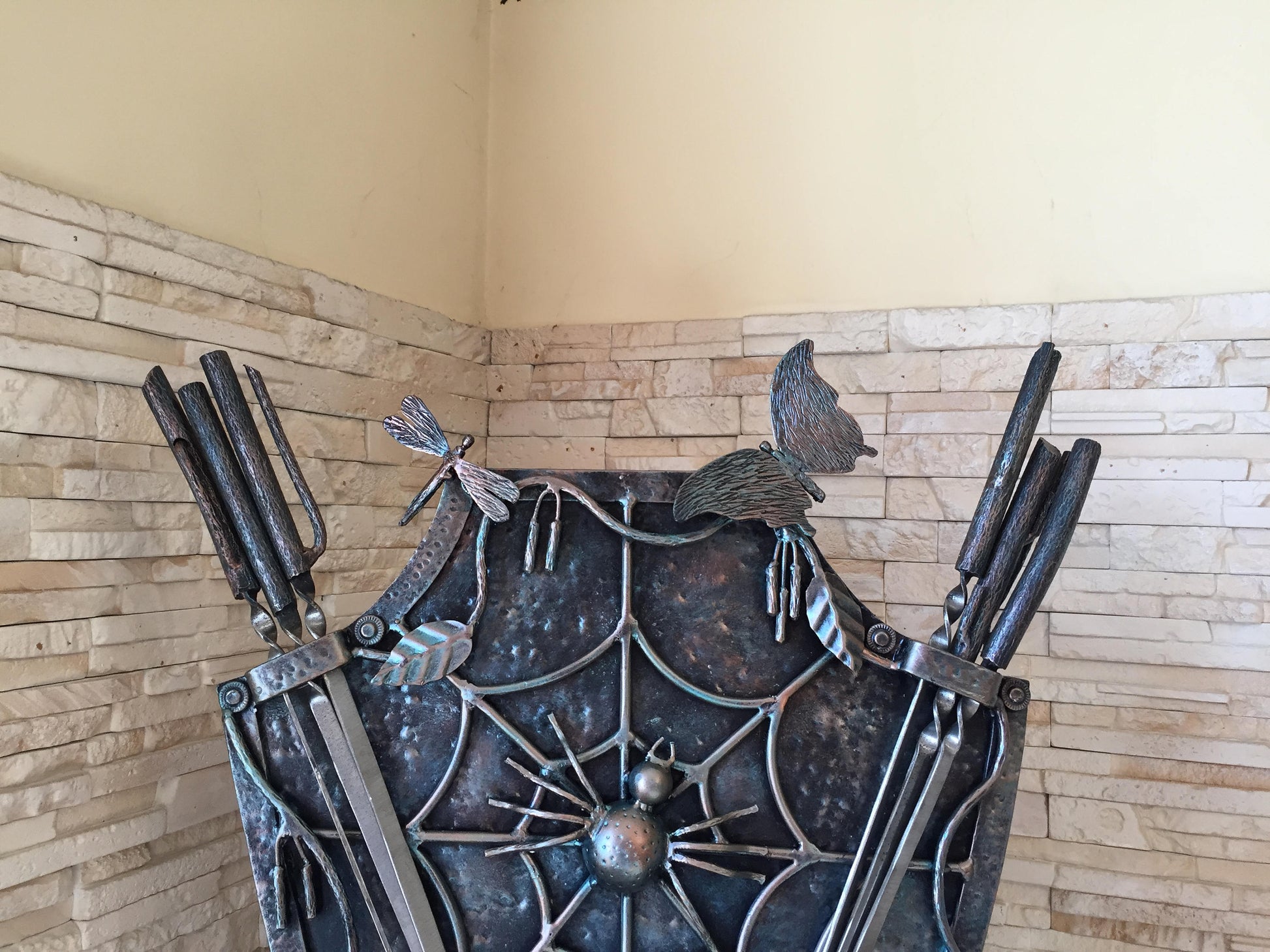 Grill accessories can be not only usual skewers but a masterpiece which decorates your house and outlines your interior features. Here is a hand made forged set of skewers called "Spirit of forest" which is made in style of a nature. The composition includes 6 skewers on a shield, a web with a spider, a branch with leaves, mushrooms at the bottom, a butterfly, a dragonfly on the top.