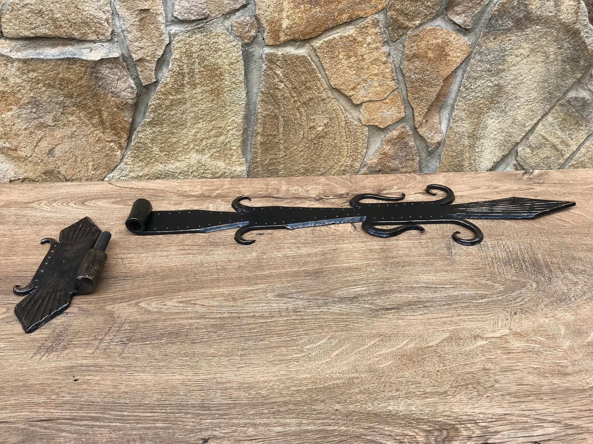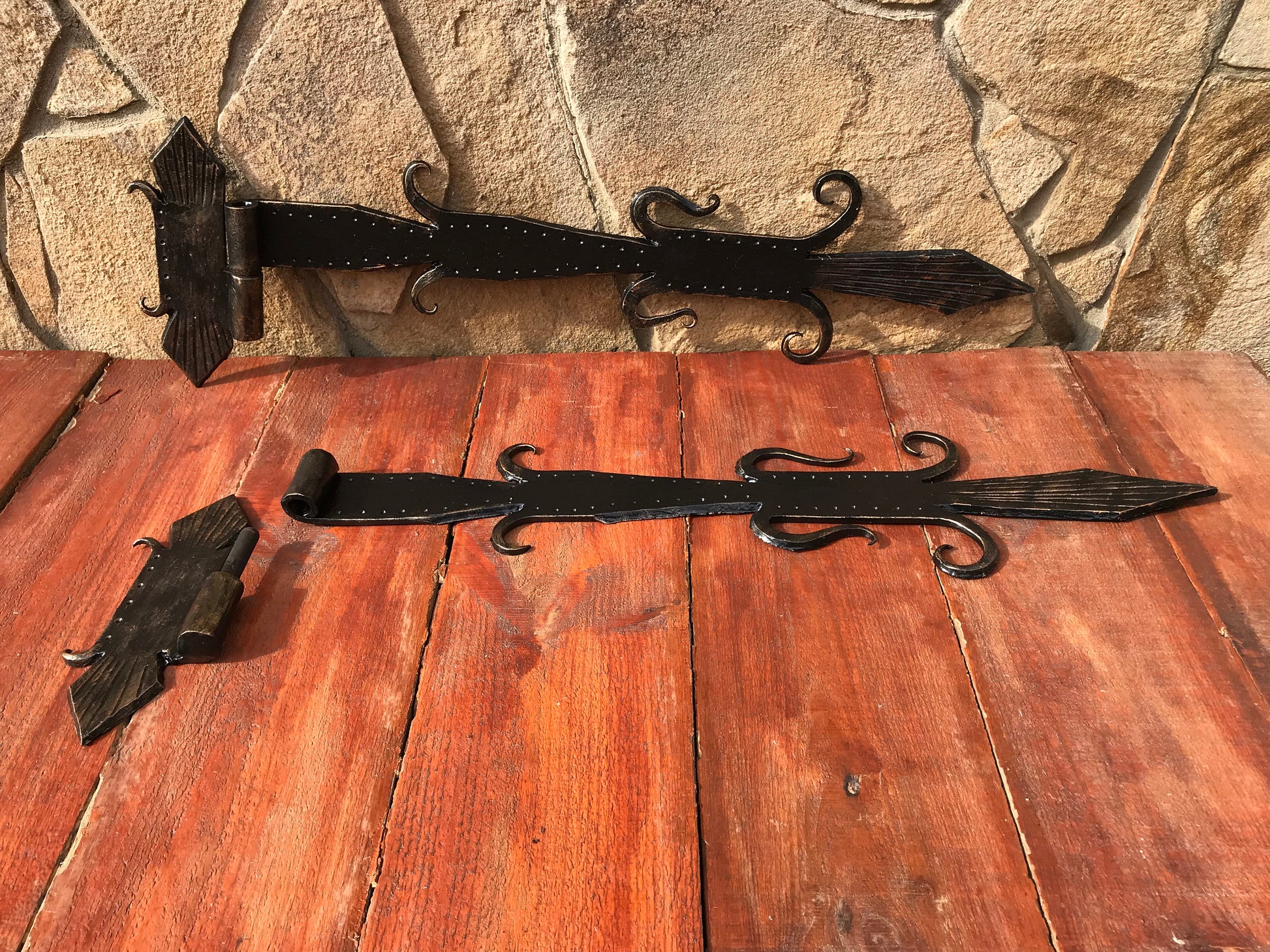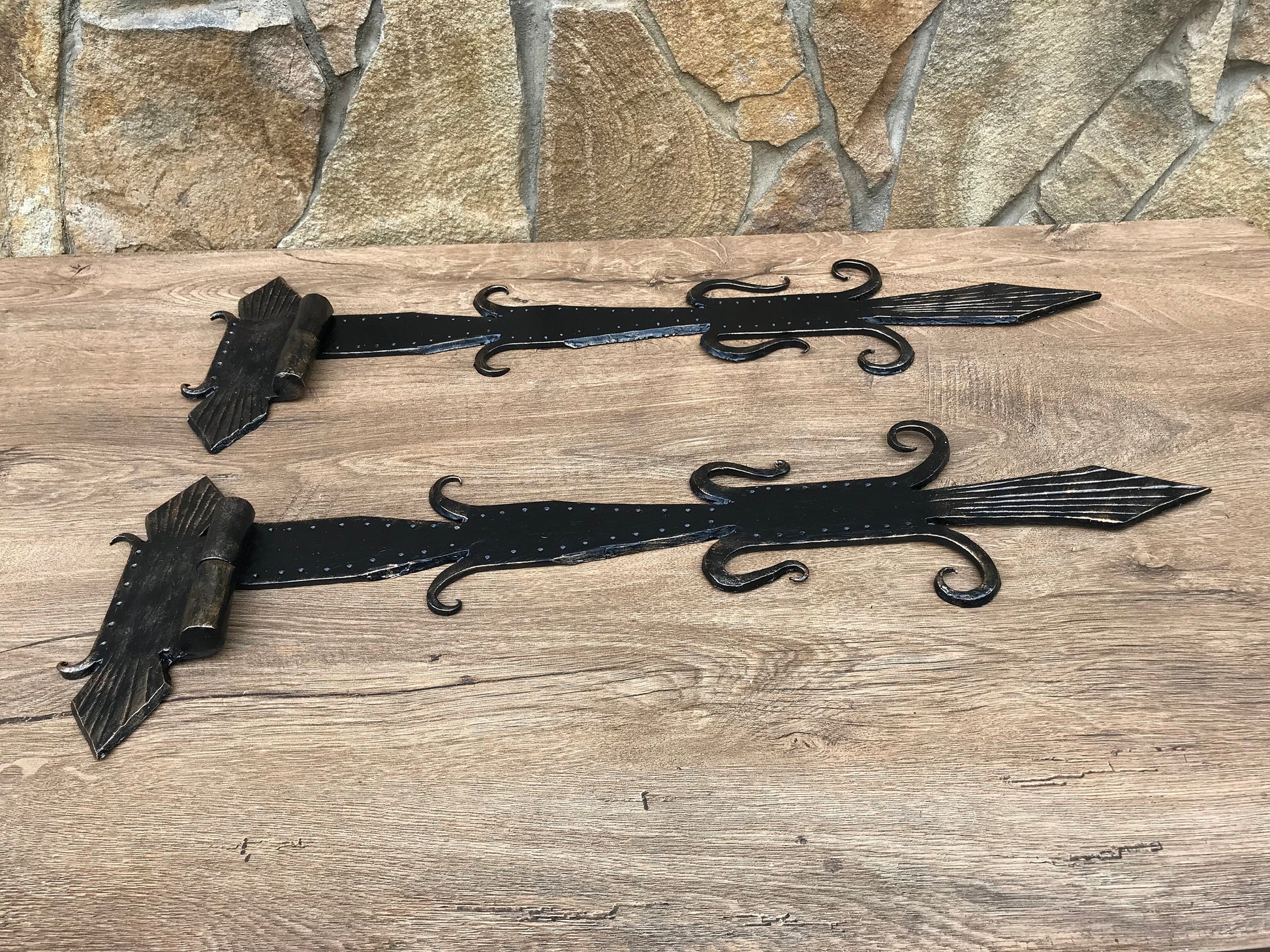 Here is a set of two gate hinges made in the technique of the artistic forging. The hinges on the listing photos are left side hinges. Please specify in the line "Note to seller" while checking out whether you need a pair of left side hinges or a pair of right side hinges.
