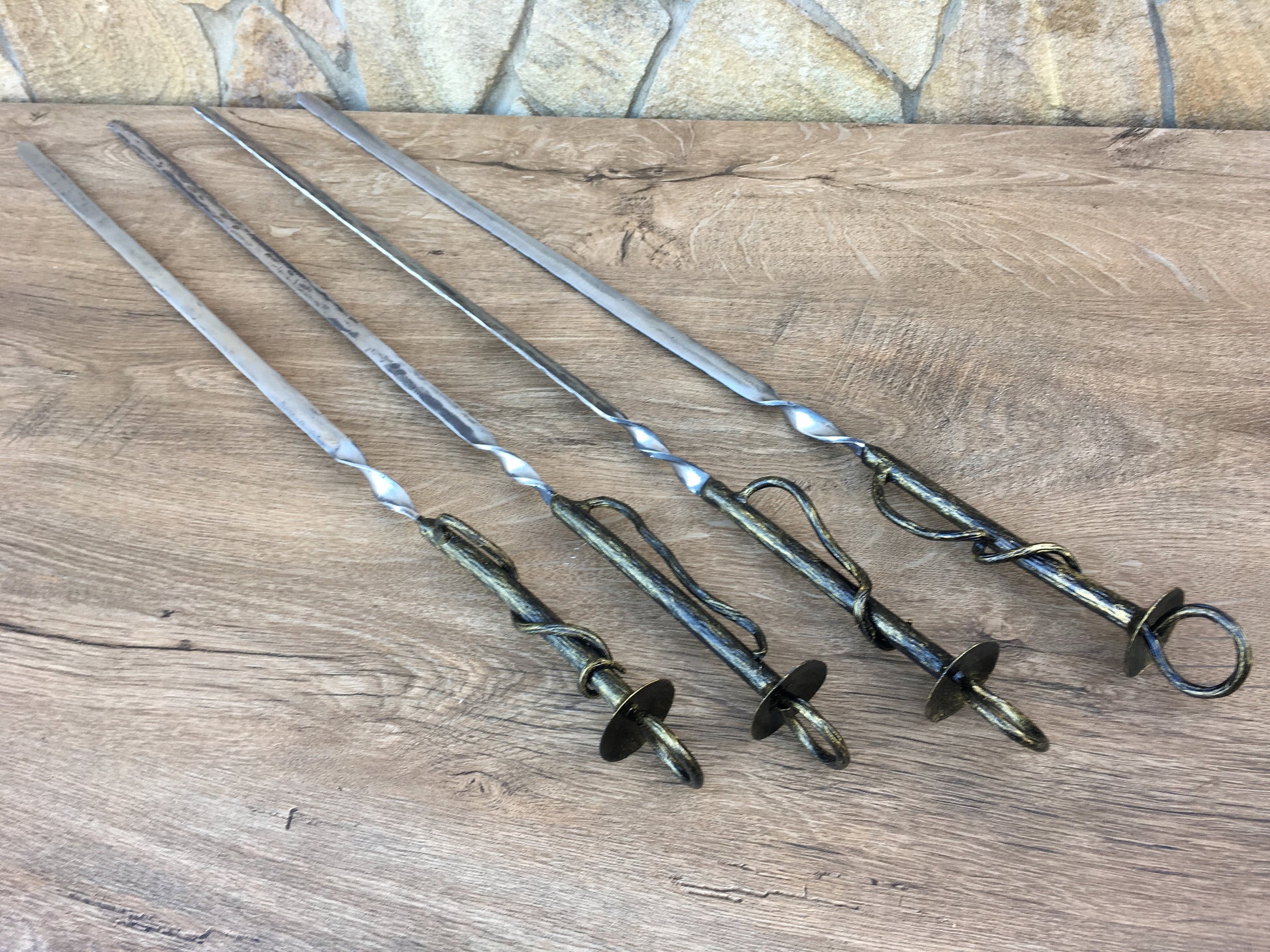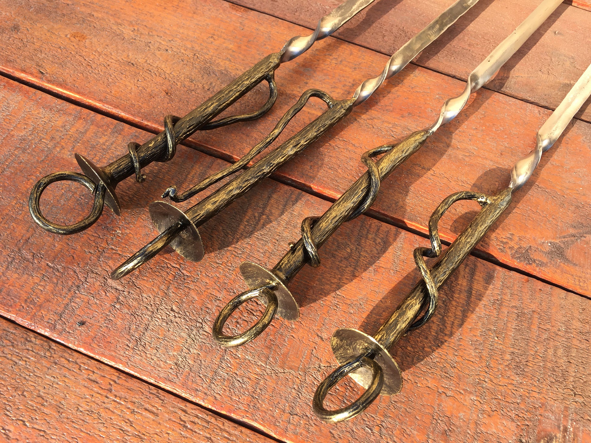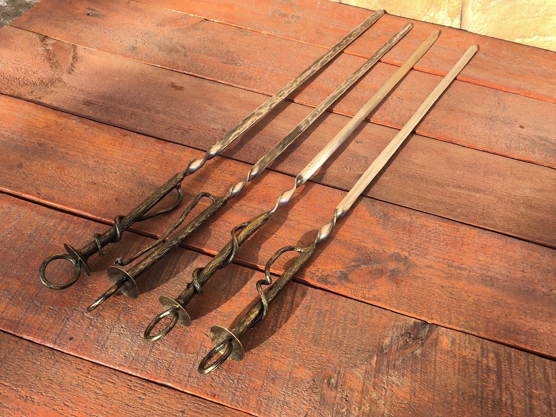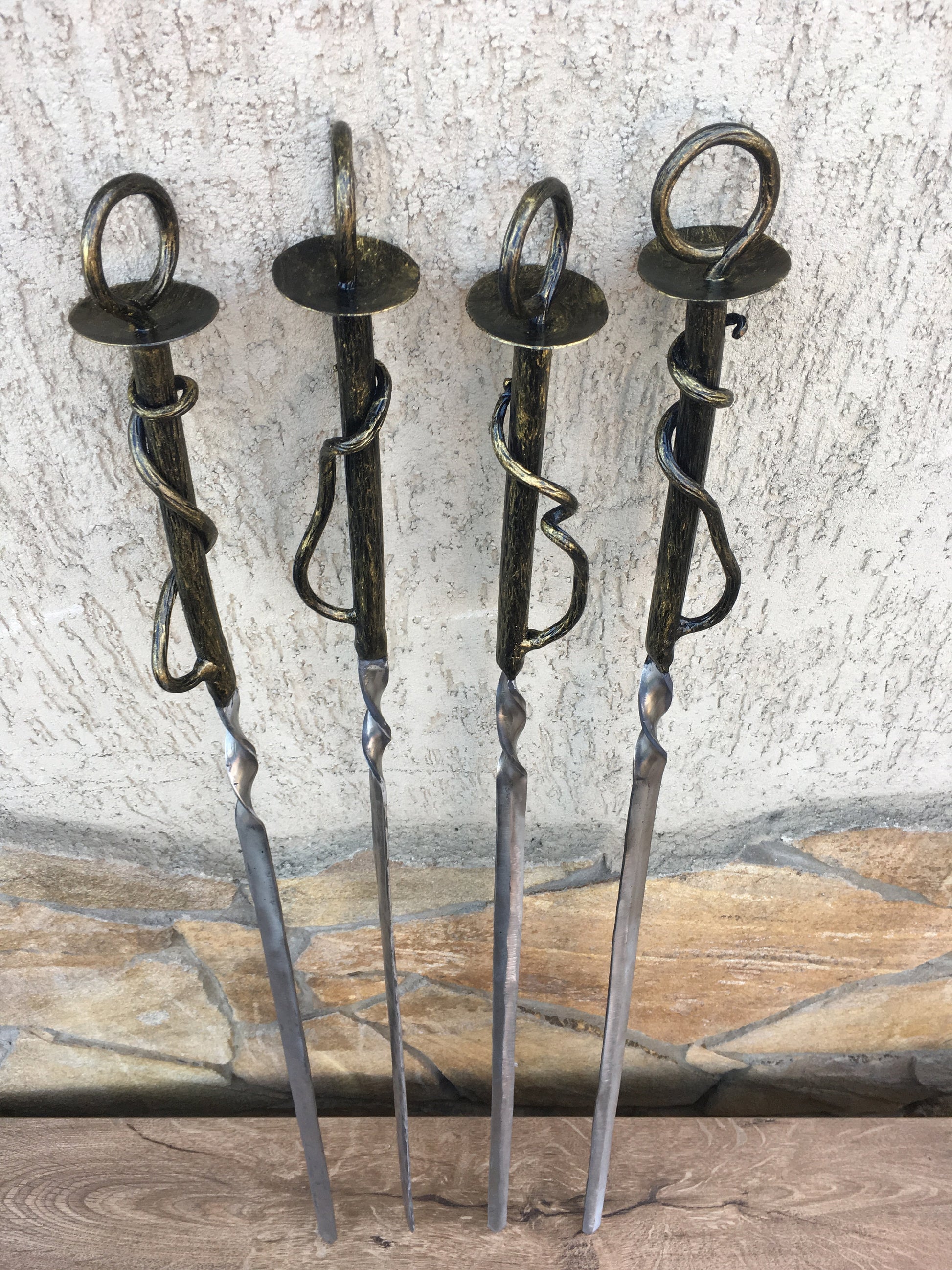 Grill accessories can be not only usual skewers but a masterpiece which decorates your house and outlines your interior features. Here is a hand forged set of 4 skewers (stainless steel blades).