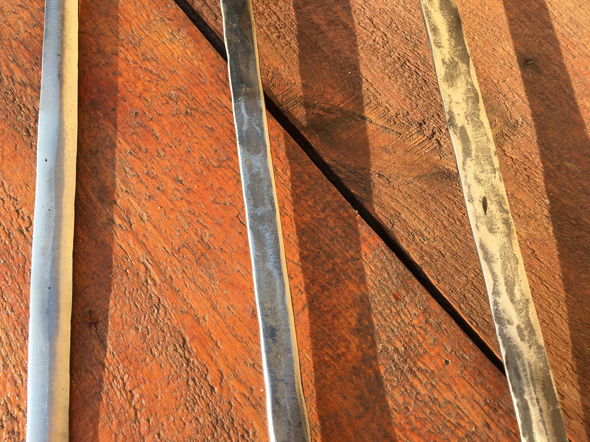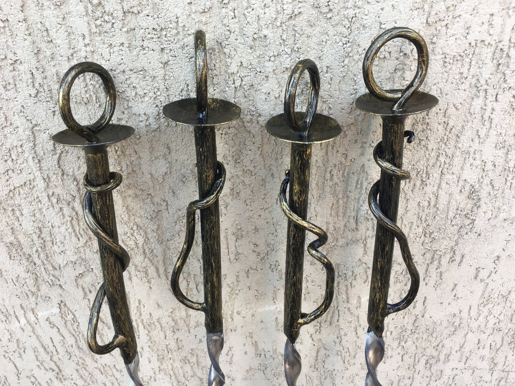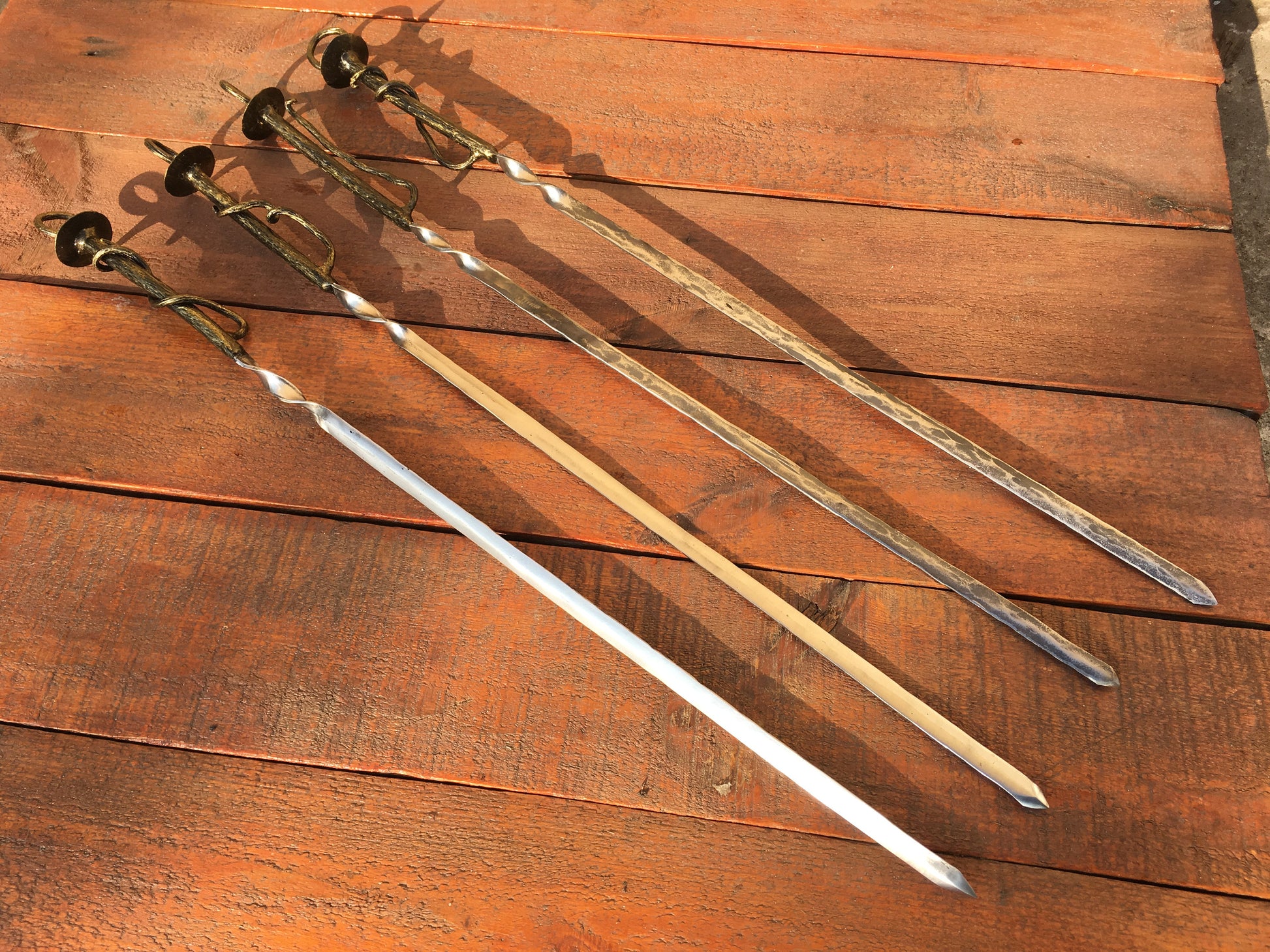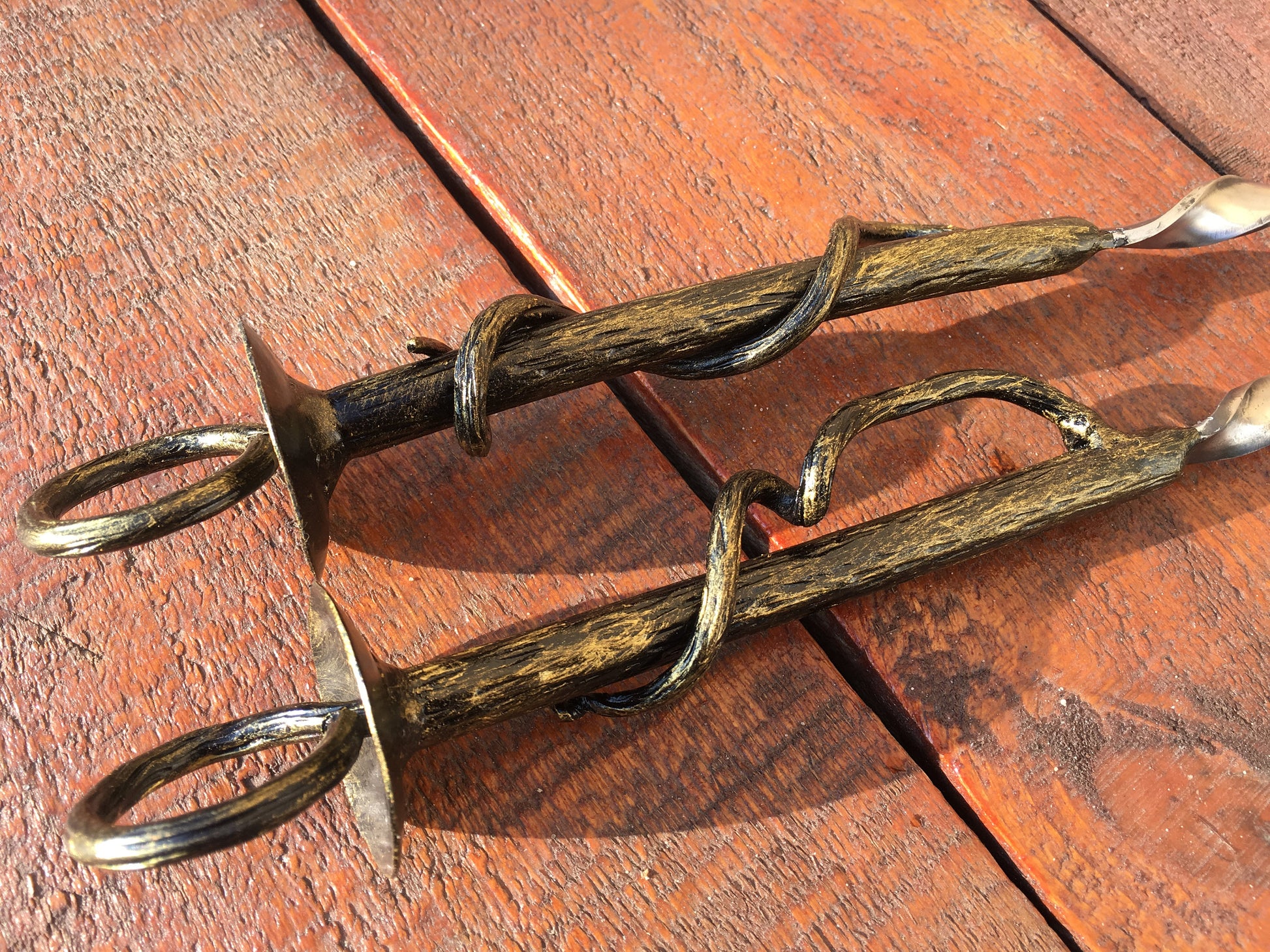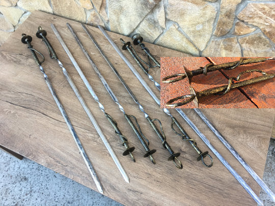 Grill accessories can be not only usual skewers but a masterpiece which decorates your house and outlines your interior features. Here is a hand forged set of 4 skewers (stainless steel blades).