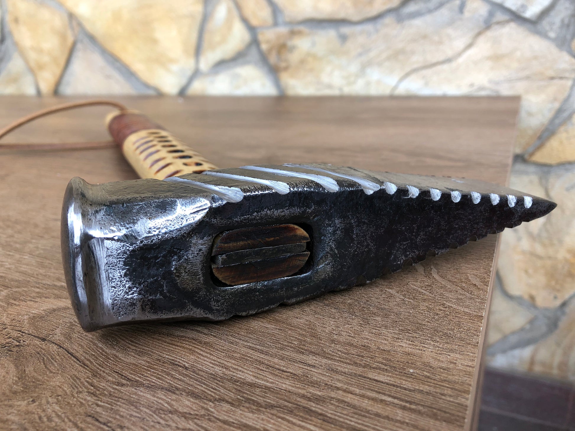 The hammer head from other side has a sharp blade (3.7 cm/ 1.46") which one can use as a small axe.